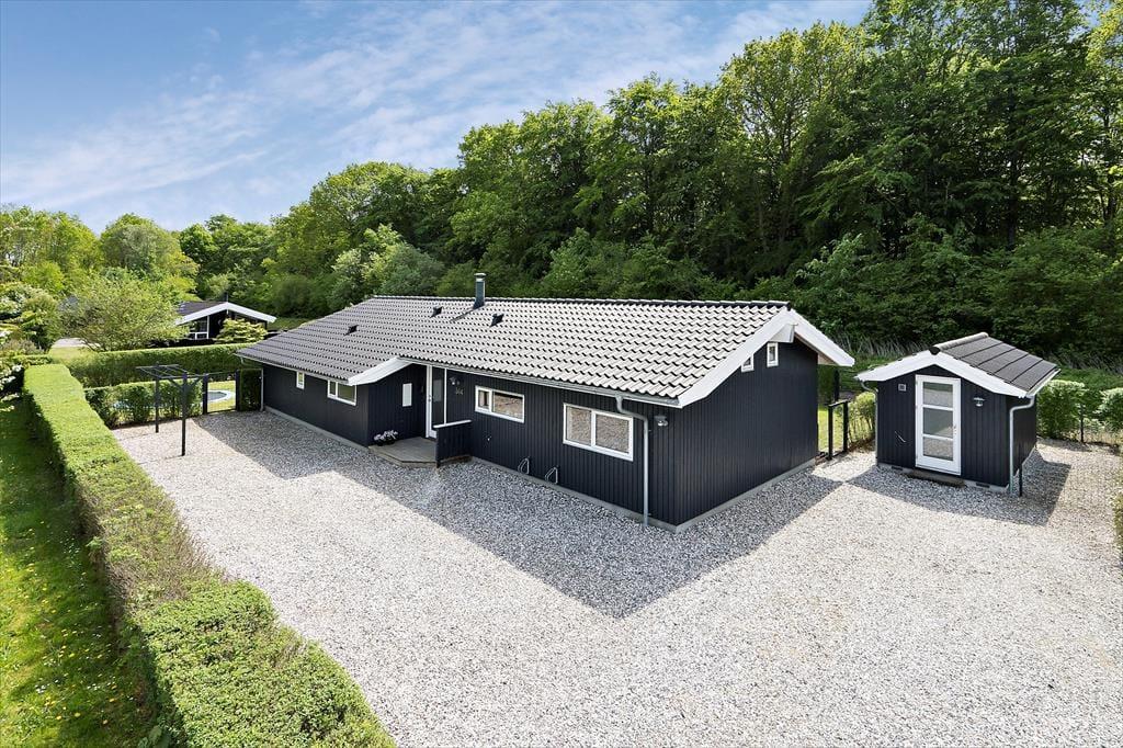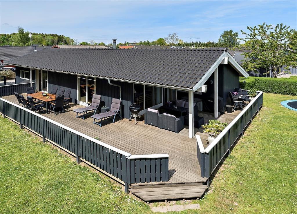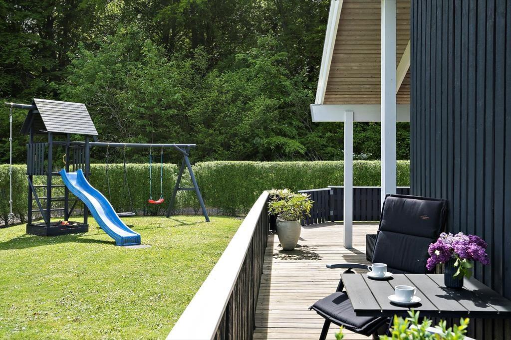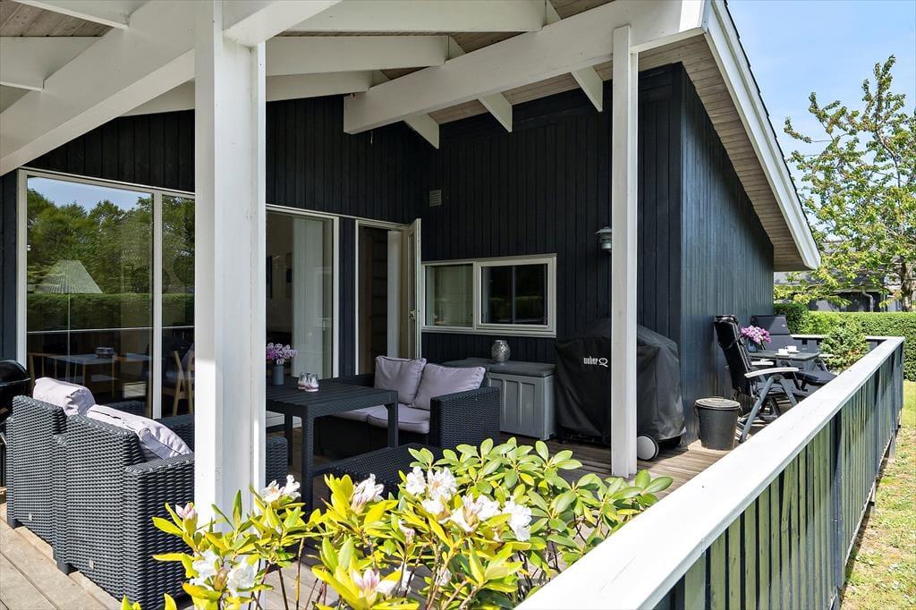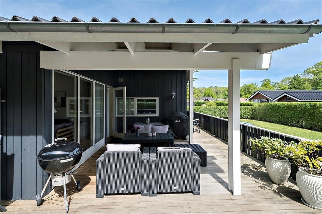 Udenfor venter en stor terrasse, hvor I kan nyde ferien fra morgen til aften. Den delvist overdækkede terrasse gør det muligt både at sidde i solen og finde skygge, alt efter behov. Haven er en sand legeplads for børnene, som kan more sig i sandkassen, på gyngen eller trampolinen, mens de voksne slapper af med en kop kaffe. Der er masser af plads til leg og aktiviteter i haven, og det giver trygge rammer for hele familien. Her kan I tilberede sommerens måltider på grillen, nyde roen i liggestolene og lade tiden gå lidt langsommere end derhjemme. Terrassen og haven bliver hurtigt familiens naturlige samlingssted, hvor hyggen fylder lige så meget som solen.