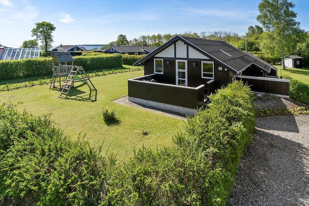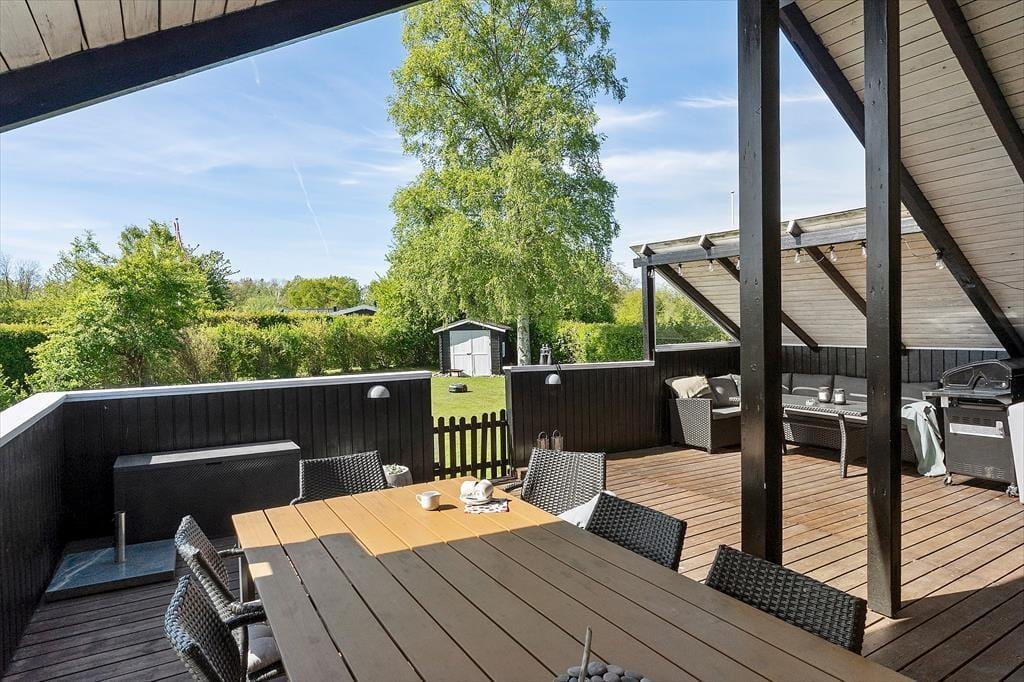 Huset ligger i dejligt roligt sommerhusområde – knap hundrede meter fra vandet og badebro. Er omkranset af pæn stor plæne med plads til leg og boldspil og en lille hæk. Dejlig stor delvis overdækket træterrasse med læ i den ene ende af huset samt ligeledes træterrasse ved indgang til huset i den anden ende. Der er grill og havemøbler til fri afbenyttelse.