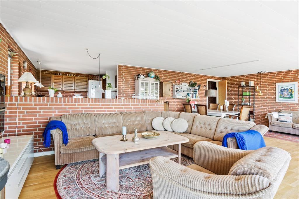 Husets centrale rum er en stor stue, hvor sofahjørnet indbyder til hygge med hele familien i de bløde møbler. Samtidig er der god sammenhæng med køkkenet og spisebordet, hvor der er god plads til, at alle kan opholde sig og tilberede og selvfølgelig nyde dagens måltider.