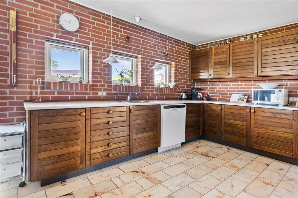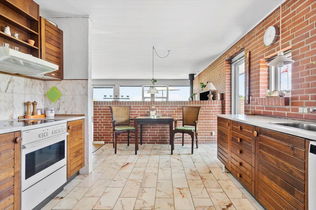 Køkkenet er i direkte forbindelse med stuen/alrummet, hvor en halvmur gør det muligt at lave mad og samtidig deltage i snakken ved spisebordet. Køkkenet har gode faciliteter, og alt hvad du skal bruge til feriens måltider. Her er blandt andet komfur, køle/fryseskab, kaffemaskine og opvaskemaskine.