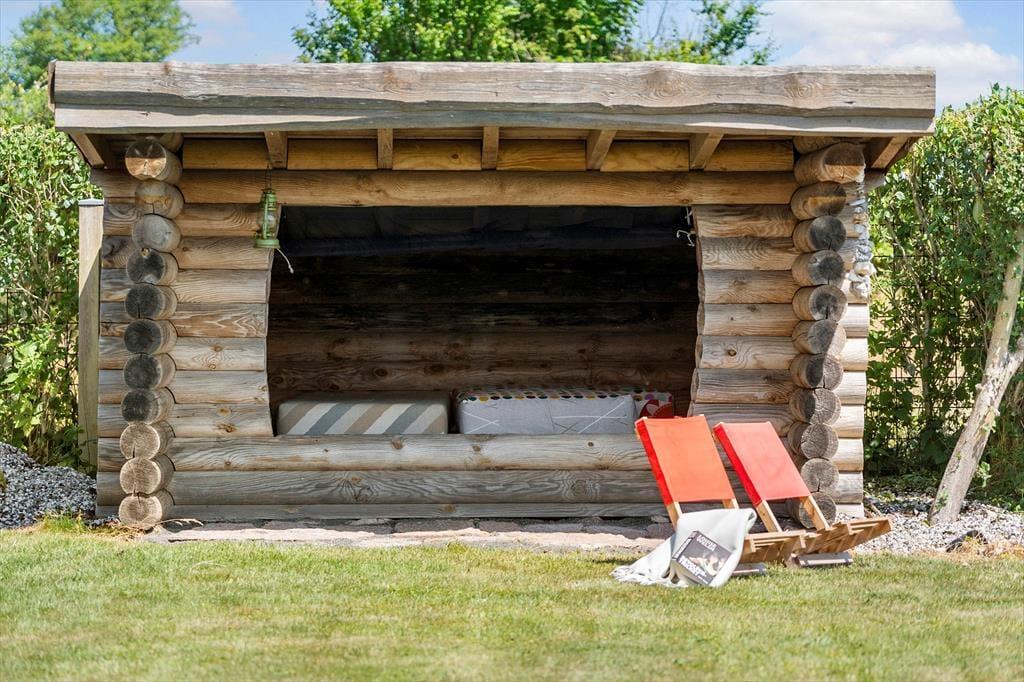 Terrassen er hyggeligt indrammet af buske, stakit og krukker, så den gode udsigt kan nydes i den velholdte have. Her er også lavet et hyggeligt træshelter, der står fint afskærmet af buske, men samtidig med den fantastiske havudsigt, som man kan nyde i fulde drag herfra.