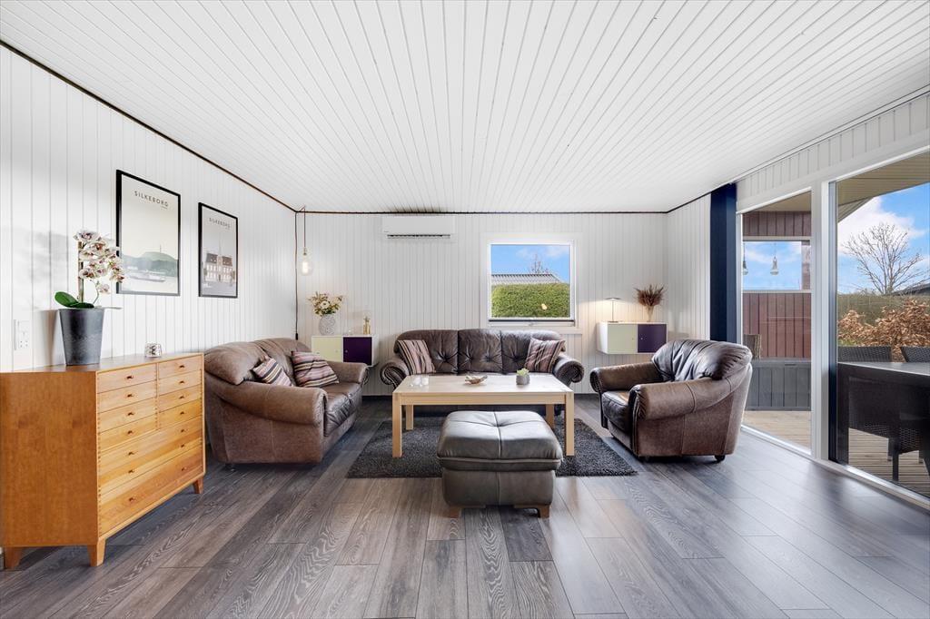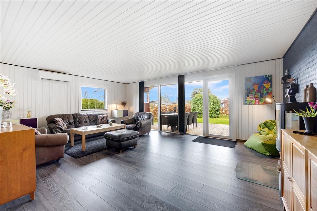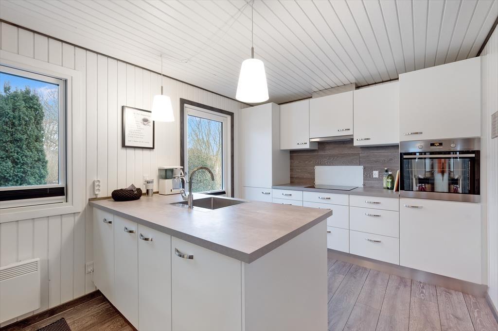 Sommerhuset er lyst og venligt med god plads. Det er moderne og har en god indretning med alle de nødvendige fornødenheder til den gode ferie. Huset har en stor og hyggelig stue, hvor der er plads til hele familien. Dertil er der en brændeovn, der skaber varme og god stemning på de kølige aftner. I forlængelsen af stuen er der et stort alrum med et stort spisebord, hvor alle kan indtage deres måltider samme. Det åbne, lyse køkken, der vender ud mod stuen, gør, at alle kan være sammen; om man laver mad, spiser, spiller spil el.lign.