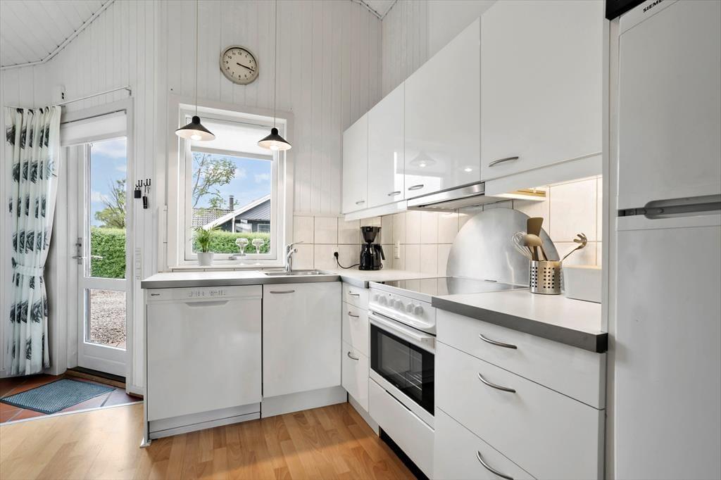 Sommerhusets åbne køkken er fuldt udstyret og klar til at imødekomme dine kulinariske eventyr. Det åbne design skaber en behagelig forbindelse mellem madlavning og samvær, så du kan deltage i samtaler med familien eller venner, mens du tilbereder lækker mad.