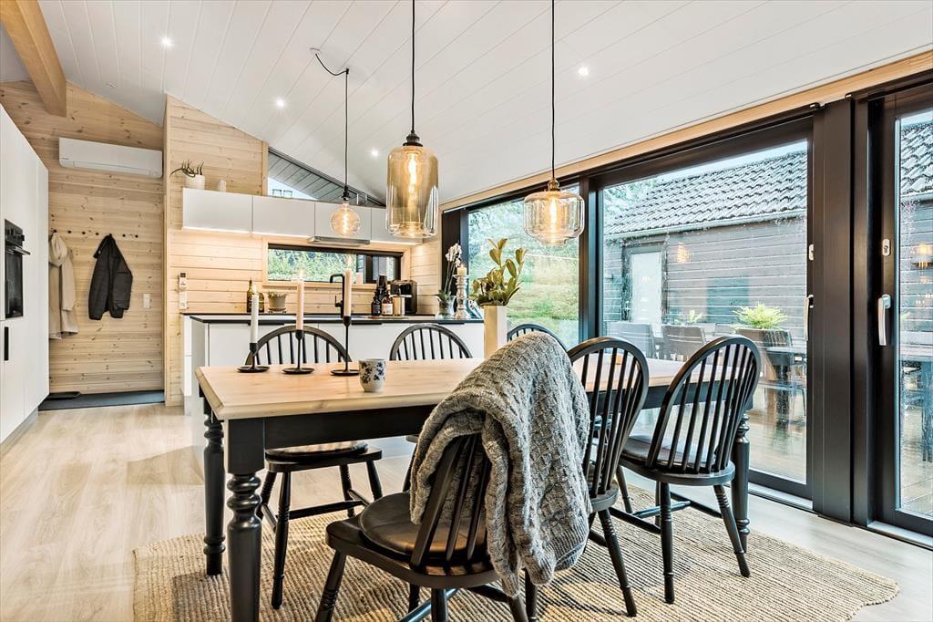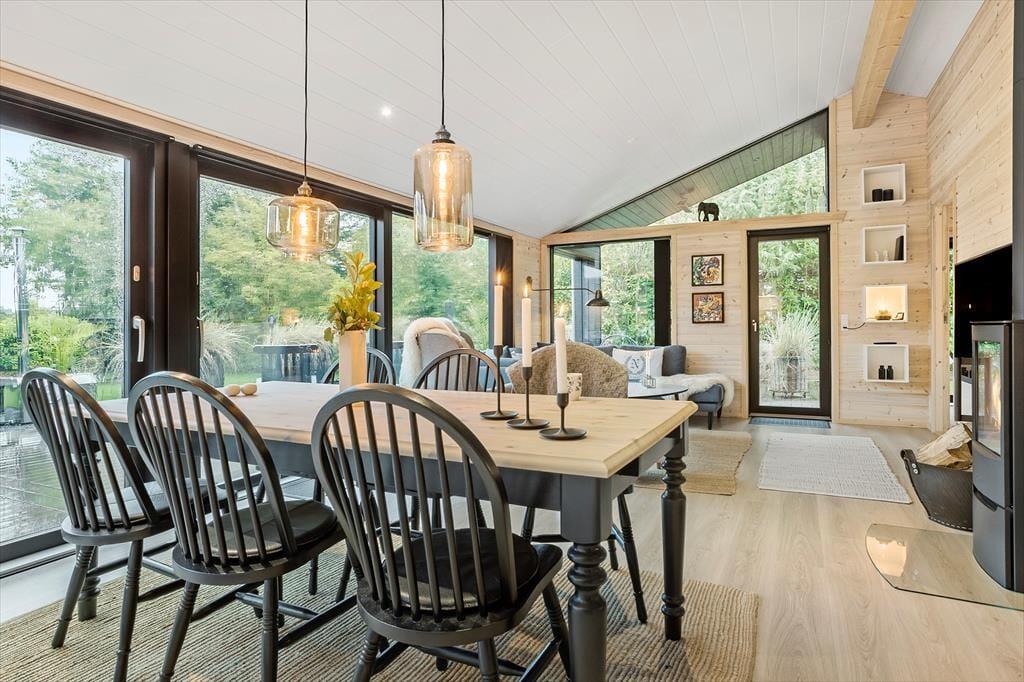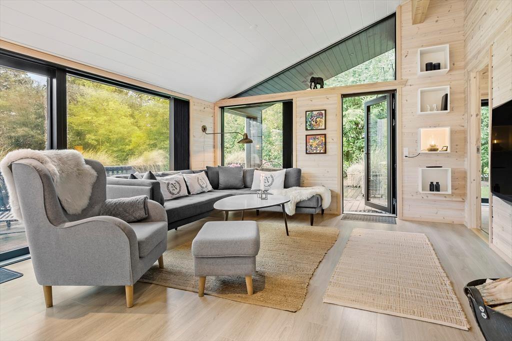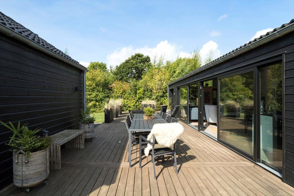 Husets store facade vinduer kan åbnes op så du har direkte adgang til den store træterrasse.