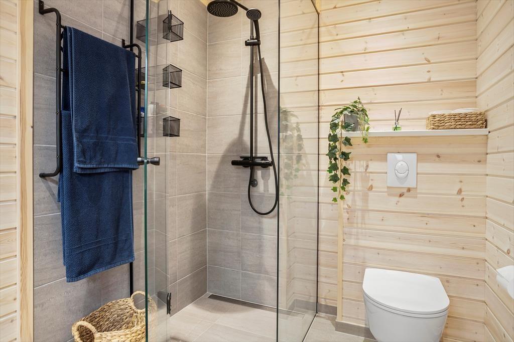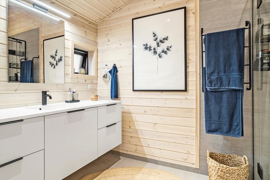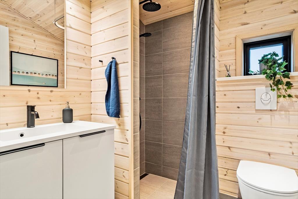 Sommerhuset har to gode badeværelser, begge med toilet og bruser. På det ene badeværelse finder I også en vaskemaskine samt tørretumler.
