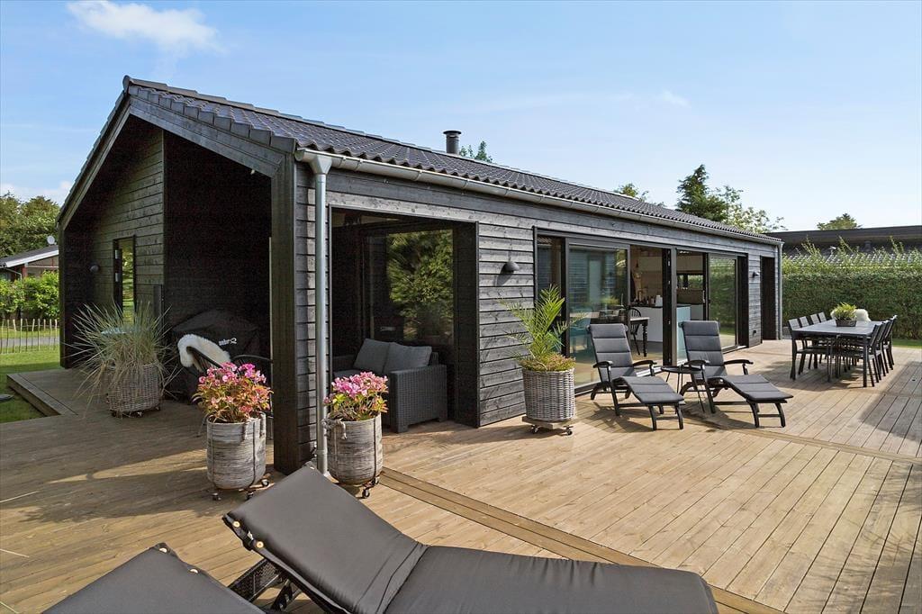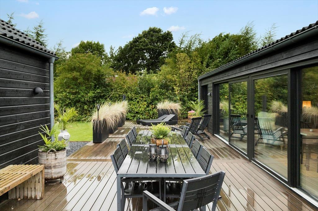Træterrassen som er husets største omdrejningspunkt, er virkelig hyggeligt indrettet med havemøbler og liggestole samt plantekasser og krukker der skaber en intim og privat stemning, og hvor der er god plads til at samle familie og venner"