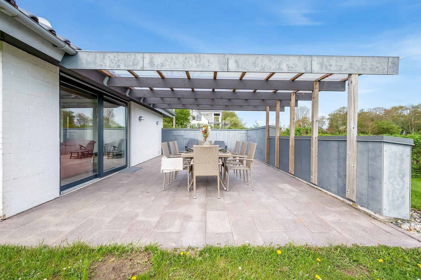 Sommerhuset er beliggende på en dejlig grund og med en overskuelig have. Der findes et dejligt, delvist overdækket terrasseareal - hvor det ofte er muligt at finde et hjørne i læ for vinden, og hvor du kan nyde solen og sidde med et glas vin eller en kop kaffe og slappe af i de fredelige og naturskønne omgivelser.