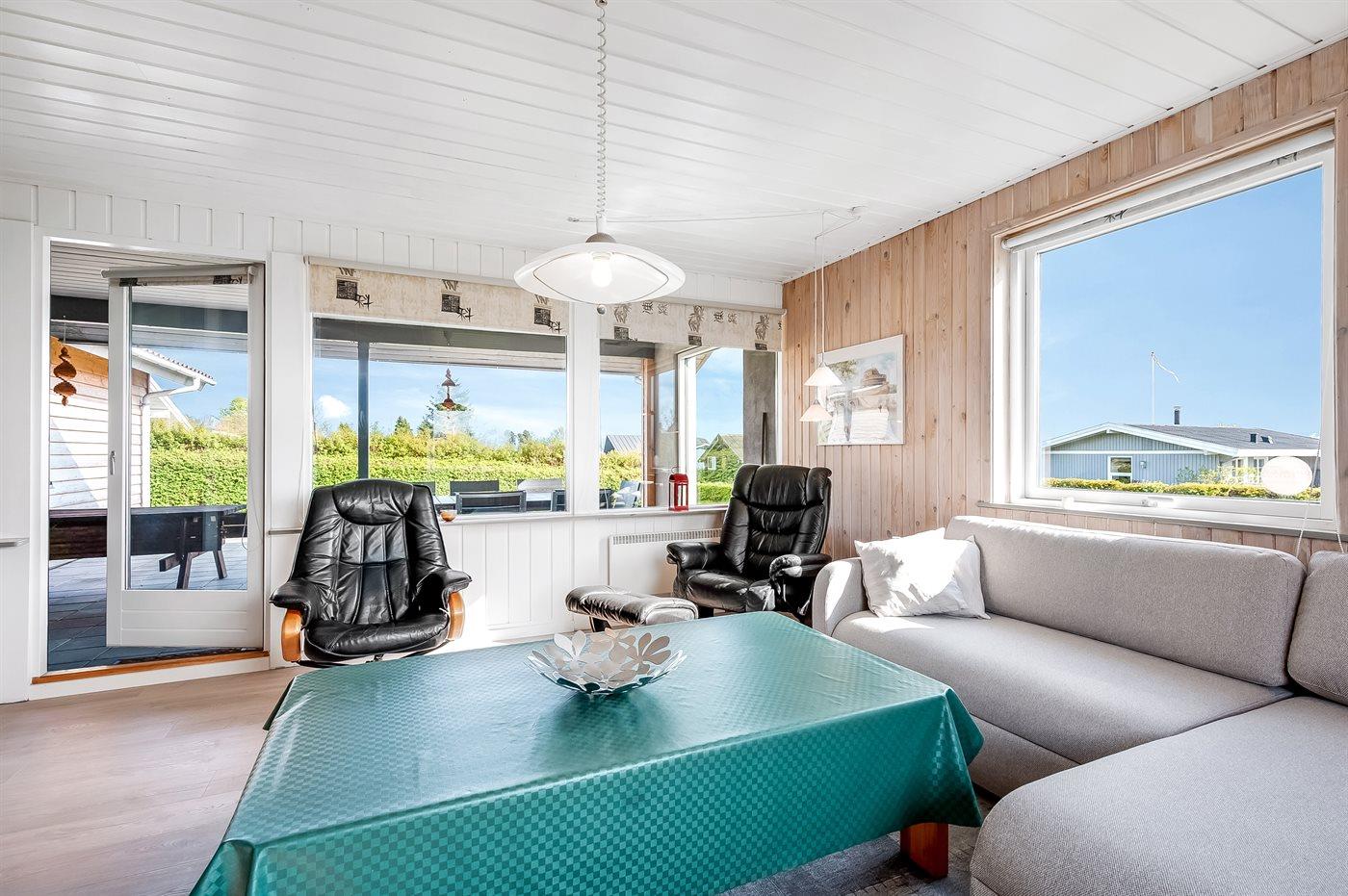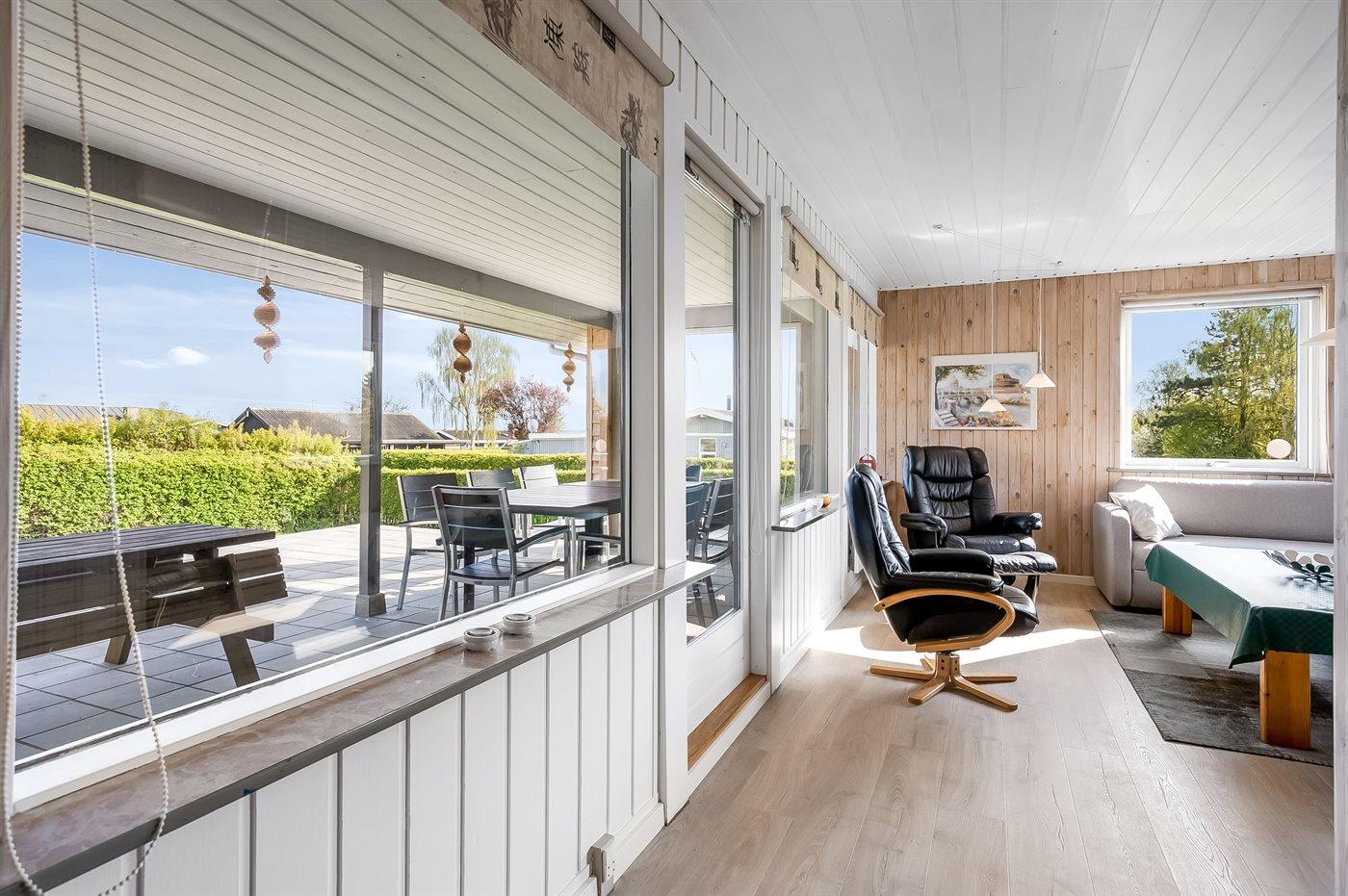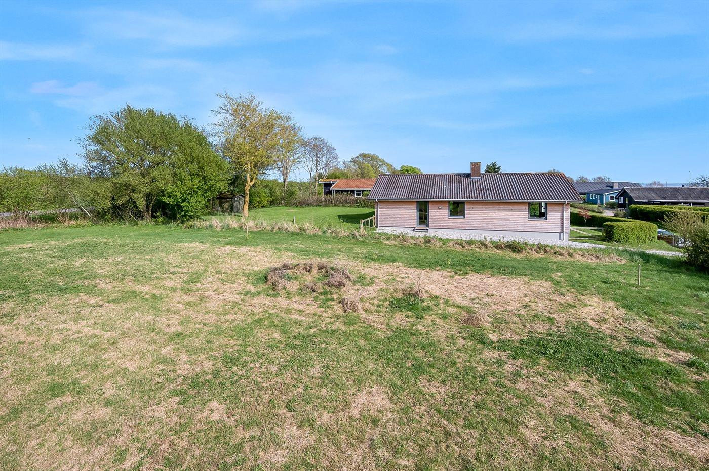 Sommerhuset er beliggende på en dejlig grund og med en overskuelig have. Der findes et dejligt, delvist overdækket terrasseareal - hvor det ofte er muligt at finde et hjørne i læ for vinden, og hvor du kan nyde solen og sidde med et glas vin eller en kop kaffe og slappe af i de fredelige og naturskønne omgivelser.