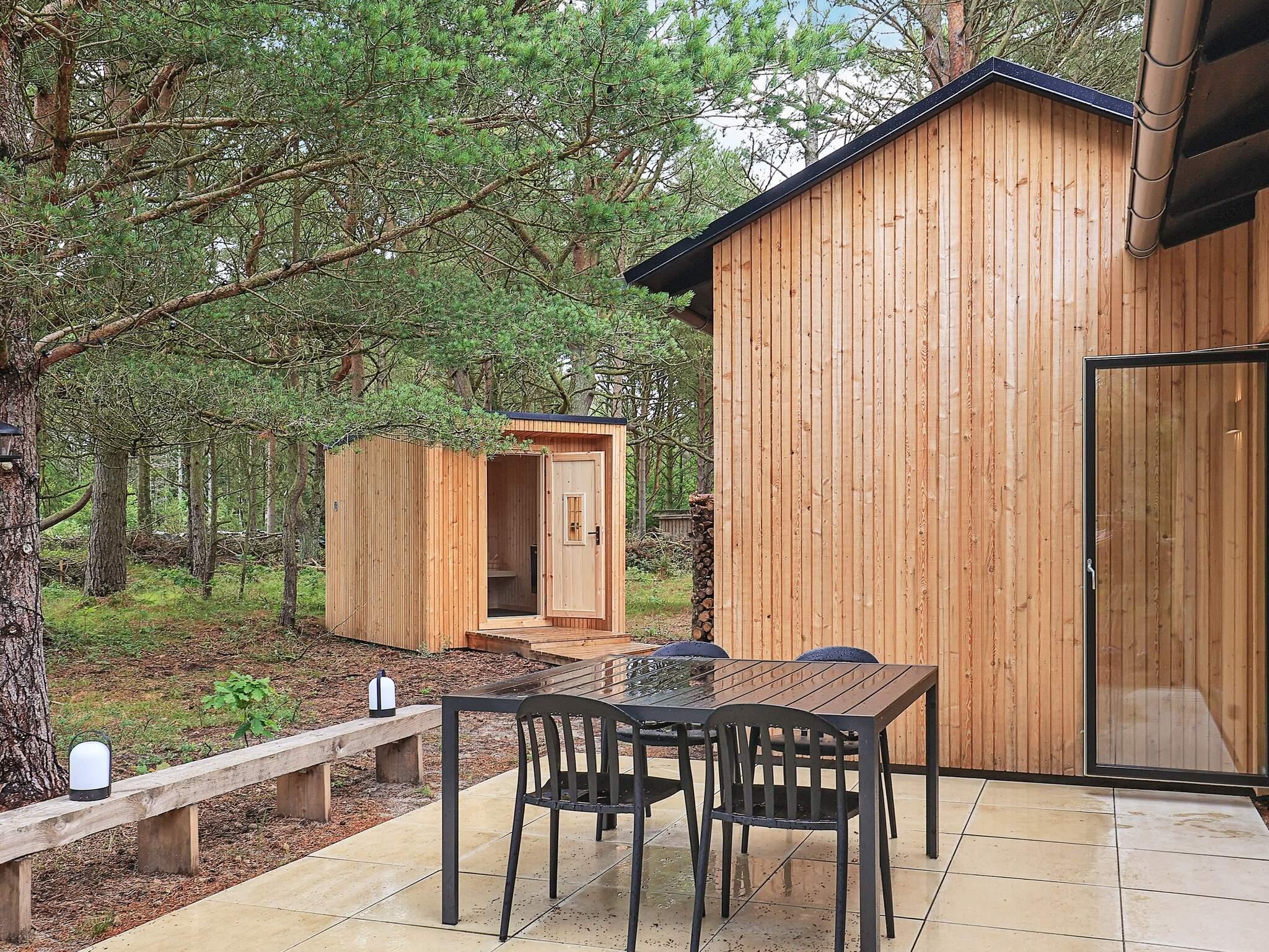 skyl under den udendørs bruser, er det tid til at slappe af i den rummelige sauna, hvor du kan varme din krop op.