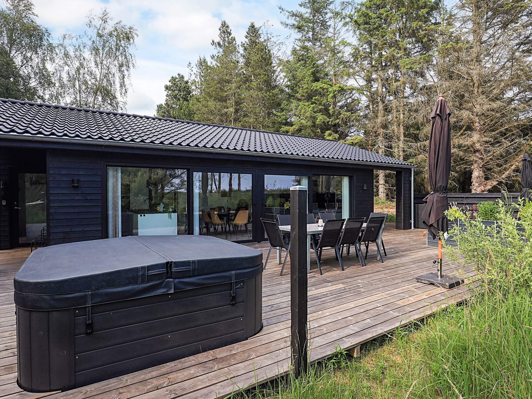 Fra den sydvendte terrasse er der udsigt til det smukke landskab, hvor man kan hoppe i spabadet. Her kan både krop og sjæl blive forkælet lidt ekstra.