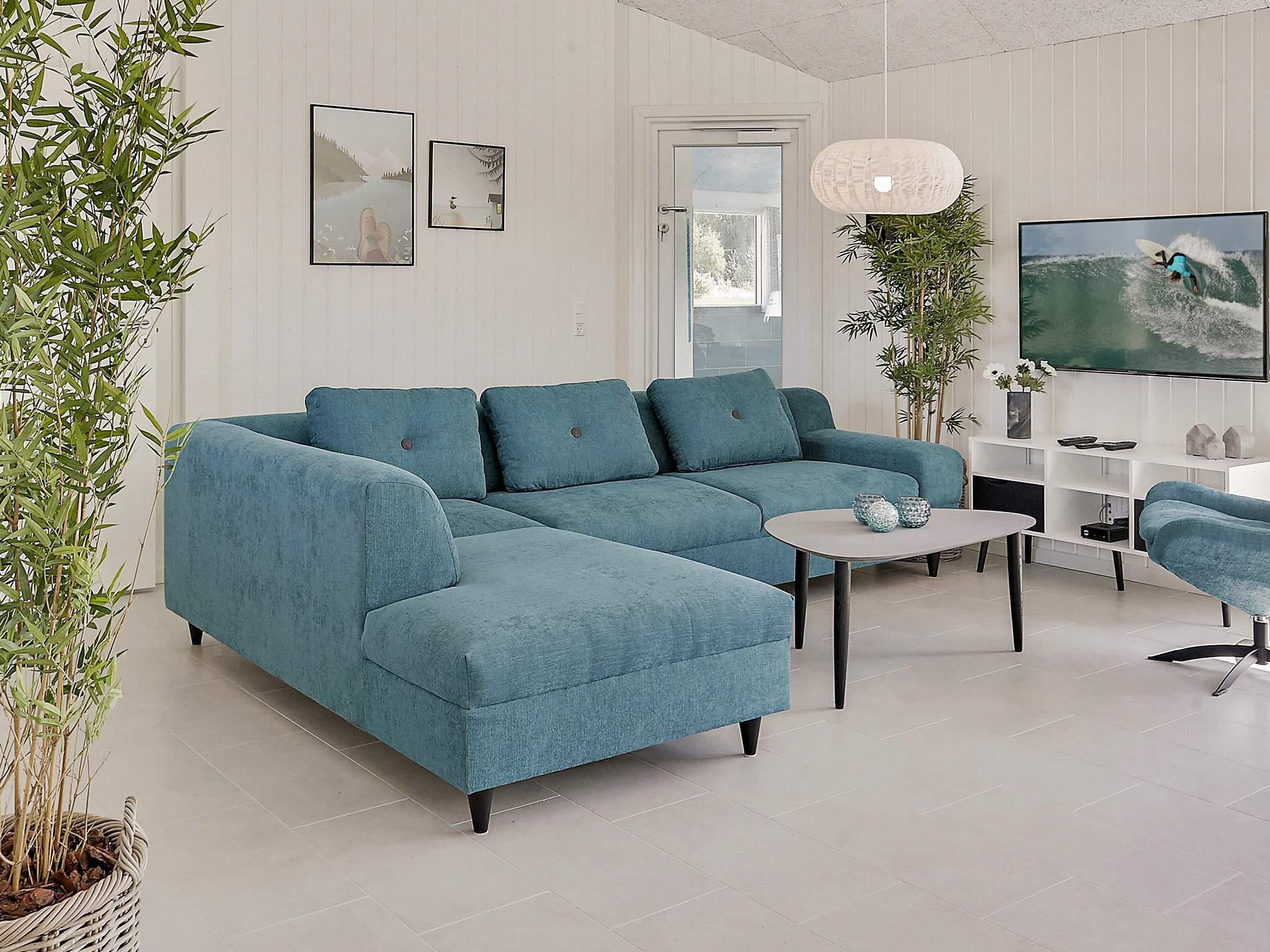 Det store opholdsrum, med udgang til terrassen, er husets naturlige samlingspunkt med sofagruppe, spisepladser og køkken. Der er DR kanaler.