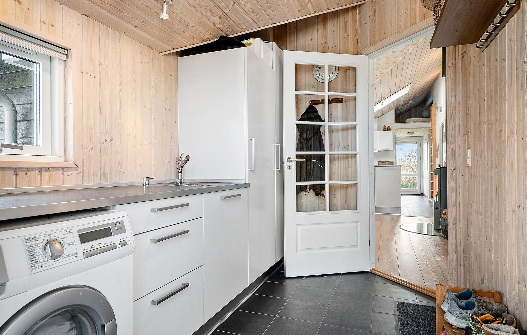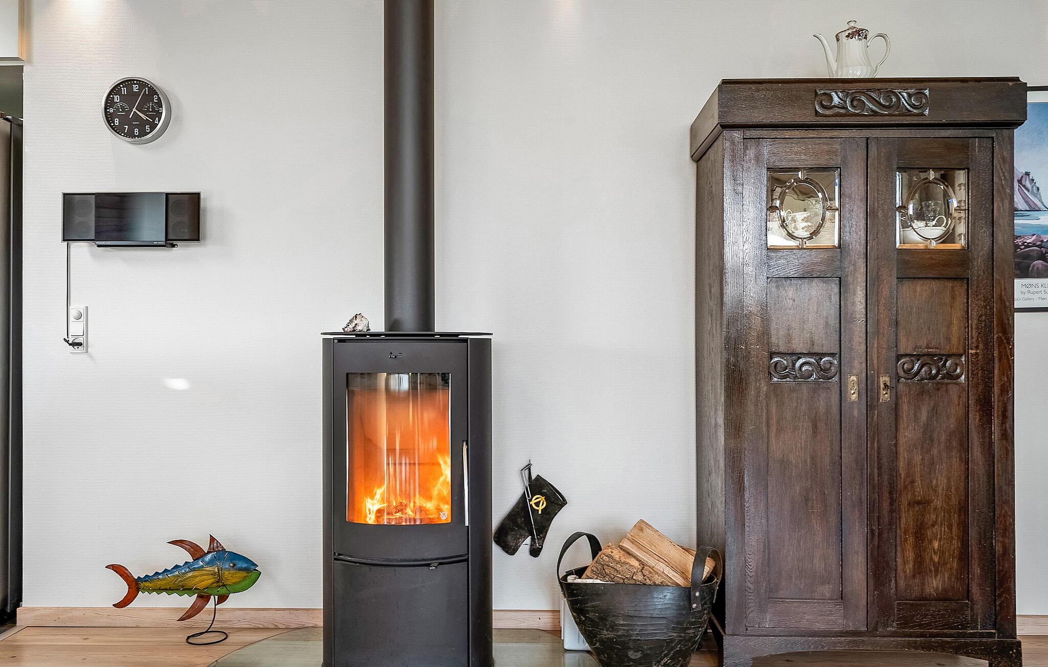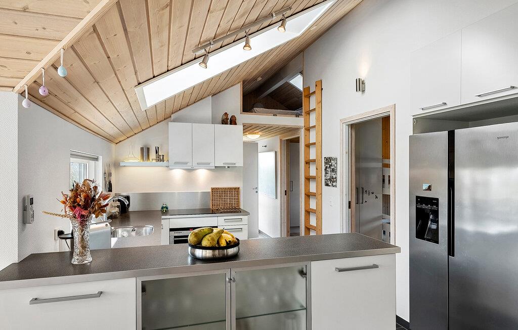 Dette feriehus forener rene linjer med en varm og indbydende atmosfære og skaber et sted, hvor hele familien kan føle sig hjemme – med både leg, afslapning og hyggelige stunder sammen. De lyse materialer, rummelige omgivelser og kærlige detaljer gør det let at falde til. Klatr op ad den lille stige til den hyggelige hems. Det elegante køkken giver god plads til fælles madlavning, mens trævæggene og brændeovnen skaber en varm stemning. De store vinduer lukker dagslyset ind i stuen. Her er der god mulighed for at læse, løse krydsord eller bare slappe af på den store sofa eller i lænestolen.