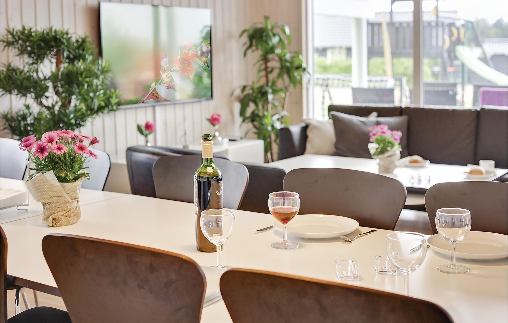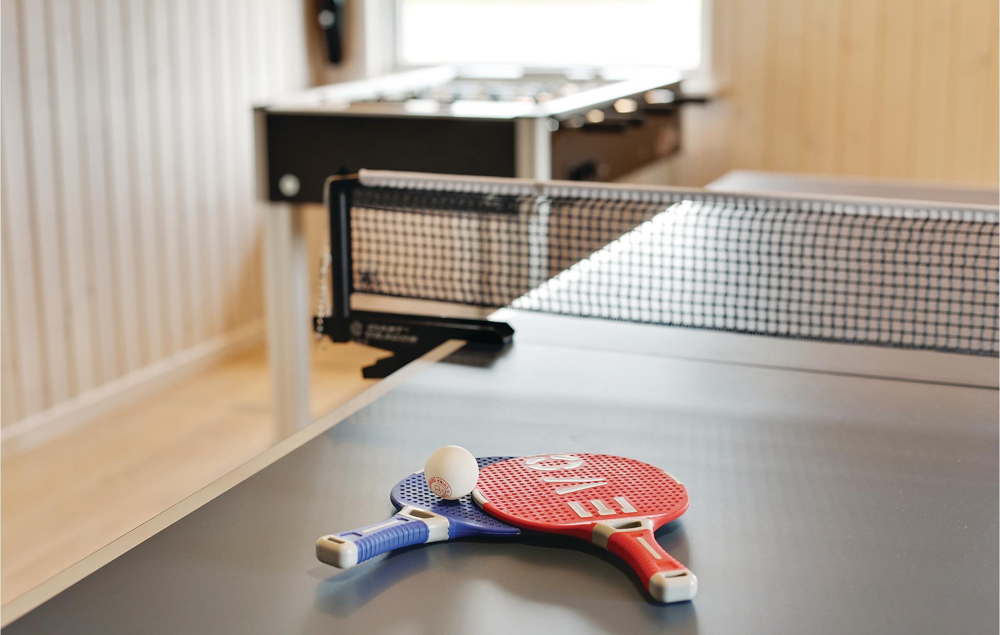 Sæt hverdagen på pause og nyd en skøn ferie for hele familien ved Hjelm Bugt. Her ligger dette rummelige feriehus, som er godt udstyret til børn og voksne, ligger i naturskønne omgivelser og tæt ved en børnevenlig sandstrand. Huset har en åben og behagelig arkitektur med store vinduer ud mod haven. Lav maden sammen i det veludstyrede køkken, dæk op på det lange spisebord og nyd udsigten til de åbne omgivelser. Find jer til rette i sofahjørnet, mens ilden knitrer hyggeligt i brændeovnen. Hvis I får lyst til en hyggelig aktivitet, er der både bordtennisbord, billardbord og bordfodbold, så snup en sjov dyst efter dagens udflugter. Måske har I også godt af en dasedag i huset, for faciliteterne spænder over pool, vandrutsjebane, spabad og sauna.
