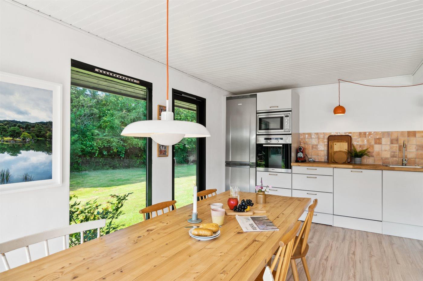 Køkkenet er udstyret med 1 køleskab. Der er 4 induktionskogeplader, varmluftovn, mikrobølgeovn samt opvaskemaskine.