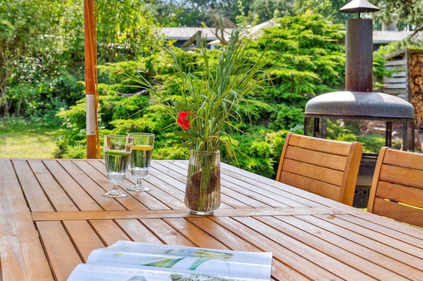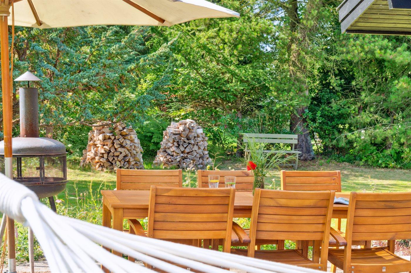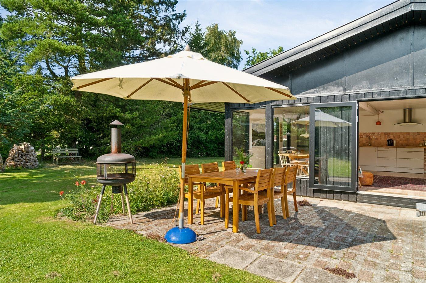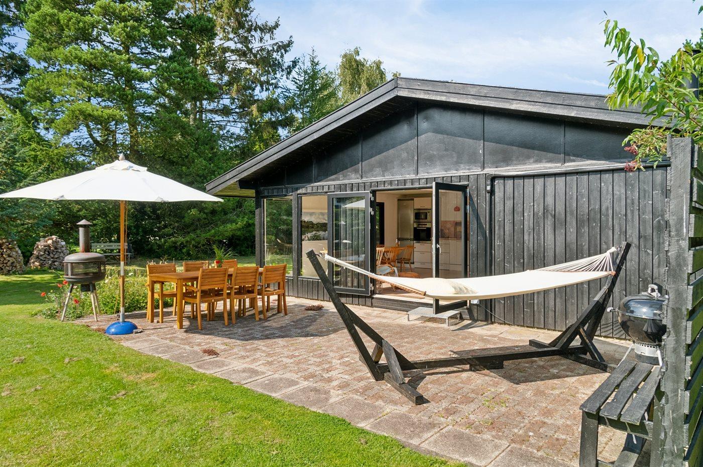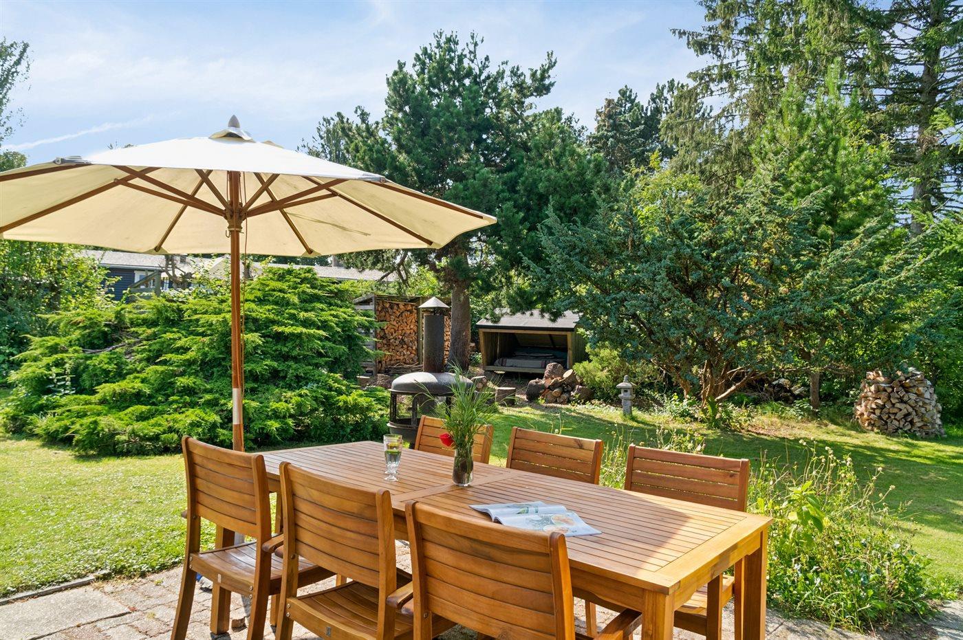 Ferieboligen er beliggende på en 1200 m² stor havegrund. Der er 1250 m til havet. Nærmeste forretning er beliggende i en afstand af 500 m. Til ferieboligen hører åbent terrasseareal. Shelter. På lune aftener sørger en udendørs pejs for hyggelig stemning. Grill til rådighed. Parkering ved ferieboligen.