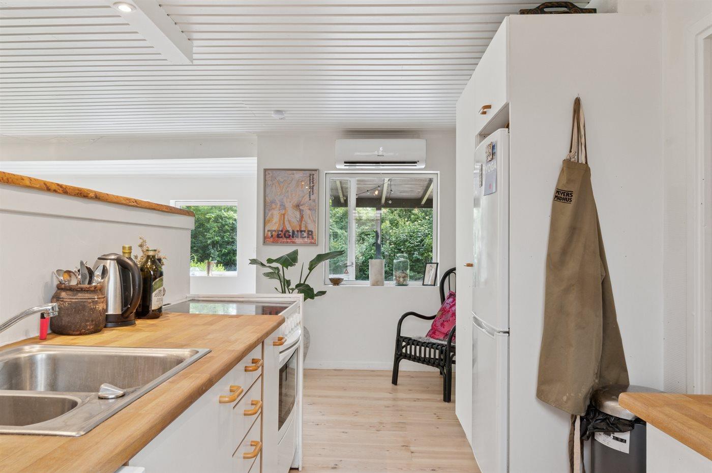 Køkkenet er udstyret med 1 køleskab. Der er 4 keramiske kogeplader, varmluftovn samt opvaskemaskine.