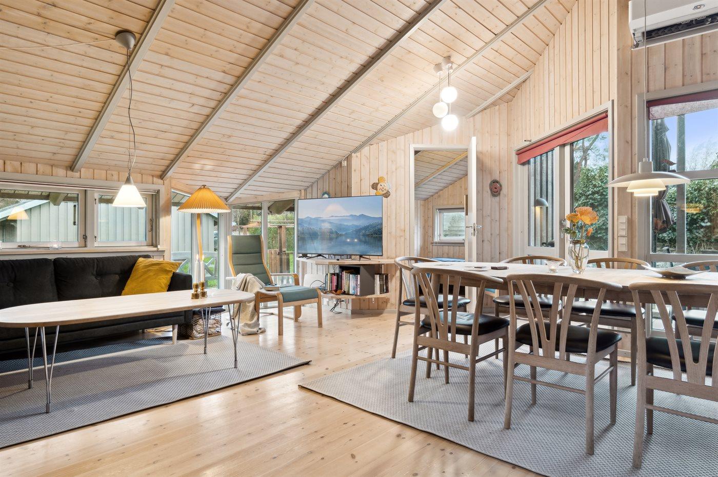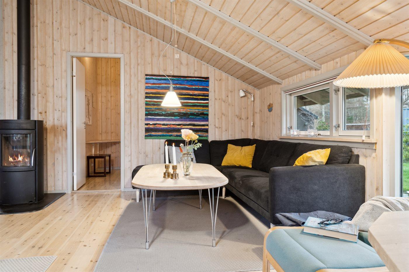 Dette sommerhus har køkken/alrum og stue med brændeovn. Fire soveværelser, 2 med dobbeltsenge og 2 med enkelt senge. I badeværelset er der wellness med spa, sauna og bruseniche. På terrasserne kan I nyde udelivet eller slappe af i haven.
