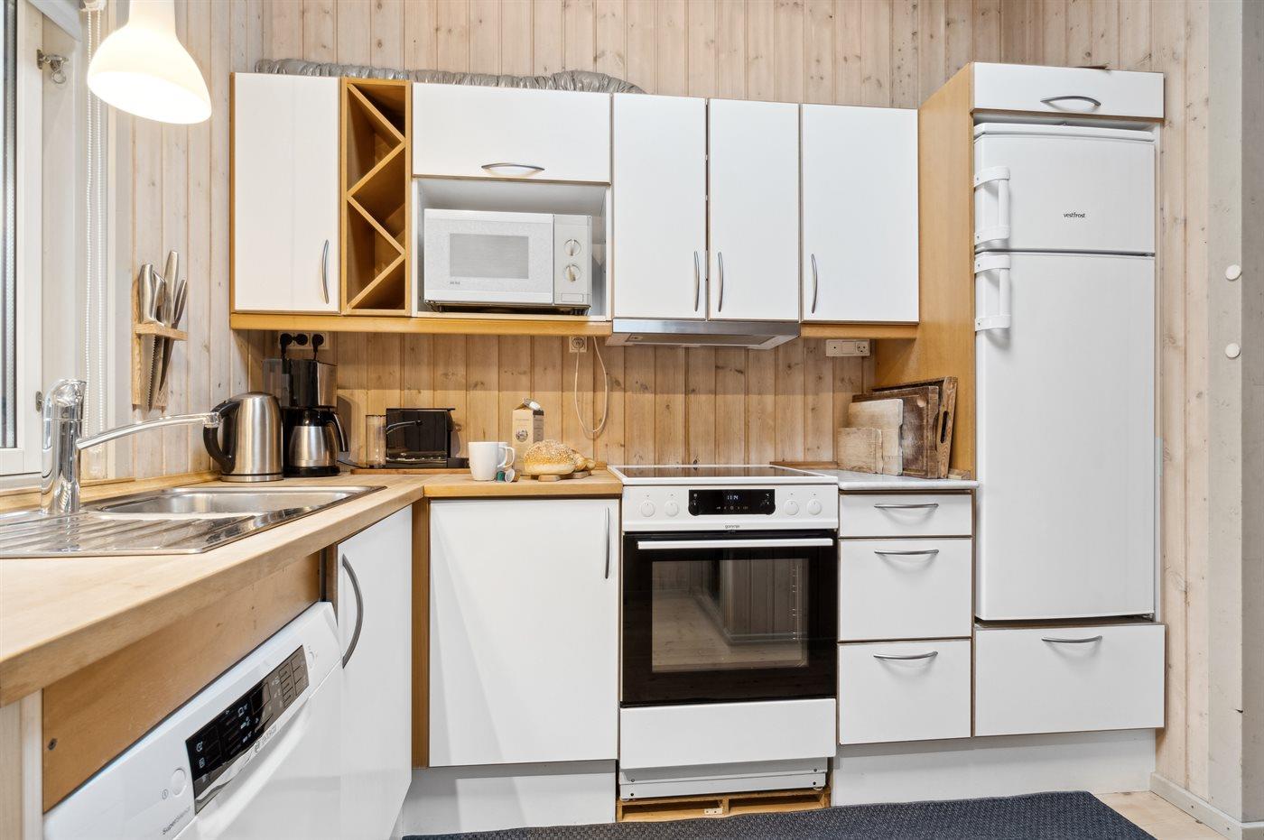 Køkkenet er udstyret med 1 køleskab. Der er 4 keramiske kogeplader, varmluftovn, mikrobølgeovn samt opvaskemaskine.