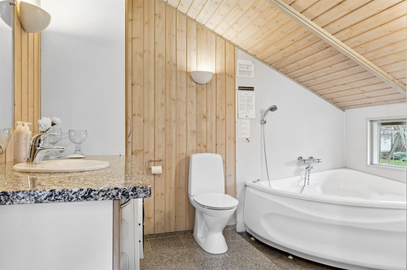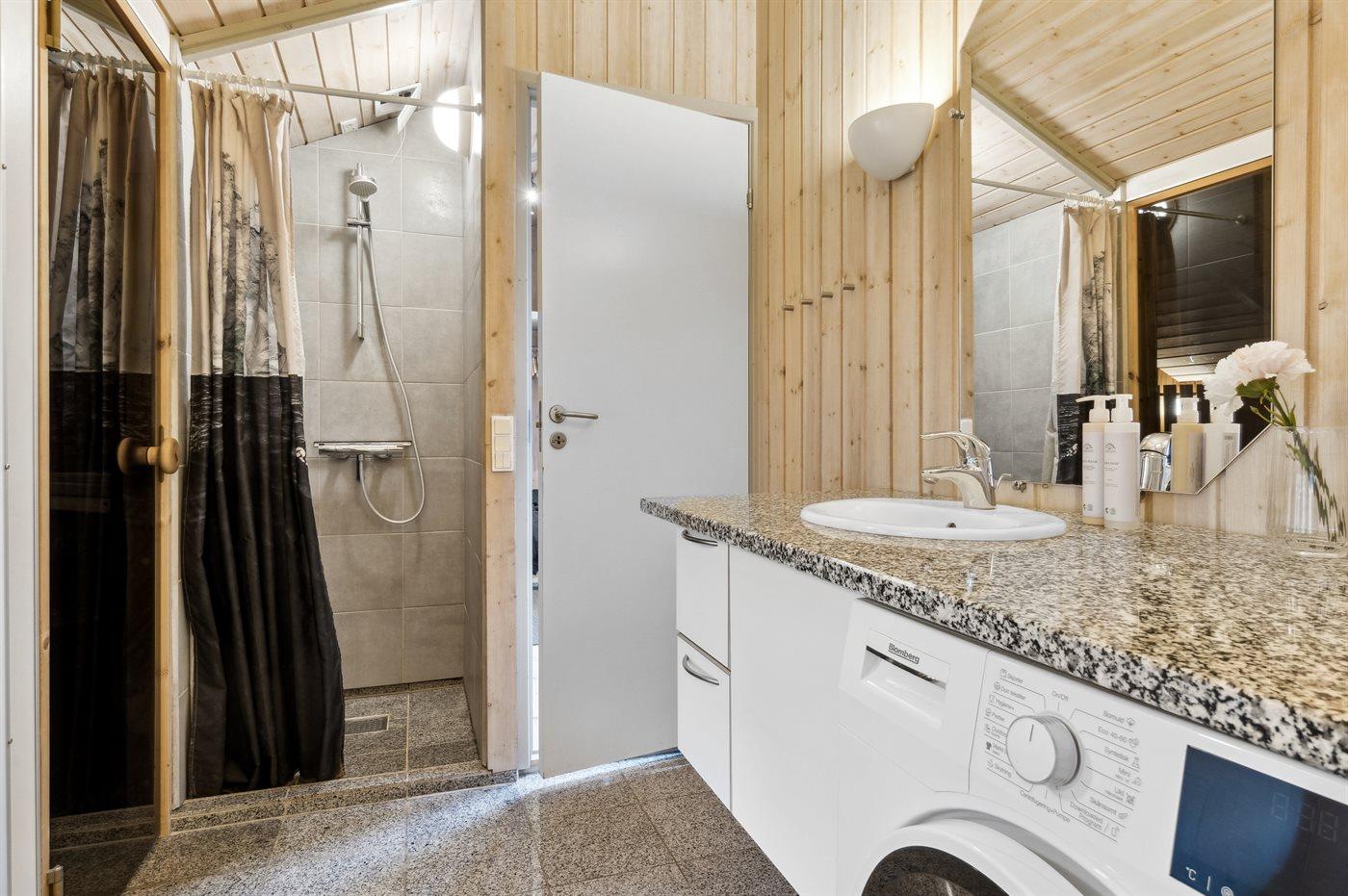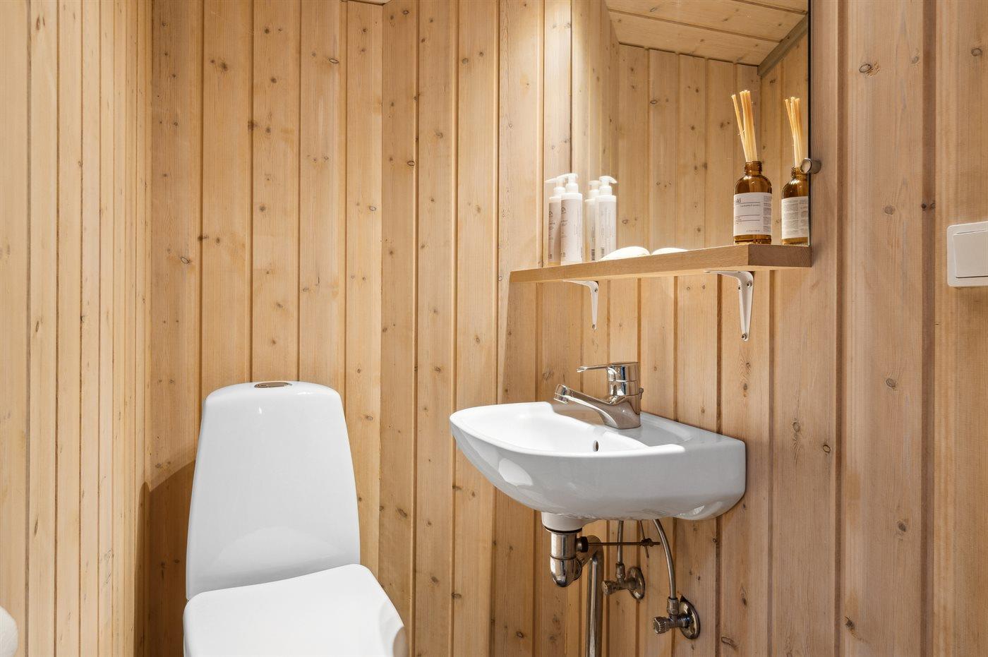 Der er 1 badeværelse med bruseniche og 2 toiletter, heraf 1 gæstetoilet. Der er gulvvarme på 1 badeværelse. I saunaen er der mulighed for afslapning.