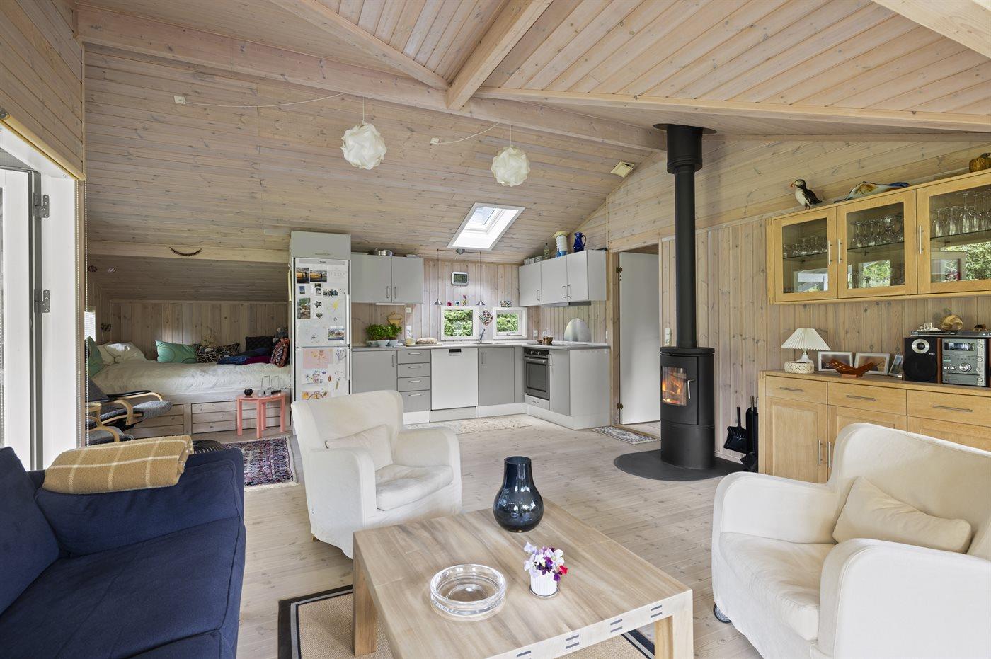 Sommerhuset har et åbent køkken-alrum, stue med brændeovn, flere gode soveværelser samt et badeværelse. Udendørs en dejlig have med terrasse, ideel til ophold og udendørs måltider i sommerhalvåret.