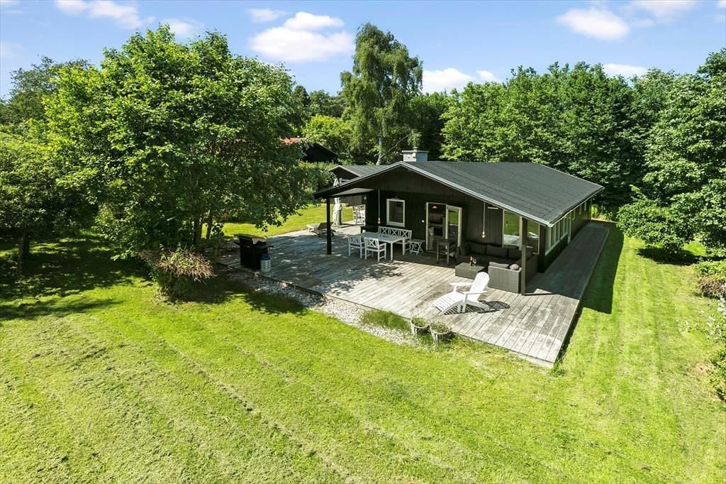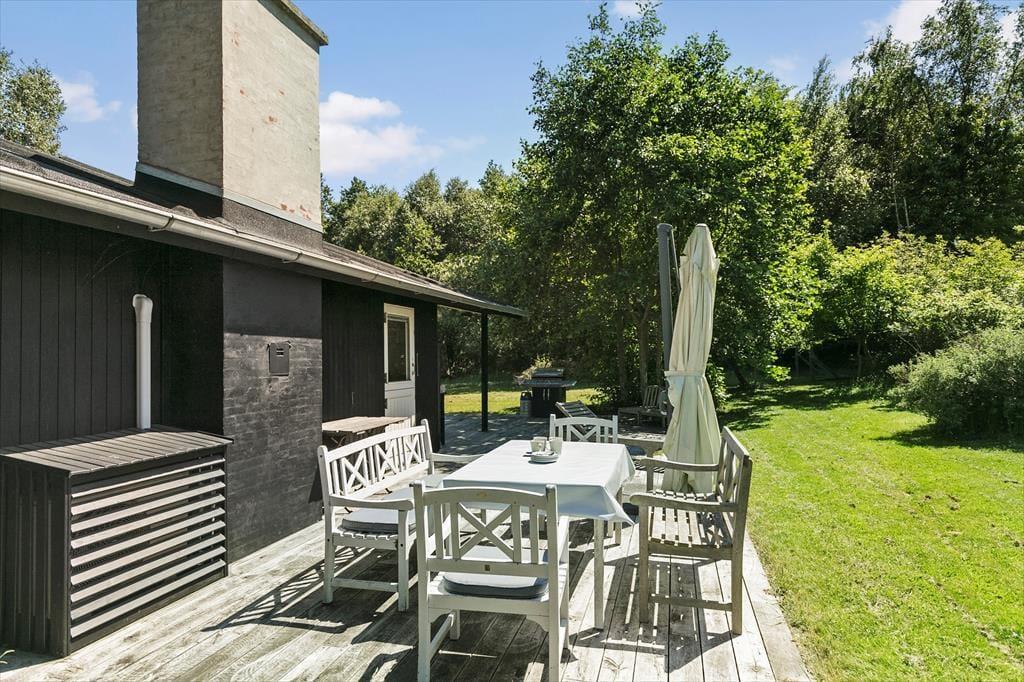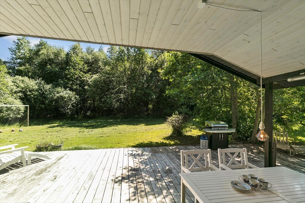 Huset er beliggende på en stor grund i rolige omgivelser, hvor du kan nyde ferien i fred og ro. Den overdækkede terrasse med havemøbler giver mulighed for hyggelige udendørs måltider, selv når vejret viser sig fra sin kølige side.
