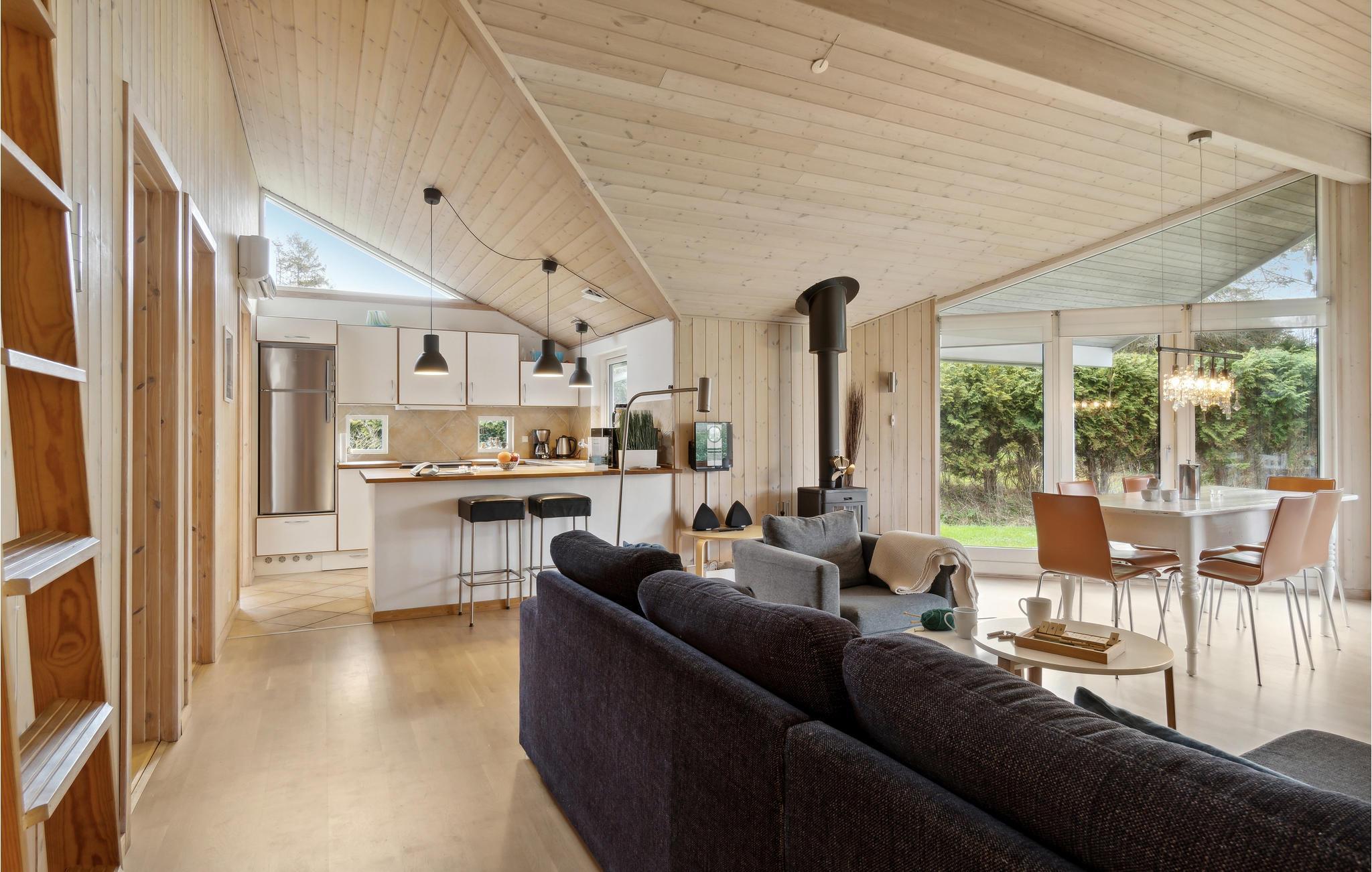 Velkommen til dette hyggelige feriehus, der befinder sig for enden af en lukket vej. Vælg hver især et soveværelse og nyd tiden sammen i den indbydende stue, som har et stort naturligt lysindfald, takket være vinduespartierne. Spil spil sammen ved spisebordet, slap af med en bog i sofaen eller tilbring sommerdagene på den store, solrige sydvendte terrasse, som indbyder til at grille og spise eller slikke sol, mens jeres børn udforsker haven og legeredskaberne.