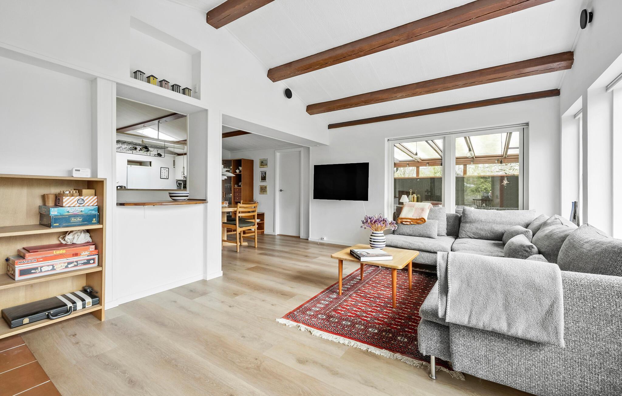 Tag en velfortjent pause fra hverdagen og rejs til Rågeleje, hvor I som lille familie får en skøn base i dette indbydende hus. Huset ligger i rolige, idylliske omgivelser, og indvendigt emmer det af hygge med solide træbjælker, åbent boligkoncept og store vinduespartier, der giver det indre et lyst og luftigt udtryk. Når vejret bider lidt, kan I fyre op i brændeovnen, der giver varme og det helt rette lydtapet til sofahyggen med brætspil eller en god film til langt ud på aftenen.
