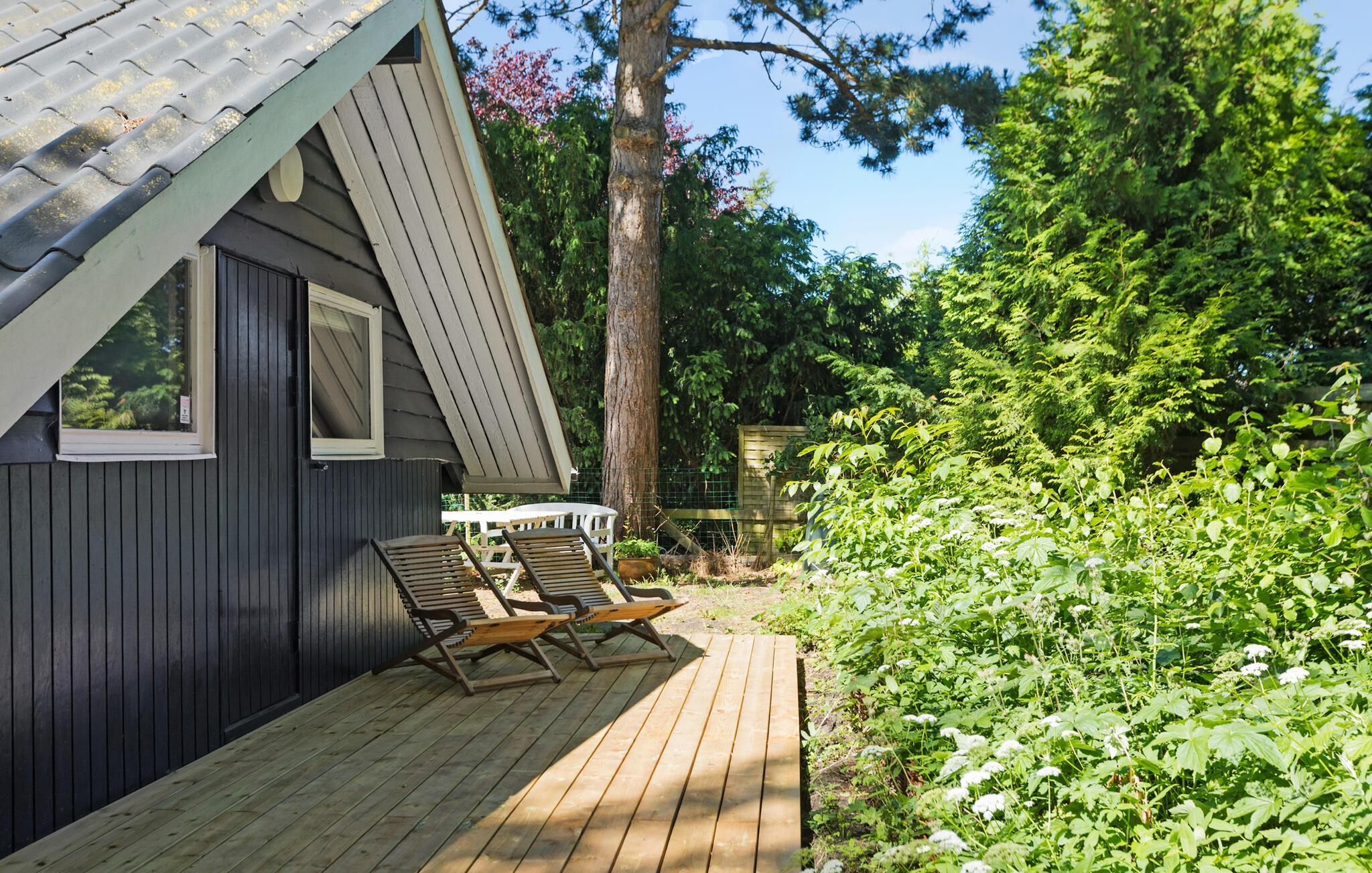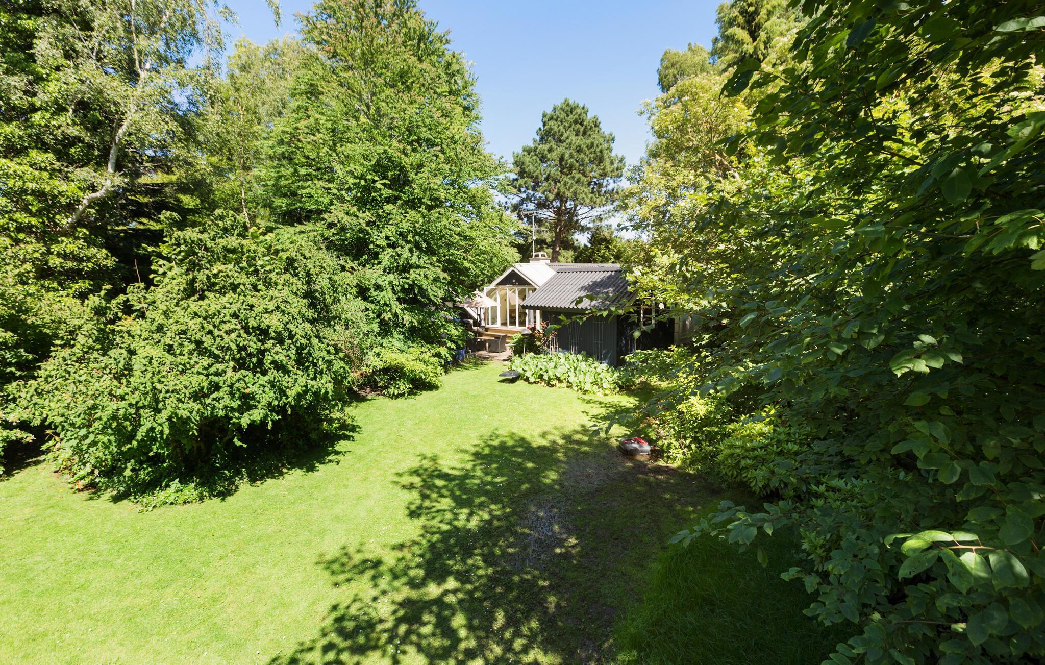 Hyggeligt feriehus i grøn oase nær Rågeleje Strand med terrasse, pejs og moderne faciliteter til en afslappende ferie.