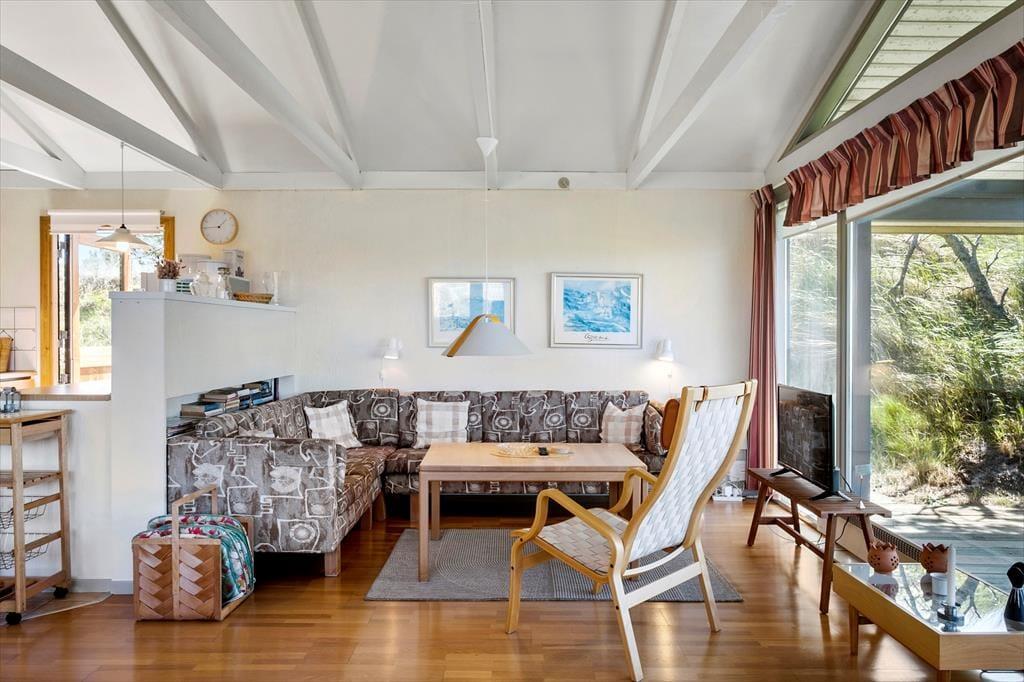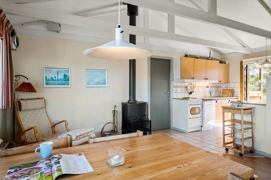 Når du træder indenfor, bliver du mødt af en hyggelig og varm atmosfære. De lyse rum og store vinduespartier bringer naturen tættere på, og du kan slappe af med en god bog i stuen eller nyde et måltid i det åbne køkken. Brændeovnen skaber en ekstra hyggestemning, når aftenerne bliver kølige, og med udsigten til det åbne landskab er der rig mulighed for at koble helt fra. Huset er skabt til to, men der er stadig masser af plads til at nyde hinandens selskab og finde ro i de afslappede omgivelser.
