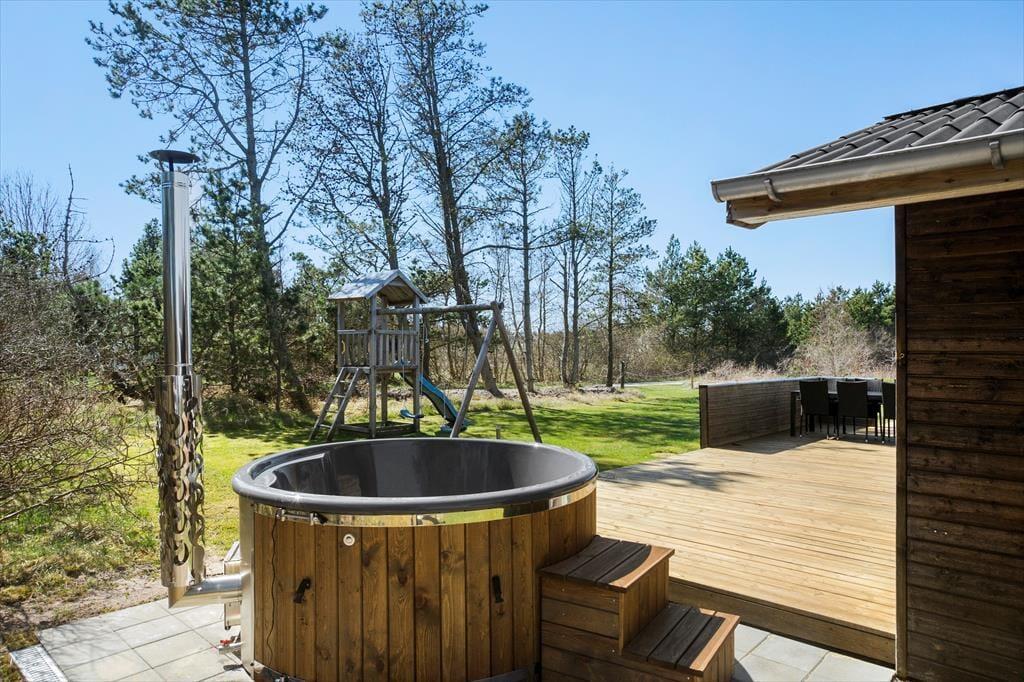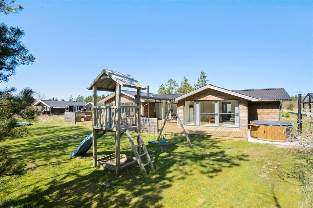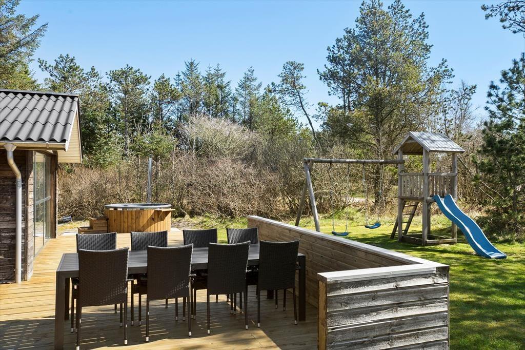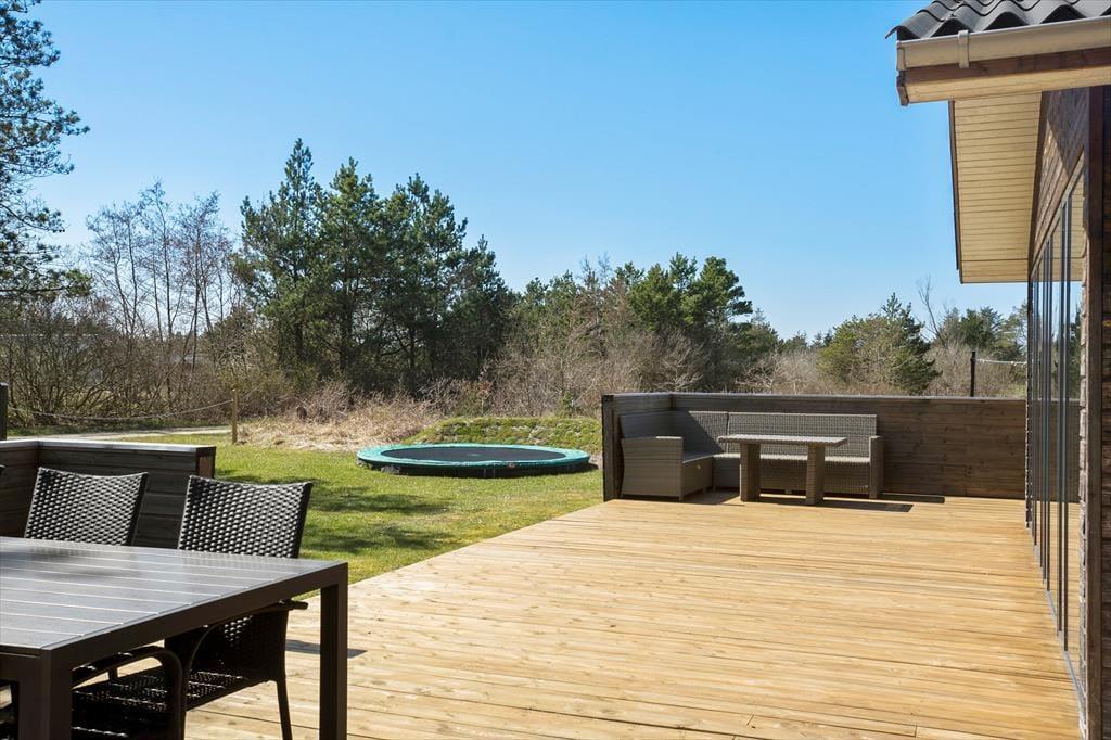 Den store åbne terrasse løber hele vejen rundt om huset, så her er plads til hele familien, og man kan dagen igennem altid finde en plet med sol, læ eller skygge. Mod øst skærmer store træer for vinden, og på den store naturgrund kan der spilles bold. Havemøbler, liggestole og grill må naturligvis benyttes af husets gæster, så de mange sommeraftner kan nydes i fulde drag.