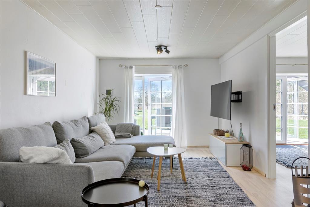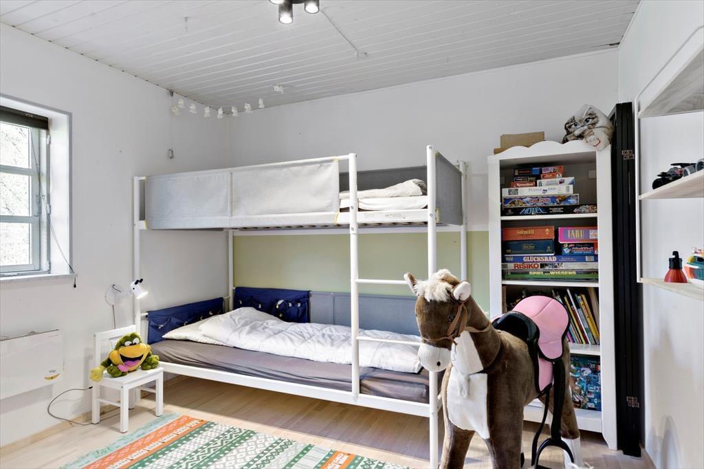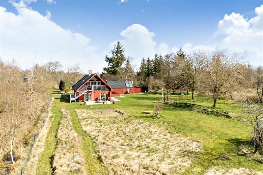 Ikke bare børn og voksne, men også hunde vil trives på sommerhusets dejlige udearealer. I har hele 12.050 m2 at boltre jer på, og en del af grunden er indhegnet, mens omgivelserne er fredelige og naturskønne. Det er herligt at sole sig på husets terrassearealer, nyde udsigten førstesalens overdækkede altan og samles for at grille om aftenen. Til de yngste er der sandkasse og gynge, og legebørn i alle aldre kan virkelig give den gas på den vidtstrakte græsplæne.