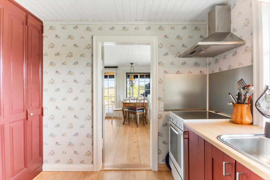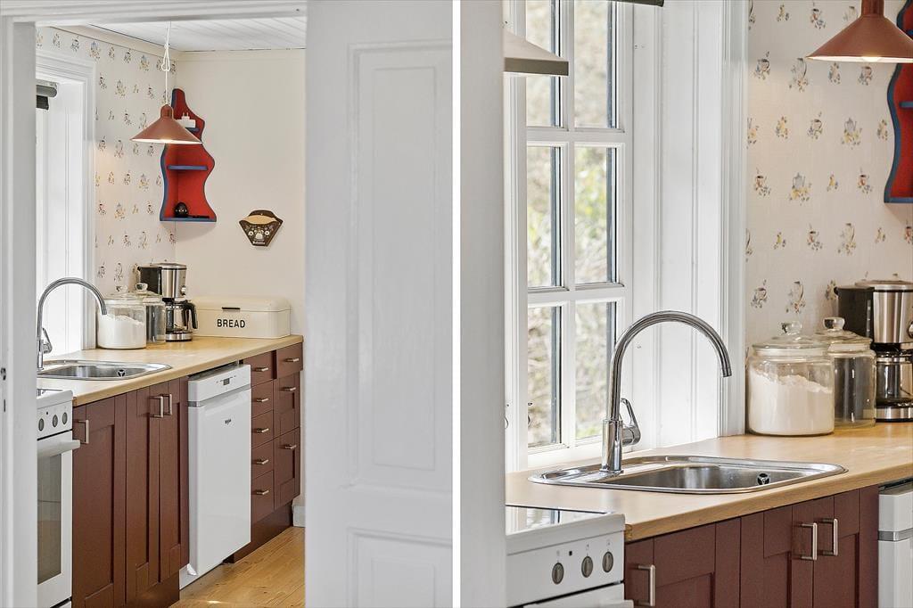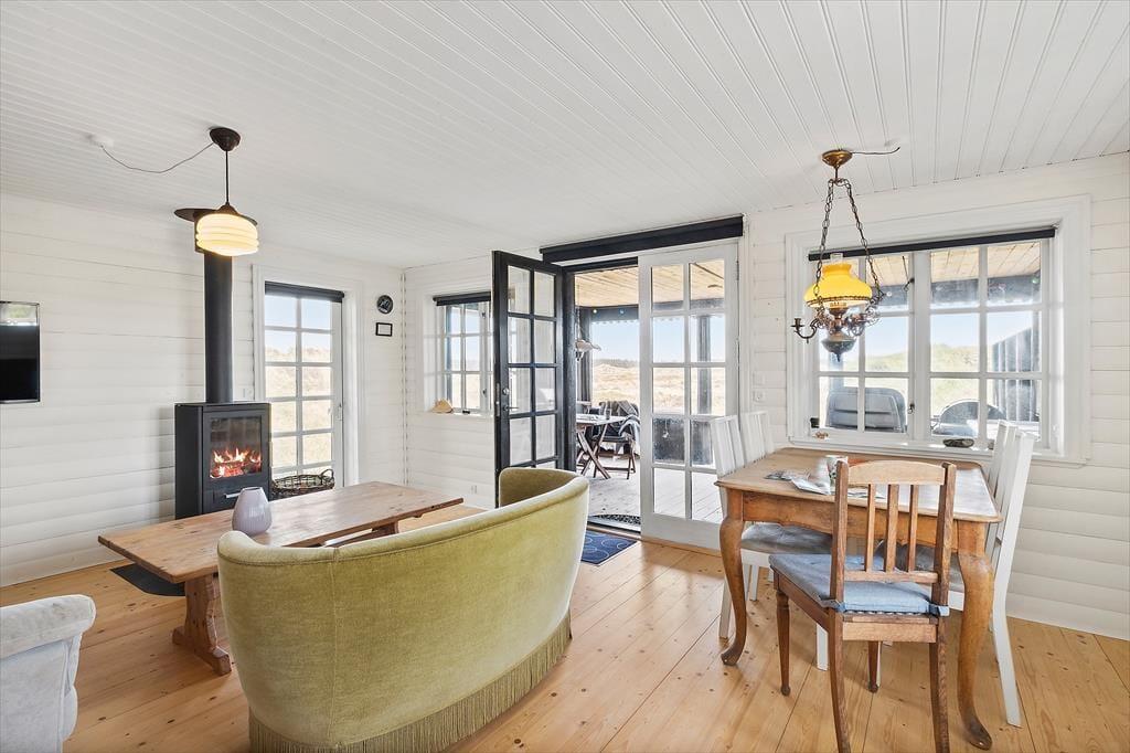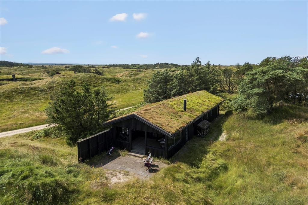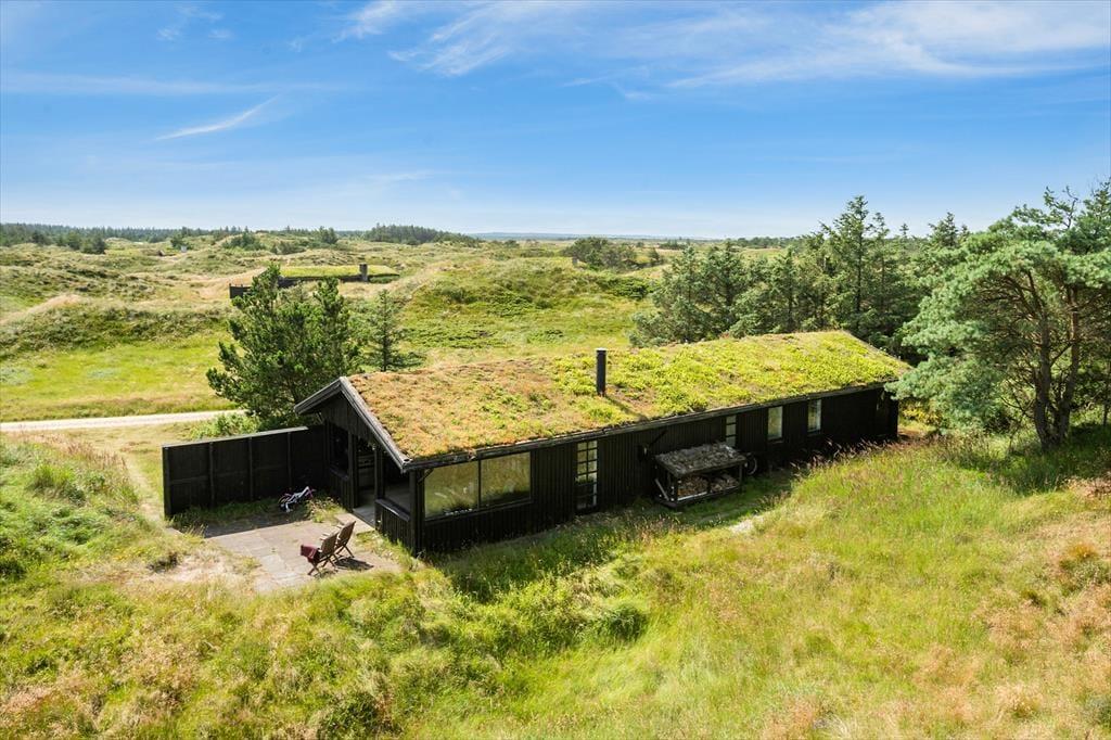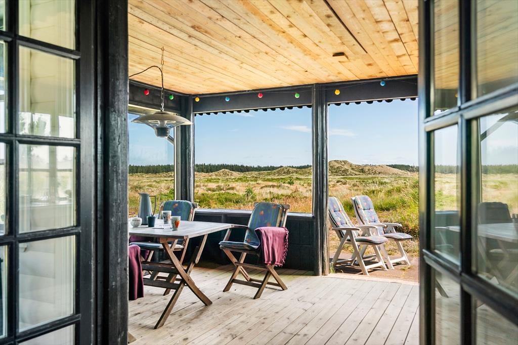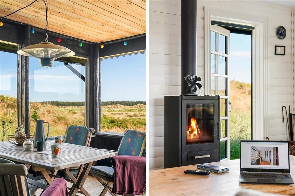 Set udefra har træhuset ikke ændret sig det store siden opførelsen i 1967, og det ser nærmest ud til at være smeltet sammen med det kuperede klitlandskab. At huset er fulgt med tiden bliver dog ganske tydeligt inden døre, hvor rummene fremstår lyse og med flere moderne detaljer – inklusiv opvaskemaskine i køkkenet, fladskærms-tv med Chromecast i stuen og god wi-fi-forbindelse. Et pænt brusebadeværelse og et ekstra toilet hører med til planløsningen foruden tre soveværelser, der i alt har sengepladser til fem personer. Køkkenet ligger ved siden af stuen, så når kaffen er færdigbrygget, eller aftensmaden står klar, er det nemt at bære ind til spisebordet eller sofaen nær brændeovnen.