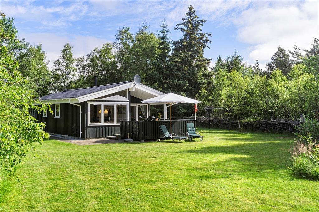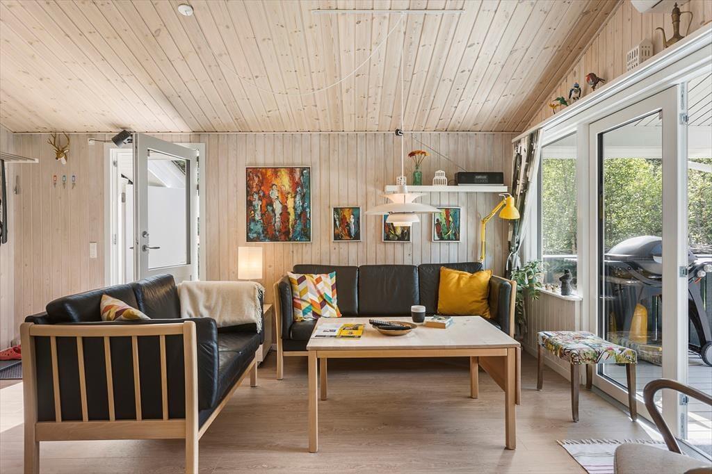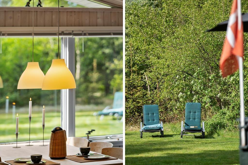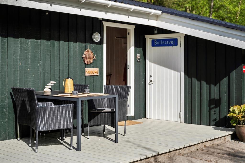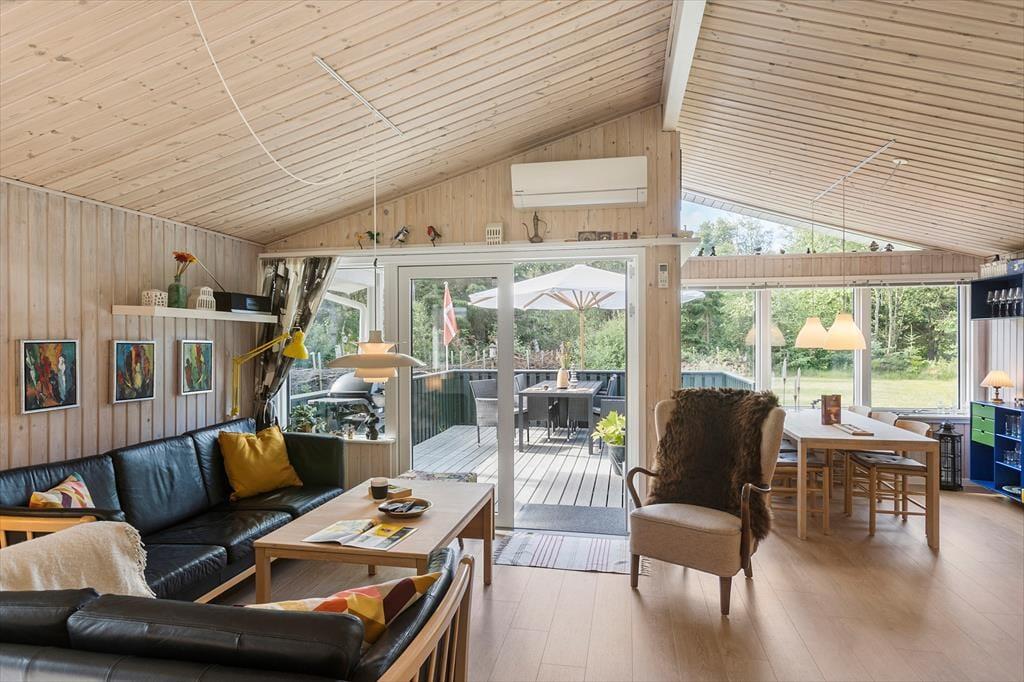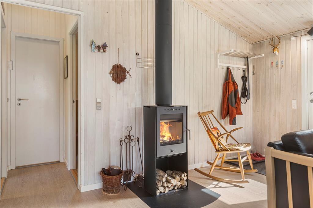 Sommerhuset passer godt til seks personer, for der er tre soveværelser at gøre godt med, hvoraf det ene ligger i annekset lige ud for entréen. Et badeværelse med bruser og vaskemaskine findes også i huset, og endelig er køkken og stue forenet, så det tilsammen fungerer som et hyggeligt opholdsrum, hvor både afslapning, madlavning og middage kan foregå. Er det køligt udenfor, kan I tage varmepumpen såvel som brændeovnen i brug, og på en solrig sommerdag er det måske mere oplagt at åbne havedøren på vid gab, så I har fri passage ud til den dejlige træterrasse.