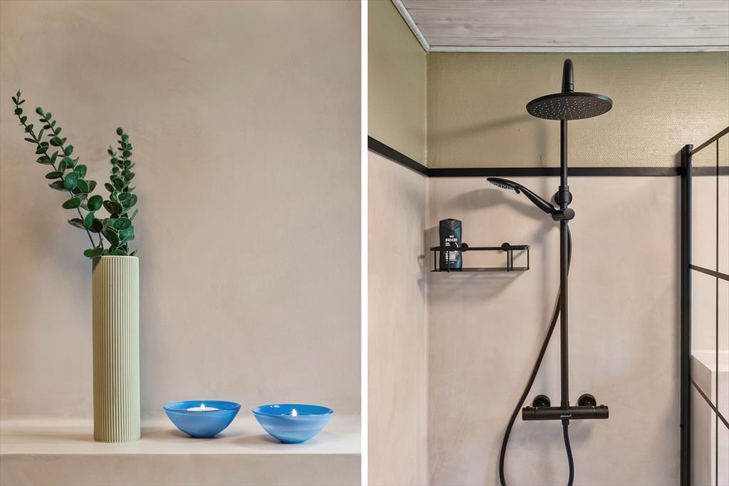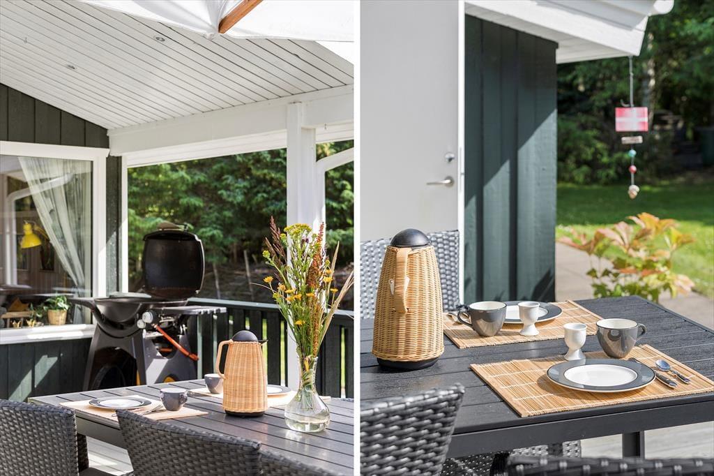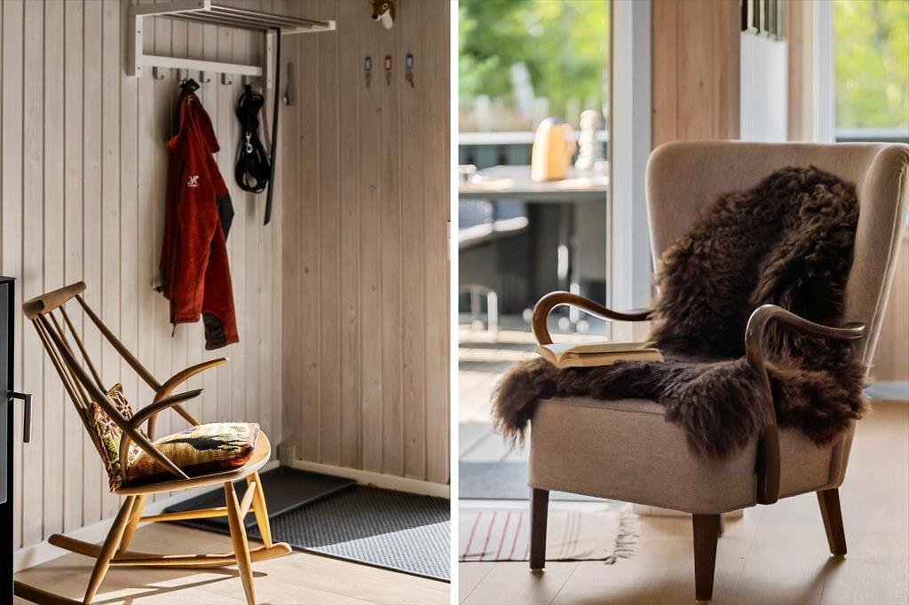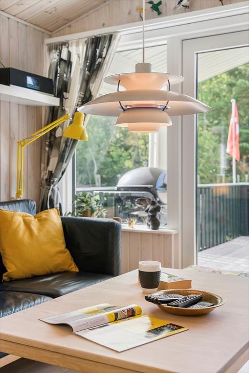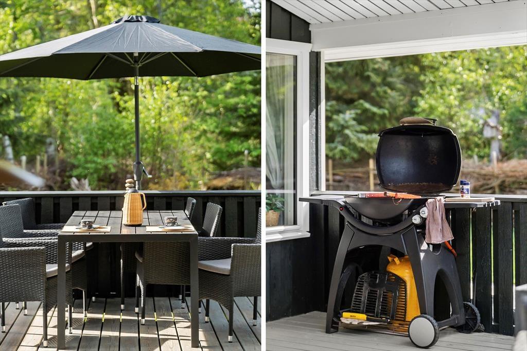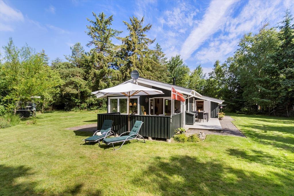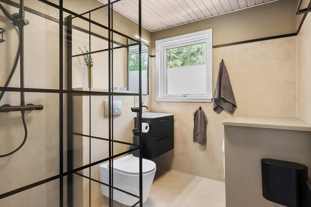 Sommerhuset passer godt til seks personer, for der er tre soveværelser at gøre godt med, hvoraf det ene ligger i annekset lige ud for entréen. Et badeværelse med bruser og vaskemaskine findes også i huset, og endelig er køkken og stue forenet, så det tilsammen fungerer som et hyggeligt opholdsrum, hvor både afslapning, madlavning og middage kan foregå. Er det køligt udenfor, kan I tage varmepumpen såvel som brændeovnen i brug, og på en solrig sommerdag er det måske mere oplagt at åbne havedøren på vid gab, så I har fri passage ud til den dejlige træterrasse.