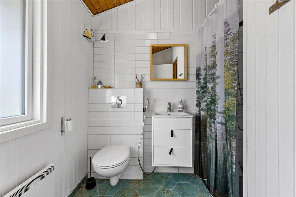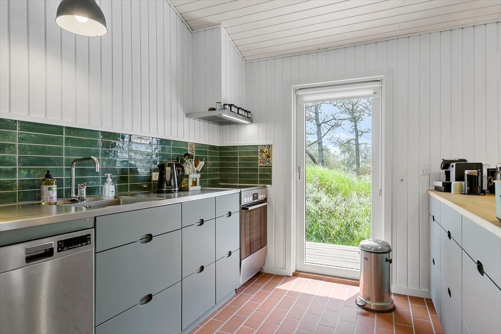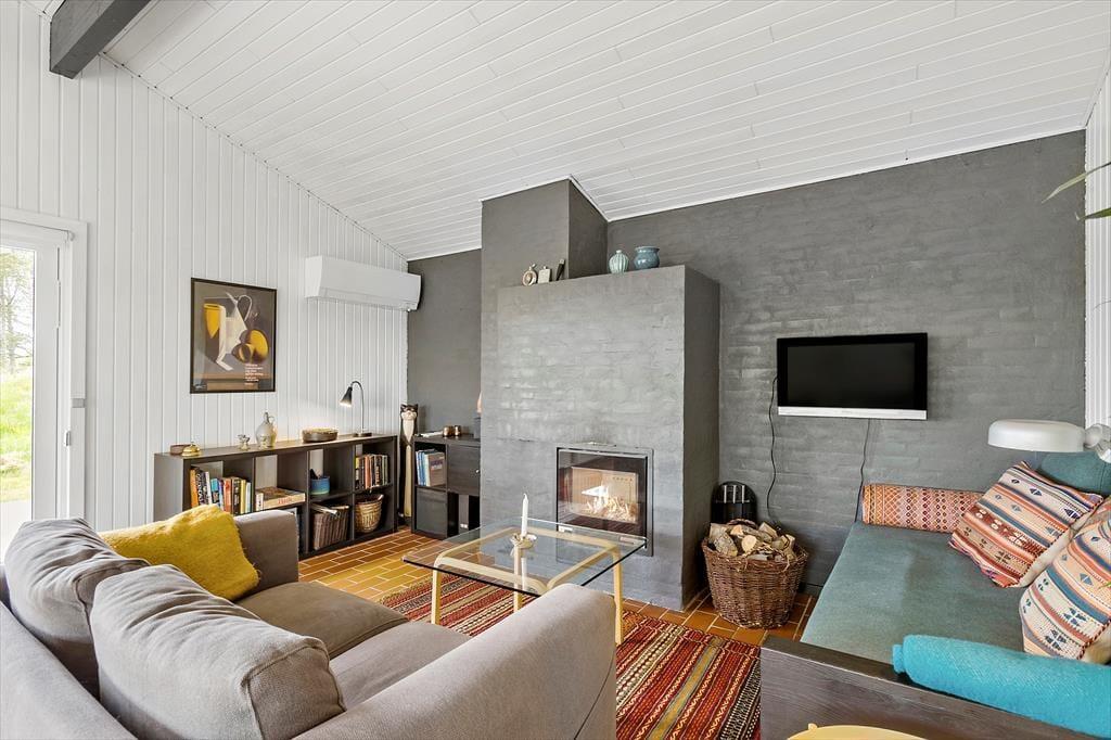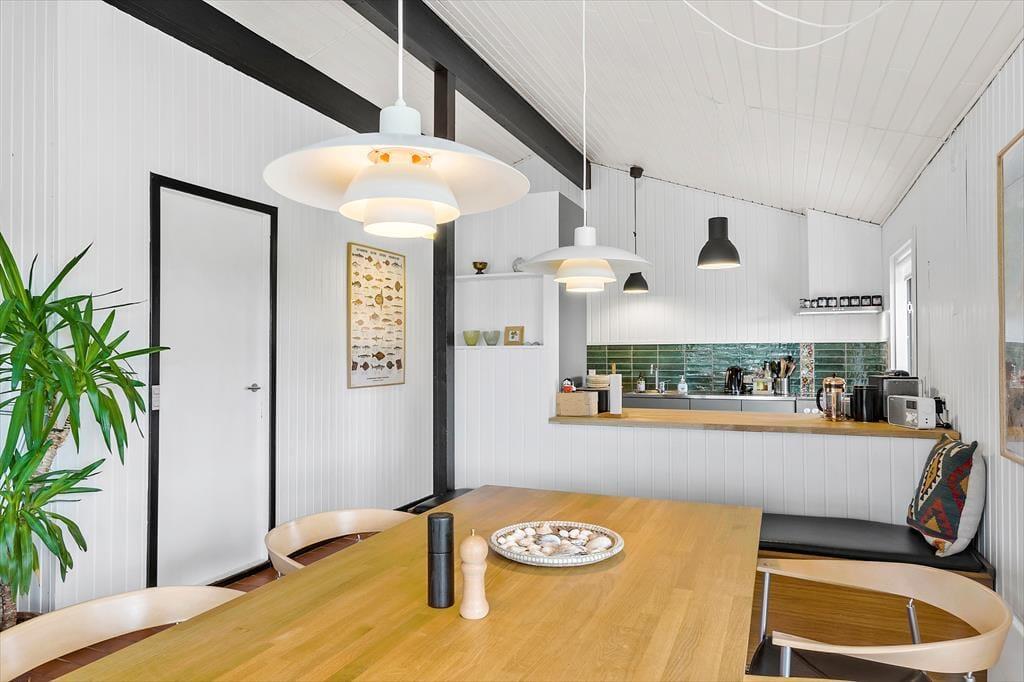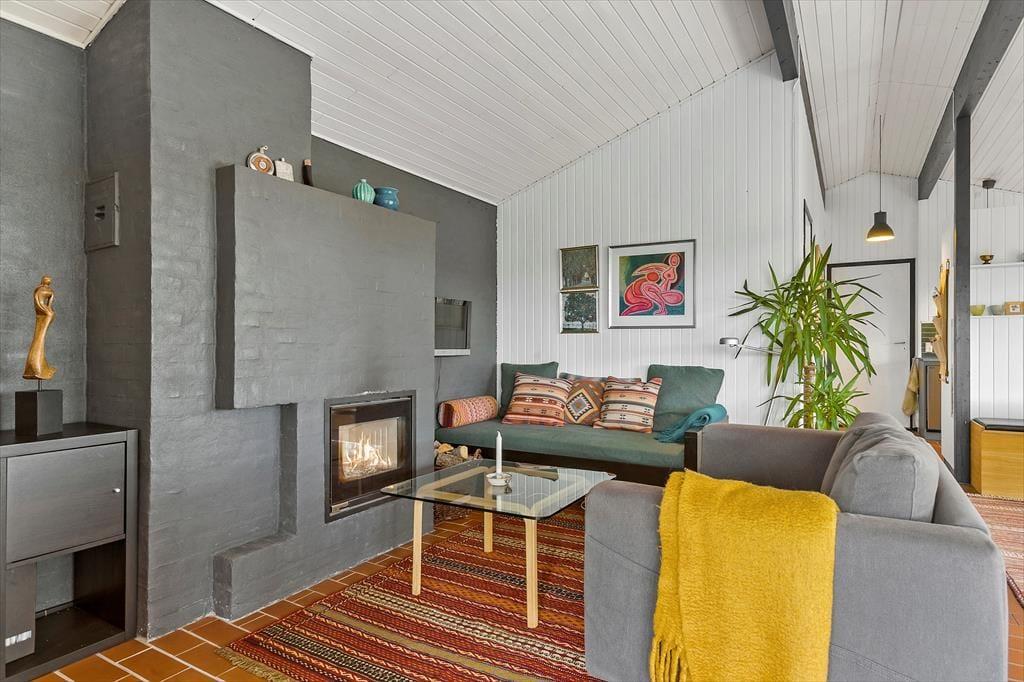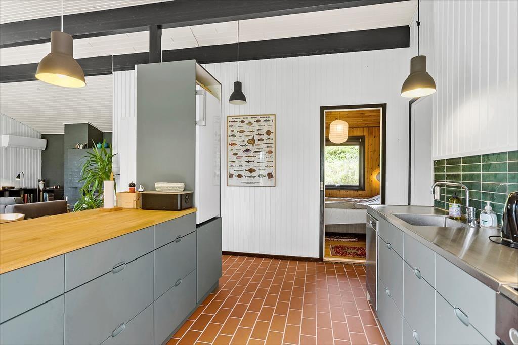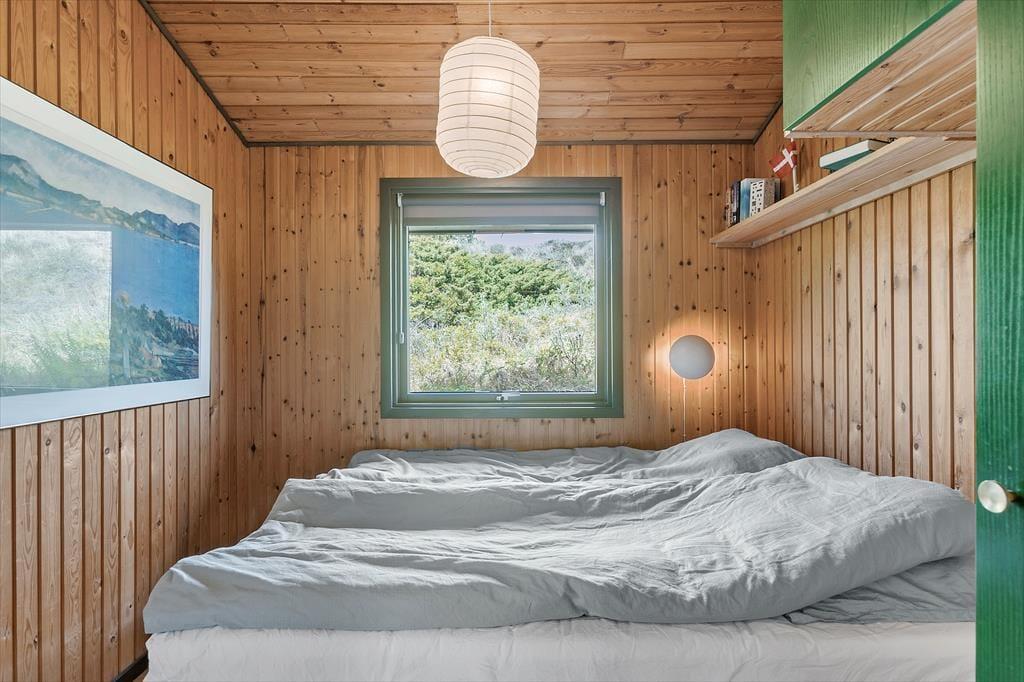 Huset emmer af ”rigtig” sommerhusstemning med sin enkle byggestil og græsset på taget, der næsten får det til at gå i ét med den omgivende natur. Indenfor er der en varm og hyggelig atmosfære, og indretningen giver de bedste rammer om ferieturens samvær med familie og venner. Det kan I især se frem til at nyde i det skønne opholdsrum med loft til kip og masser af naturligt lys fra de store vinduespartier. Her er der god plads til både at være sammen og hver for sig, og I får I et dejligt frit kig til naturen udenfor. Det tosidede køkken ligger i åben forbindelse med stuen og giver fine rammer om de kulinariske udfoldelser. Soverum er der tre af – med plads til i alt 6 personer – og endelig er der et badeværelse med brus.