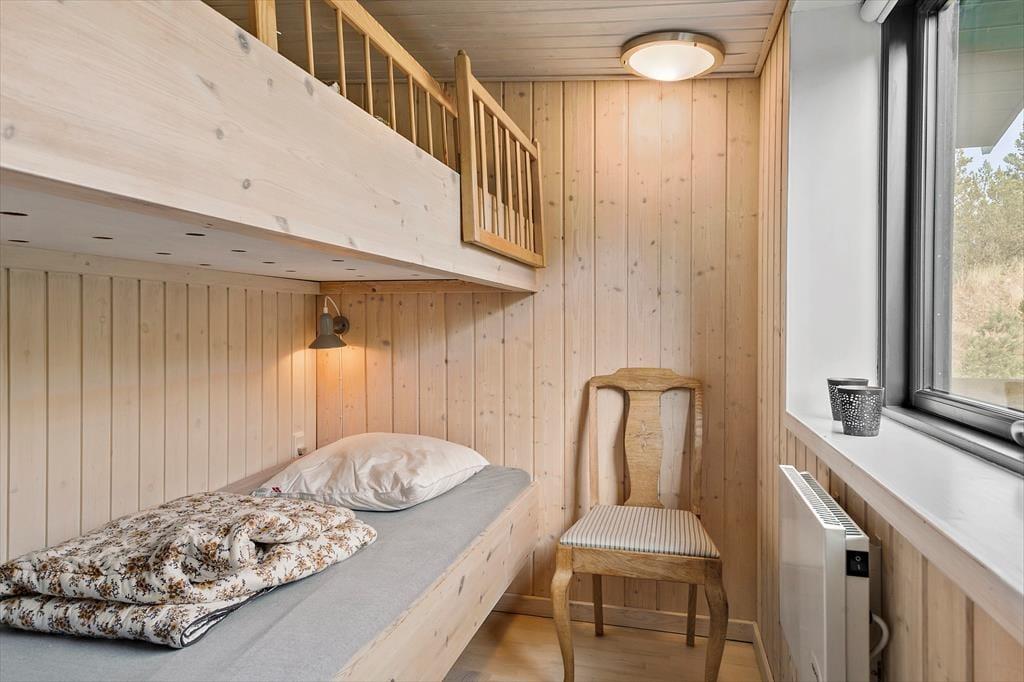 Med sin torden blå træfacade og sit grønne tag emmer huset af autentisk sommerhusstemning, hvilket passer perfekt ind i landskabet. Huset fremstår meget velholdt, og indenfor er der en varm og indbydende atmosfære med mange trædetaljer og hyggelige opholdspladser. Naturligt lys får I også i generøse mængder takket være de mange vinduespartier. Samværet i familiens skød får fine betingelser i det hyggelige, højloftede opholdsmiljø med køkken og stuer i åben forbindelse. Her er der også en brændeovn, som luner godt, hvis aftenerne skulle blive kølige. Huset har plads til otte personer fordelt på fire soveværelser: et værelse med dobbeltseng, et med to enkeltsenge og to værelser med køjesenge. Endelig er der på praktisk vis to badeværelser, så risikoen for kø til bruseren om morgenen er minimal. Bemærk der er en lille trappe indvendigt i huset på 3 trin.
