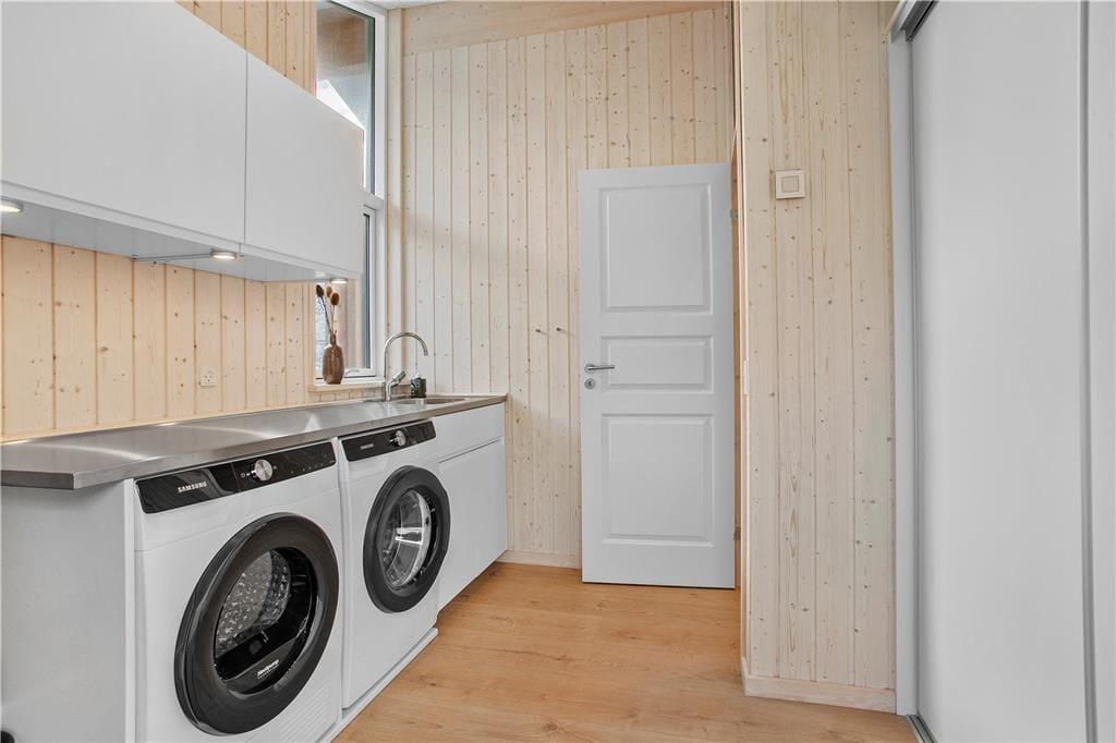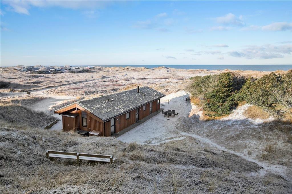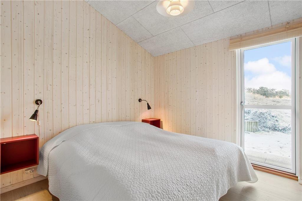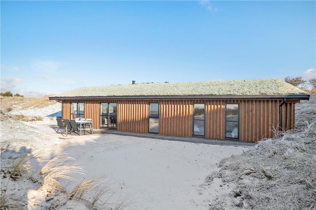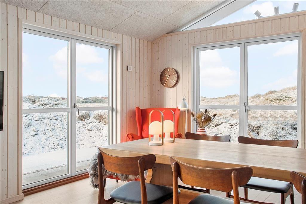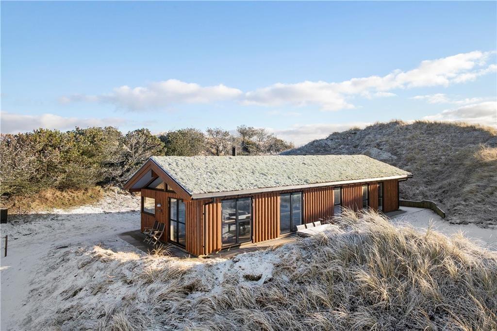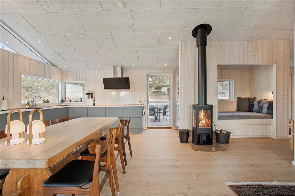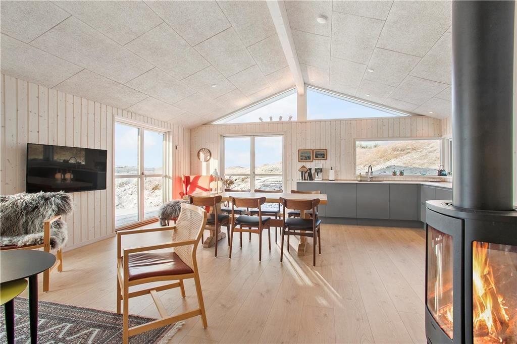 Da sommerhuset blev opført i 2020, sørgede man for at tilpasse arkitekturen til det smukke kystområde: Træfacaden og det levende tag falder godt ind blandt klitternes marehalm og fyrretræer, mens husets indre nyder godt af det flotte lysindfald, der falder gennem de mange store vinduer. Netop vinduerne giver jer samtidig en fri og uforstyrret udsigt over det åbne, kuperede landskab, hvilket må siges at være et helt perfekt bagtæppe, når der skal slappes af. Ferien kan foregå hele året rundt, for det moderne hus er udstyret med en energivenlig luft til vand-varmepumpe. Derudover er der gulvvarme i alle rum, inklusiv i bryggerset, på badeværelset og på de tre dejlige soveværelser, og i stuen står en brændeovn derudover klar til at sprede varme og hyggestemning. En alkove er et af stuens andre hyggeelementer, mens det lækre åbne køkken er endnu et eksempel på den høje kvalitet, der præger hele sommerhuset.