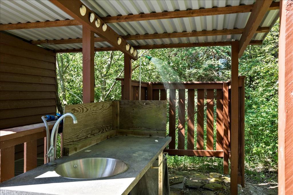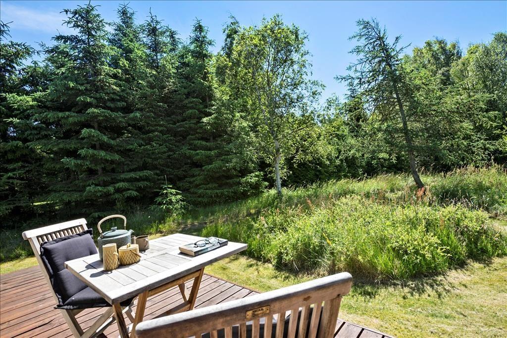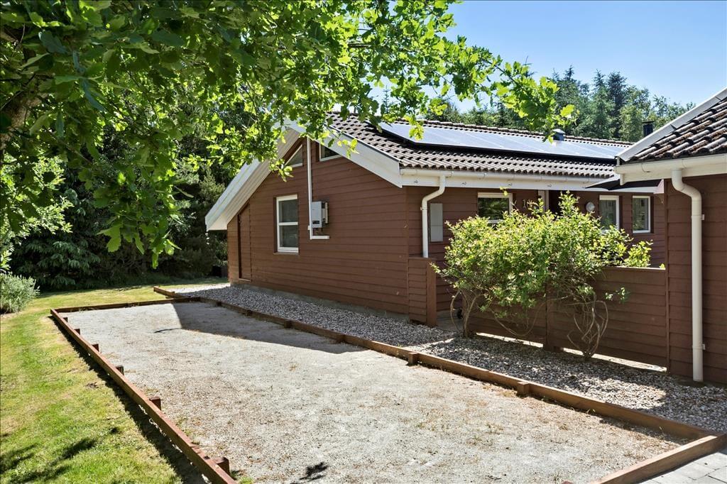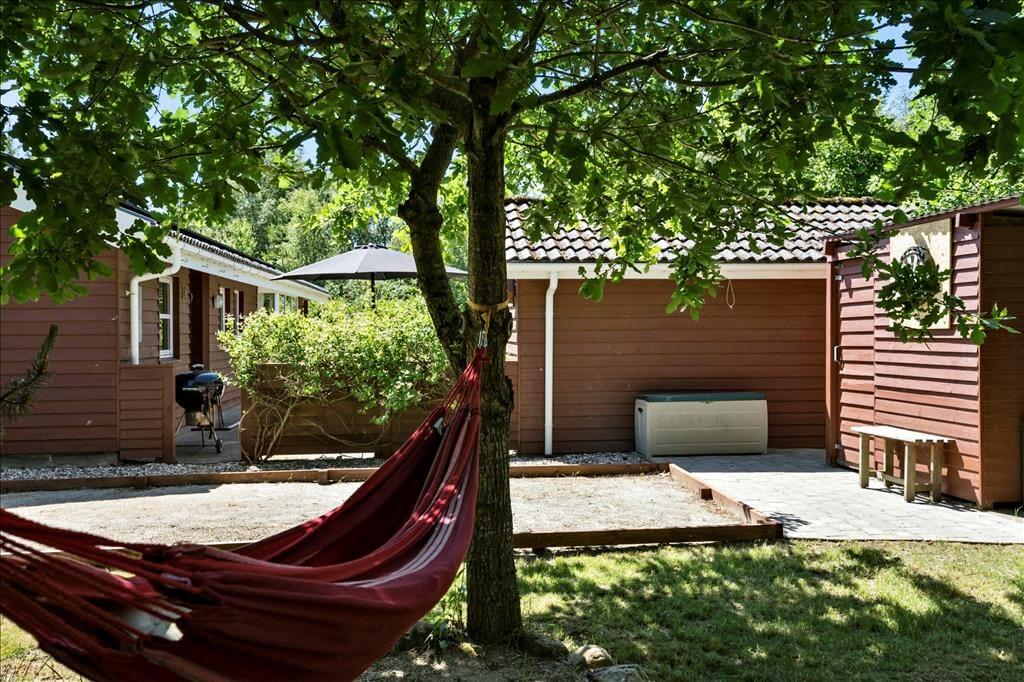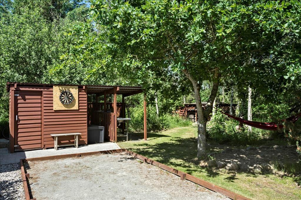 Legebørn og livsnydere får det skønt ude i det fri på den 2.359 m2 store grund. Her er grønt og frodigt, og der er god plads til at boltre sig på græsplænen og til at sole sig på de dejlige terrasseområder, der er placeret rundt omkring sommerhuset. For at gøre udelivet endnu mere komplet, er der petanquebane, dart, hængekøje, gynge og sågar en udendørs bruser, så morgenbadet kan foregå til lyden af fuglesang fra trætoppene.