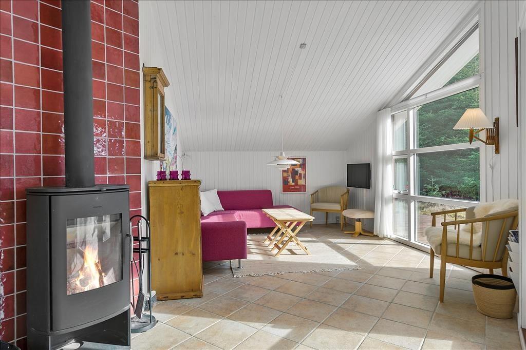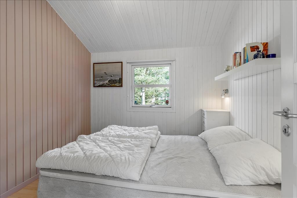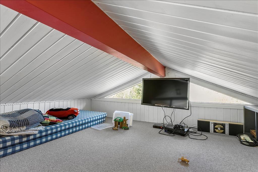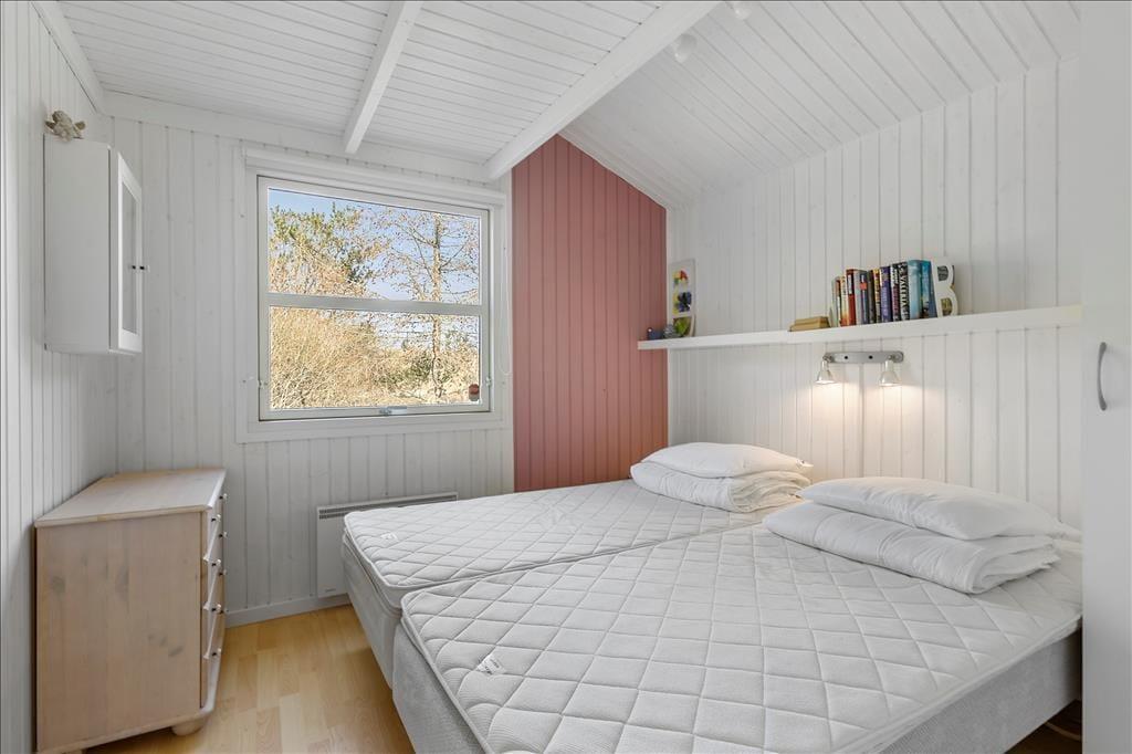 Sommerhuset er opført i 2002 og er senest blevet renoveret i 2020, så det fremstår pænt og velholdt. Inden døre kan I brede jer på 108 m2, og planløsningen er fornuftigt udformet, så otte personer kan nemt og bekvemt holde ferie sammen. Alle fire værelser er udstyret med gode dobbeltsenge, og så er der både et stort badeværelse og et mindre gæstetoilet i huset. Når I virkelig skal koble af, kan I gøre klar til en rigtig wellness-stund med spabad og sauna på badeværelset – eller også kan I tænde op i brændeovnen, finde en god film på fladskærmen og slænge jer i sofaen. Sofakrogen ligger som del af det store opholdsrum, der også er indrettet med spisebord og et veludstyret åbent køkken. Husets hems er for øvrigt også indrettet som en dejlig hyggekrog, for her er der nemlig madrasser og tv med Playstation.