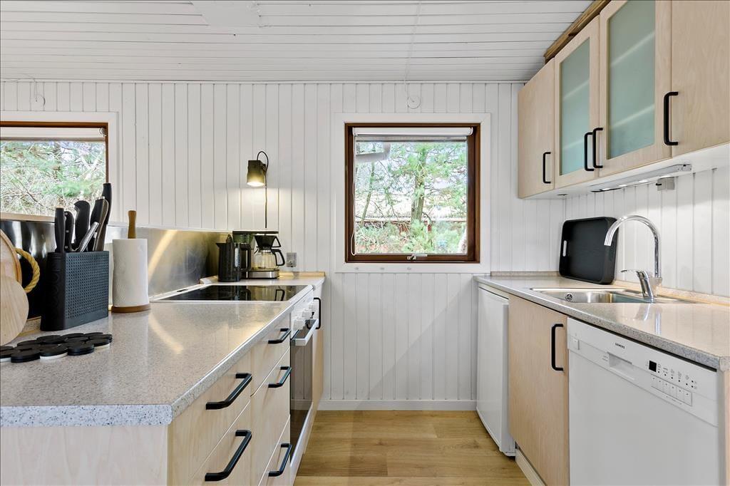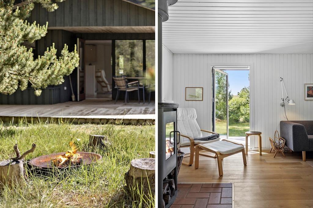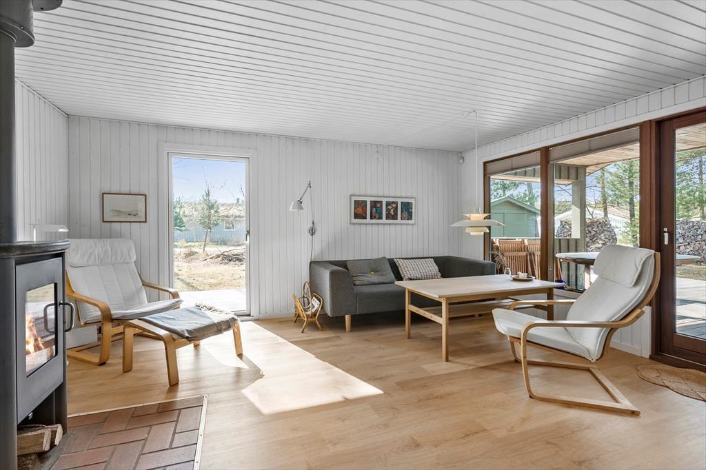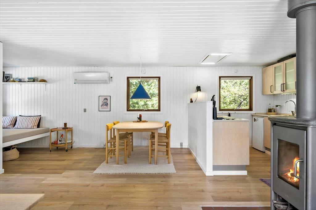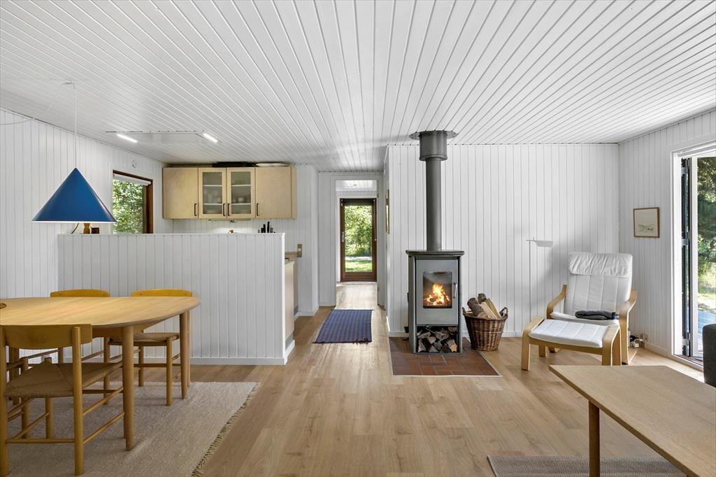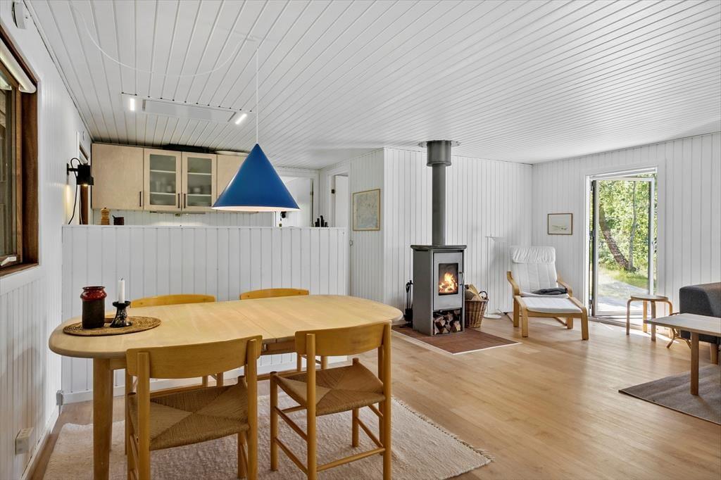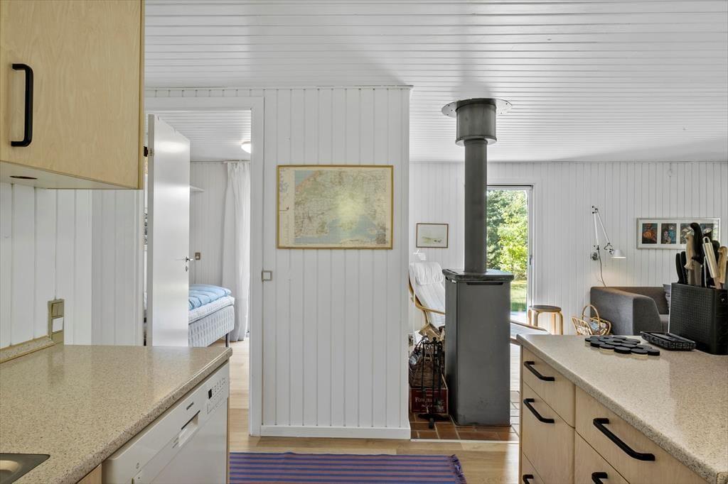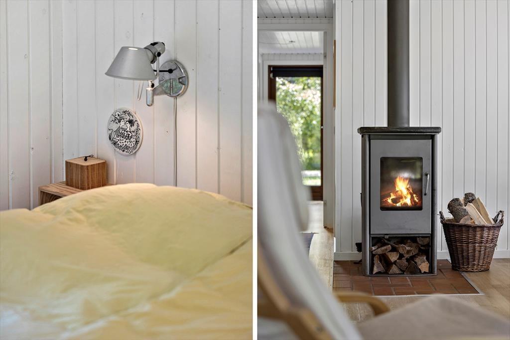 Inden døre er der rart at være, og det skyldes blandt andet den lyse indretning og den velfungerende planløsning. I stuen bidrager brændeovnen til den hyggelige atmosfære, og så hjælper det også på feriefornemmelsen, at I kan kigge ud på den grønne naturgrund, uanset om I slapper af i sofaen, sidder ved spisebordet eller kræser om maden i det åbne køkken. I stuen står der for øvrigt en briks, som er perfekt til en middagslur eller avislæsning på langs, mens nattesøvnen kan foregå på de to soveværelser, der i alt har sengepladser til fire personer. Et badeværelse med bruser byder huset også på plus et bryggers med vaskemaskine.