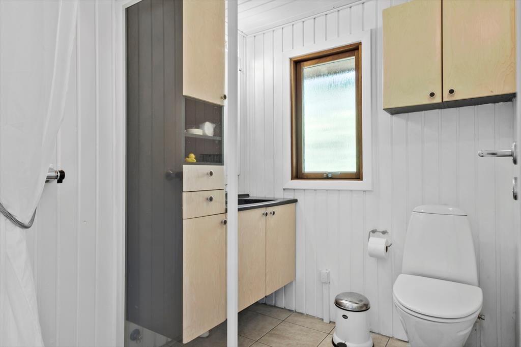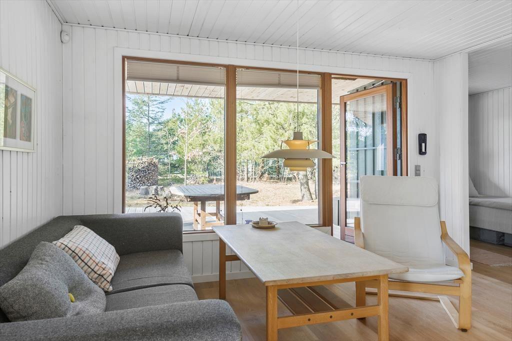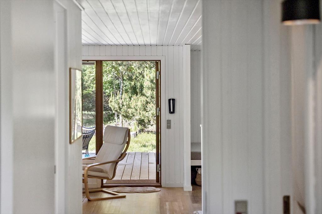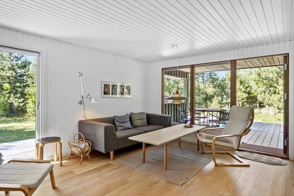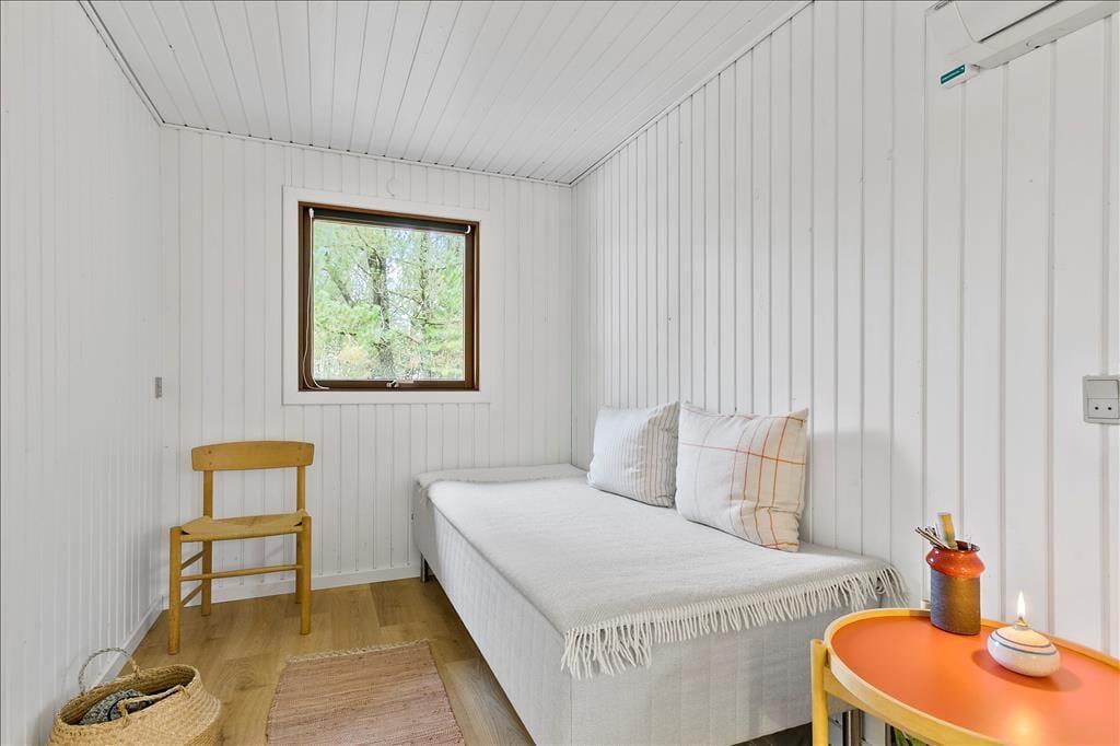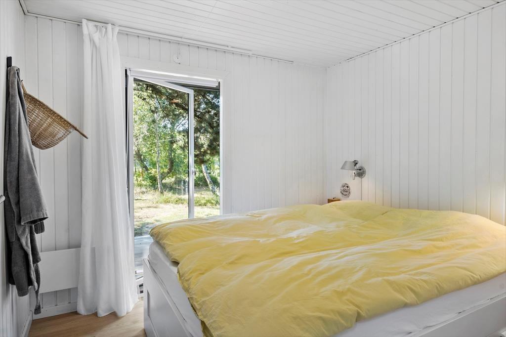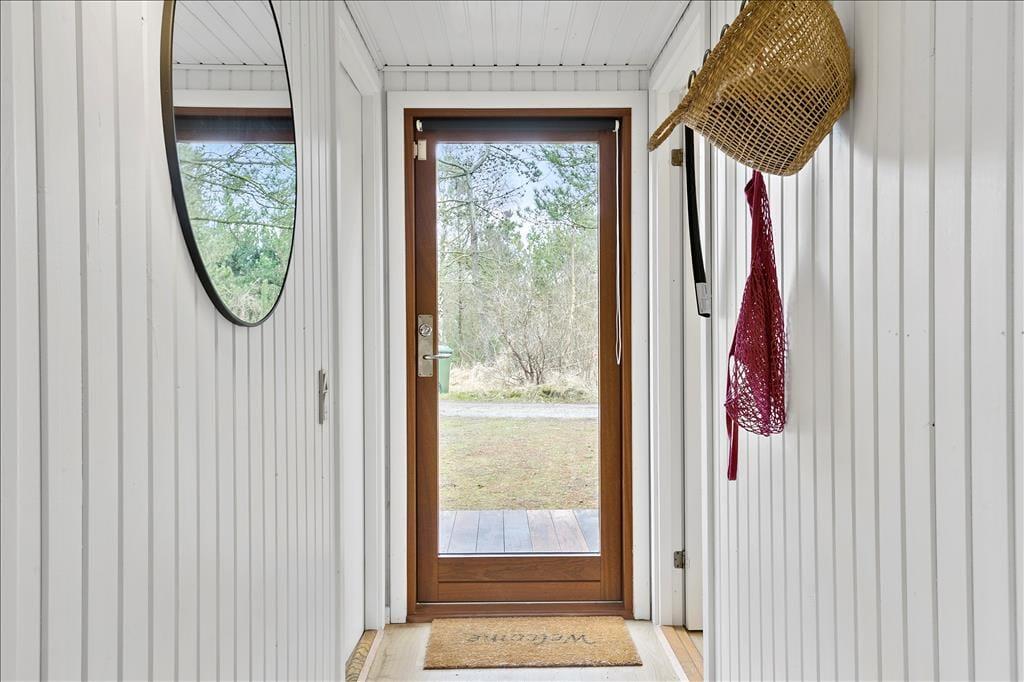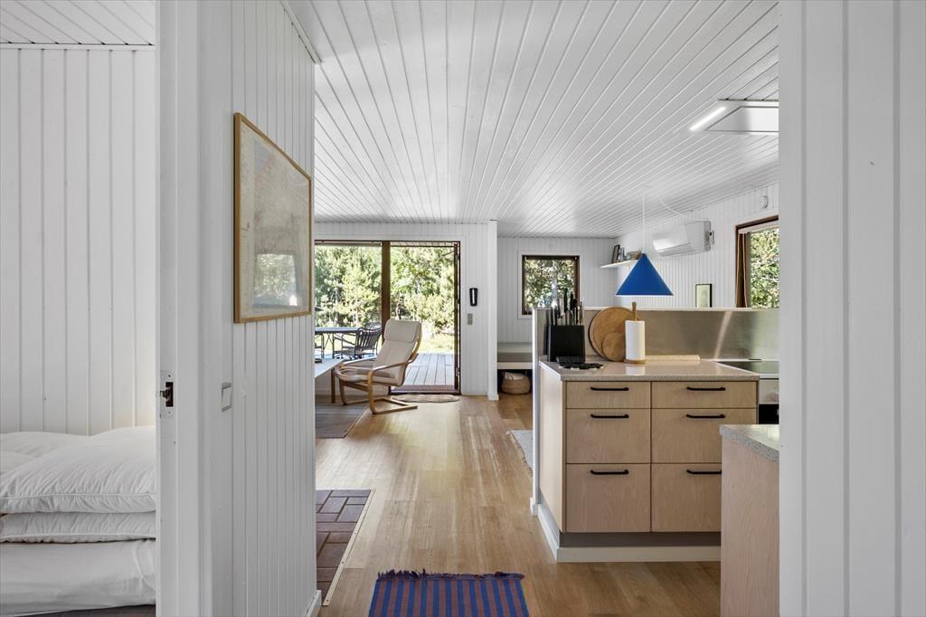 Inden døre er der rart at være, og det skyldes blandt andet den lyse indretning og den velfungerende planløsning. I stuen bidrager brændeovnen til den hyggelige atmosfære, og så hjælper det også på feriefornemmelsen, at I kan kigge ud på den grønne naturgrund, uanset om I slapper af i sofaen, sidder ved spisebordet eller kræser om maden i det åbne køkken. I stuen står der for øvrigt en briks, som er perfekt til en middagslur eller avislæsning på langs, mens nattesøvnen kan foregå på de to soveværelser, der i alt har sengepladser til fire personer. Et badeværelse med bruser byder huset også på plus et bryggers med vaskemaskine.