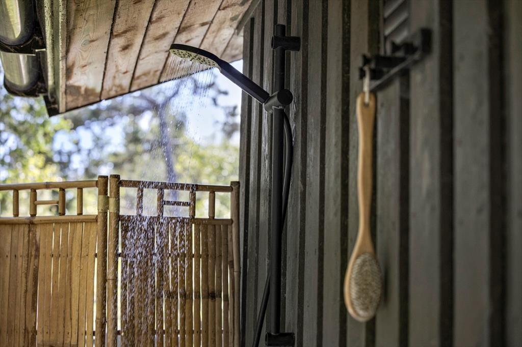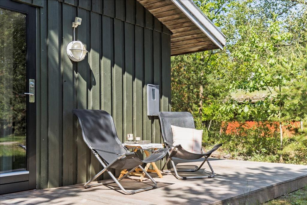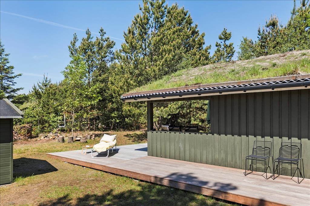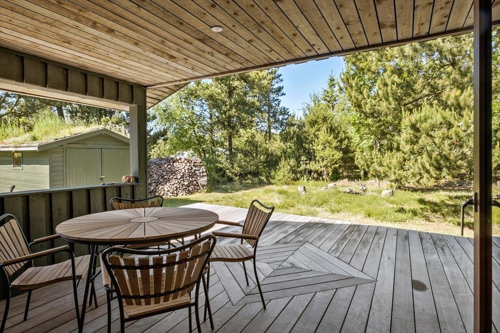 Stuens glasdør giver jer direkte adgang til en stor og delvist overdækket træterrasse, der breder sig om tre af husets sider. Derfor er det nemt at finde en solrig plet dagen lang – og så endda med udsigt til de flotte fyrretræer, der står på naturgrunden. Er det varmt og sommerligt, kan I tage en skyggefuld pause i hængekøjen, og der er også mulighed for at blive frisket op under udendørsbruseren.