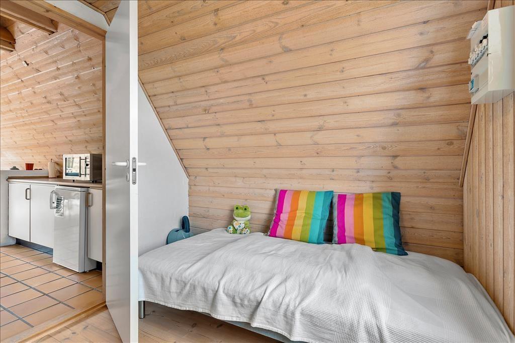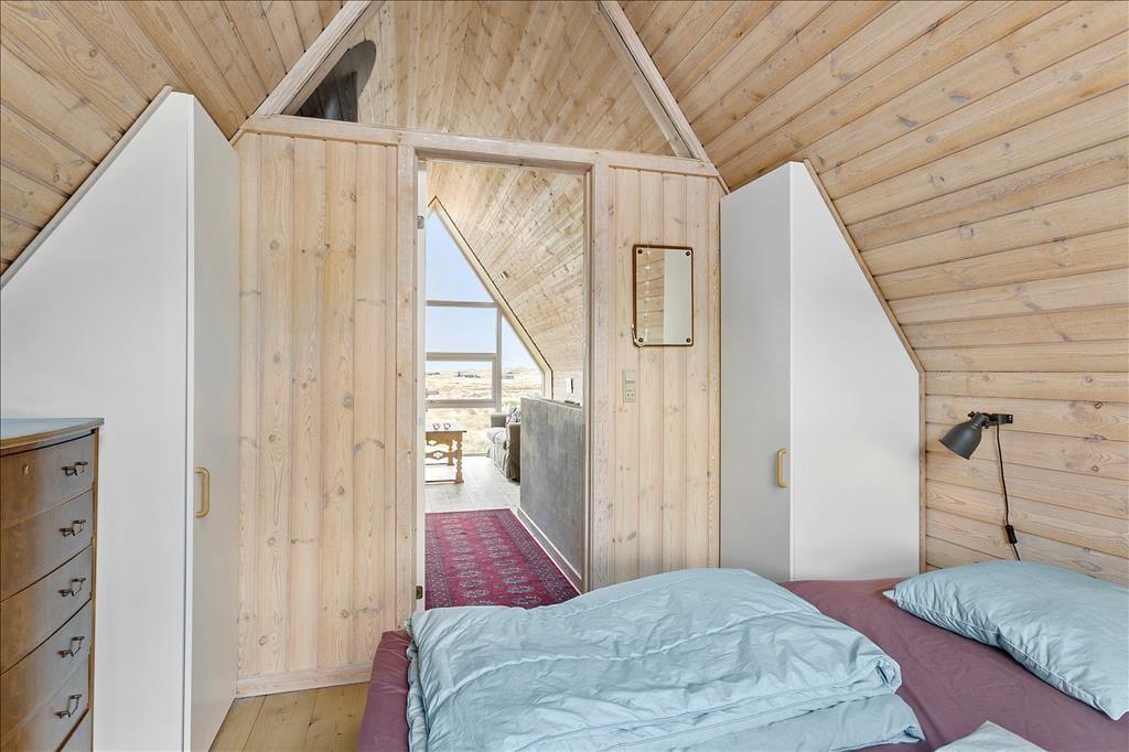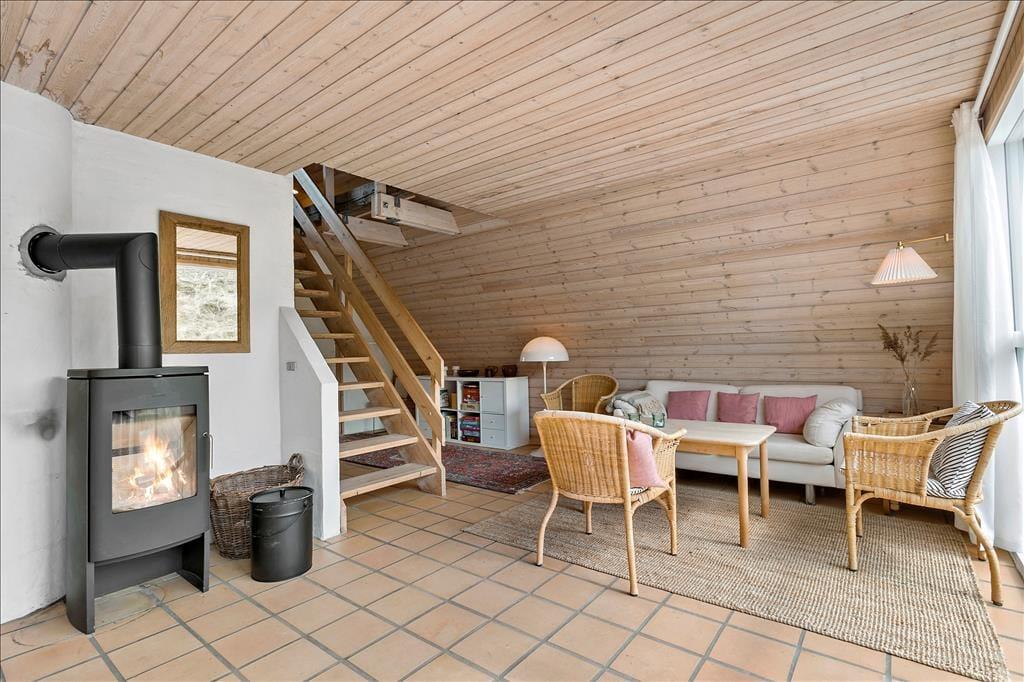 Sommerhuset har ligget på denne naturskønne plet siden 1987, og det fremstår pænt og velholdt både ude og inde. Som et typisk A-hus, hvor taget går helt ned til jorden, er stueplan større end førstesalen: I nederste niveau ligger to soveværelser, et badeværelse og en stor stue med integreret køkken, mens førstesalen byder på et tredje soveværelse og en ekstra opholdsstue. Både oppe og nede giver skråvæggene og de umalede trælister rummene et charmerende udtryk, og møblementet understøtter den gode sommerhusatmosfære. Selvom det er rart at opholde sig i alle rum, kan førstesalens stue meget vel blive favoritpladsen, for gennem det store gavlvindue er naturudsigten særligt imponerende.