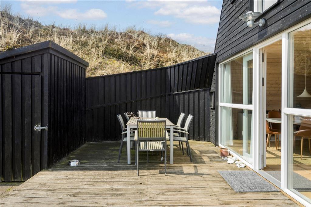 På den 3.472 m2 store naturgrund ligger sommerhuset lige op mod en klit, der sørger for både læ og afskærmning, når I slapper af på den sydvendte terrasse. Det er et herligt sted at sole sig i løbet af dagen – og stemningen bliver bestemt ikke dårligere, når I finder grillen og lidt godt at drikke frem og gør klar til et udendørs festmåltid ved aftentide.