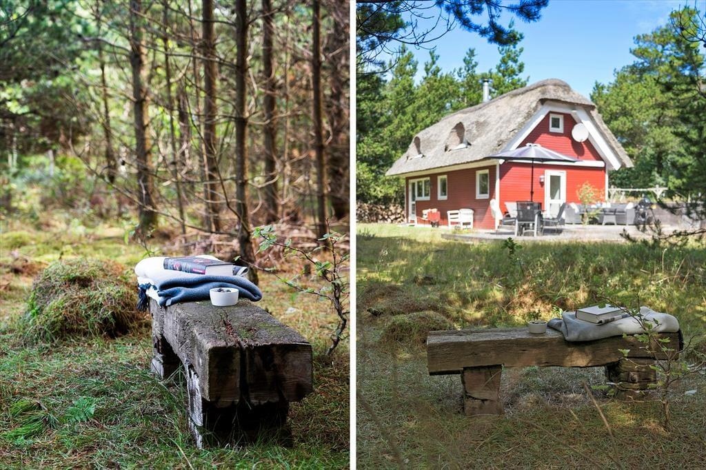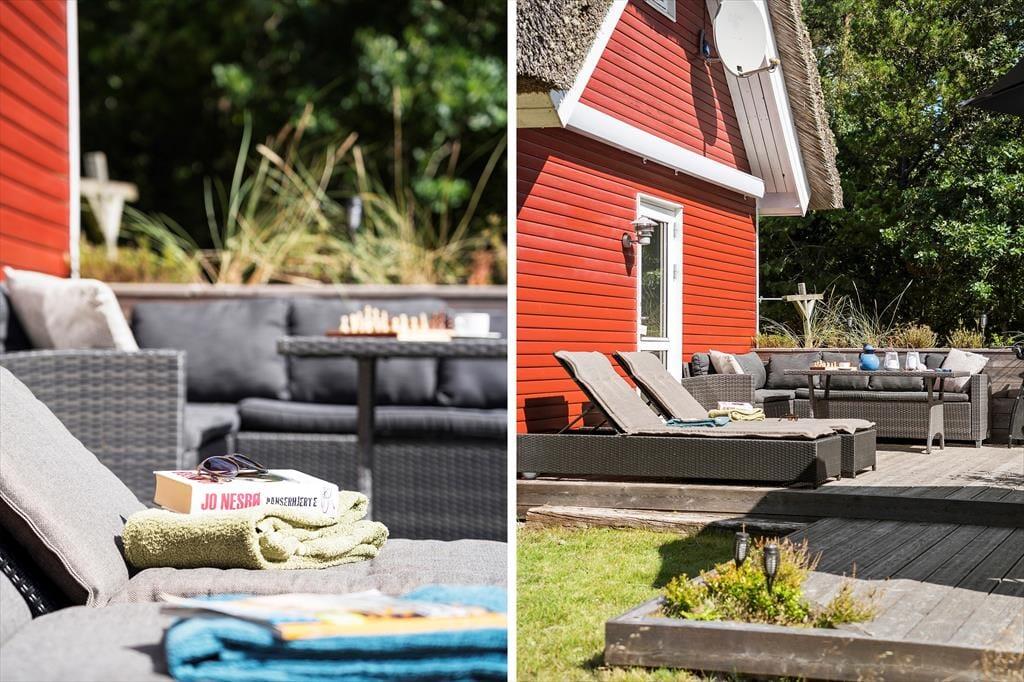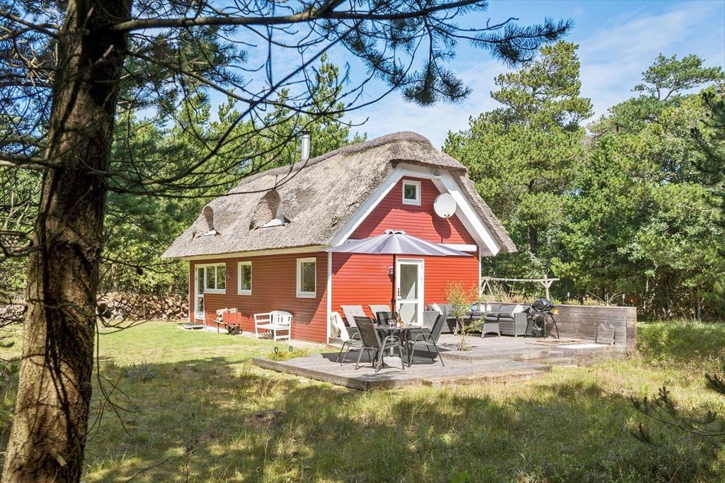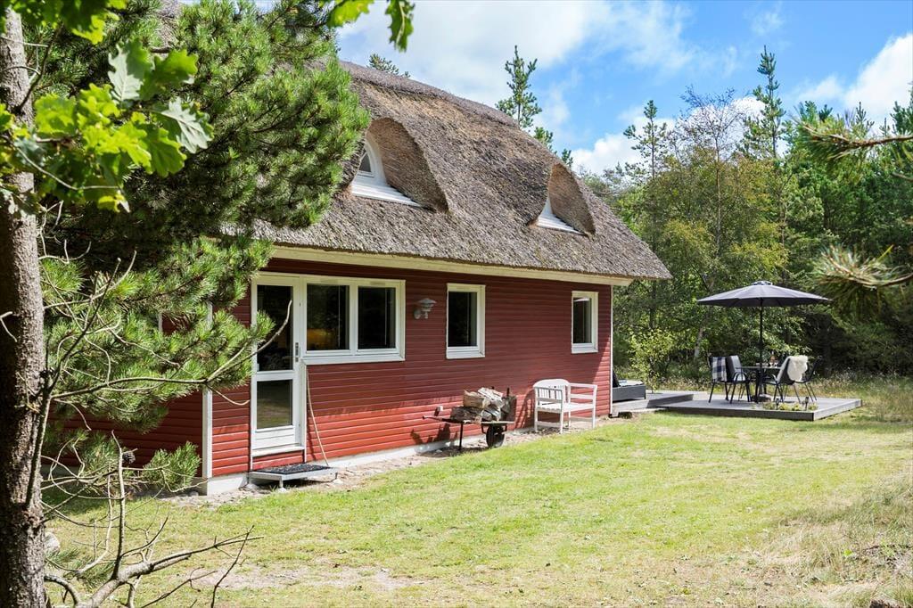 Flot rødt-hvidt stråtækt sommerhus på idyllisk og helt ugeneret beliggenhed i natursmukke Rødhus.