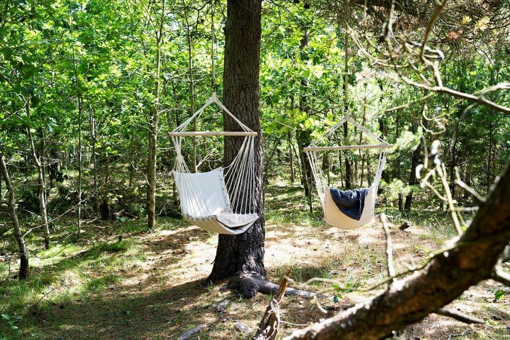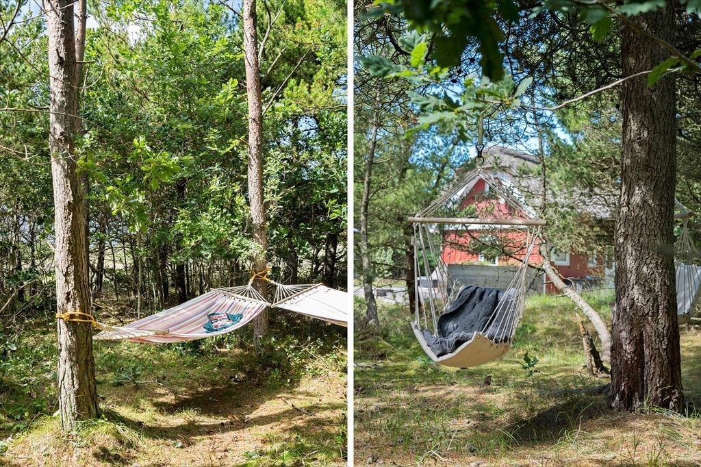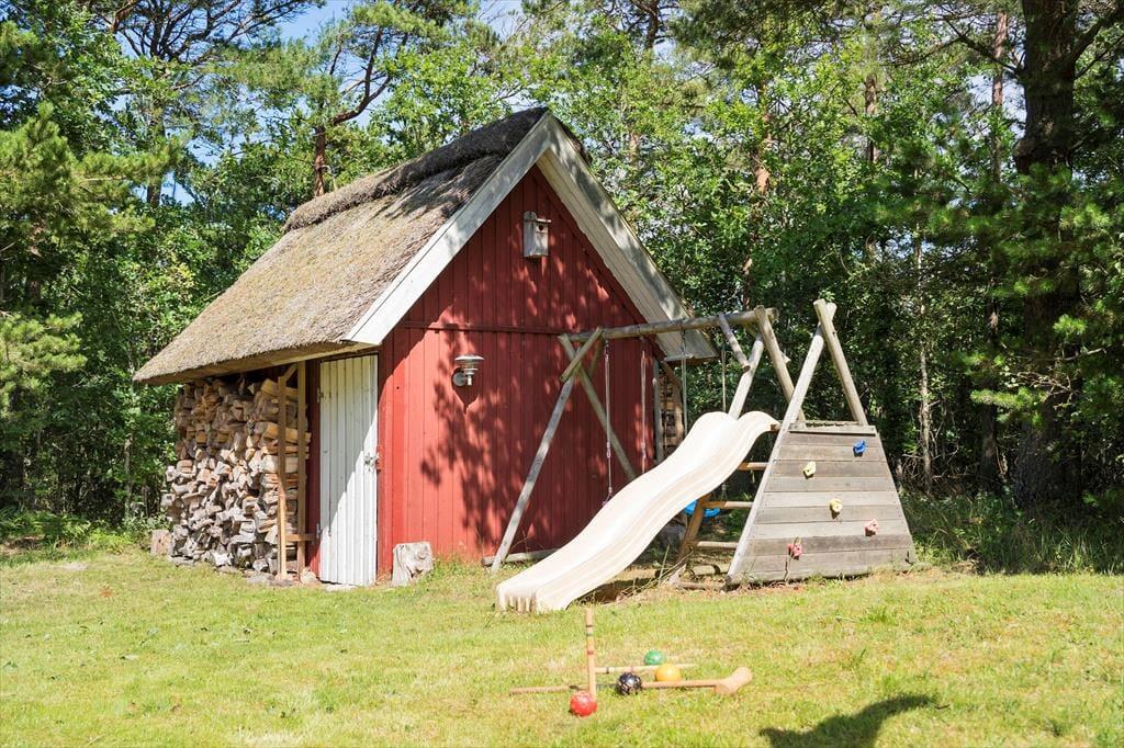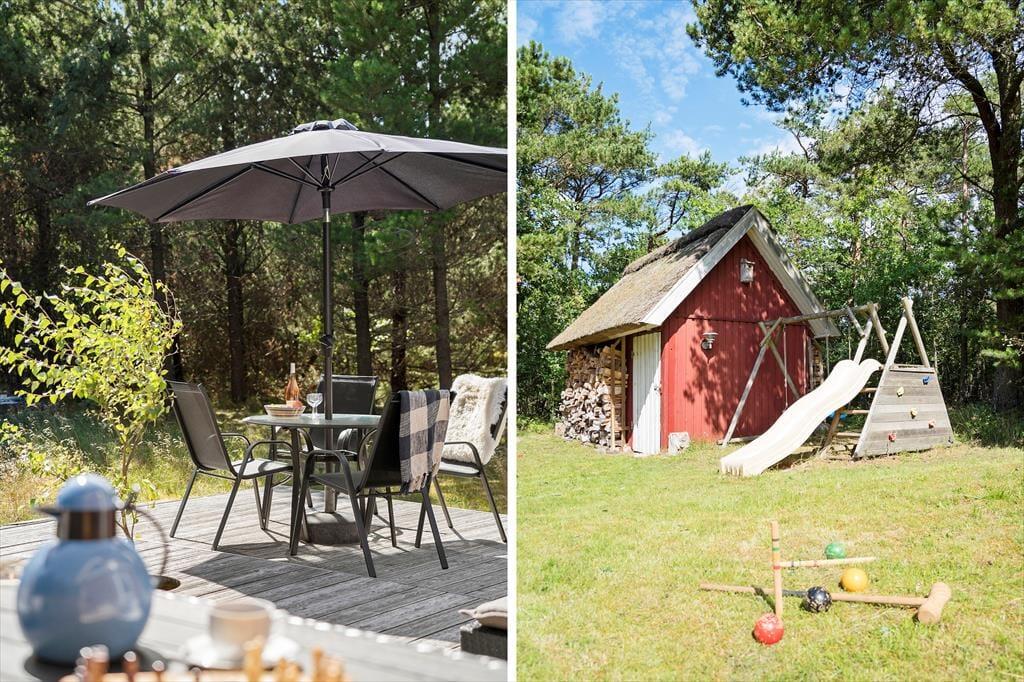 På den store naturgrund er der rigelig plads til afslapning og solbadning, og hvis I har børn med, kan de lege i sandkassen og spille bold på græsplænen. De høje træer, som omgiver grunden giver både god læ for vinden og ro og fred for naboer og forbipasserende; I kan færdes helt ugeneret her. Der er adgang til haven fra både stuen og køkkenet, og fra soveværelset kan I træde ud på en dejlig og delvist indhegnet træterrasse. Alle muligheder for mange skønne udetimer er til stede her!