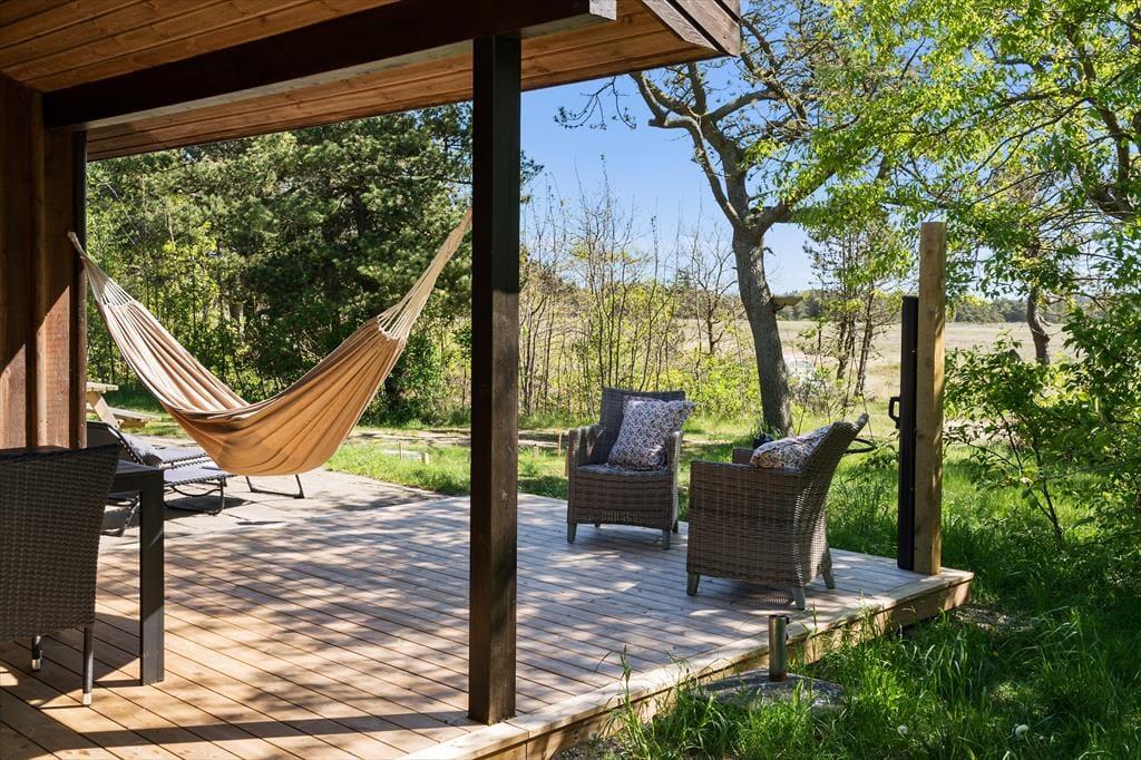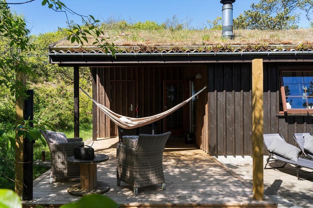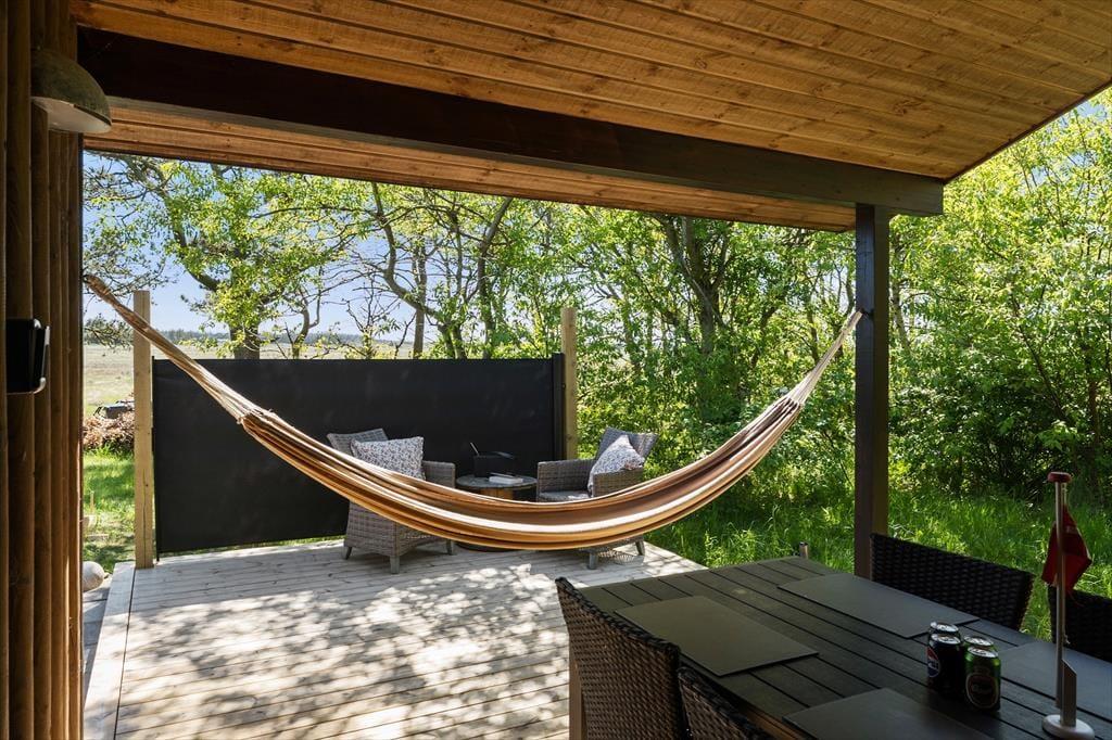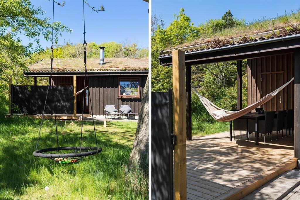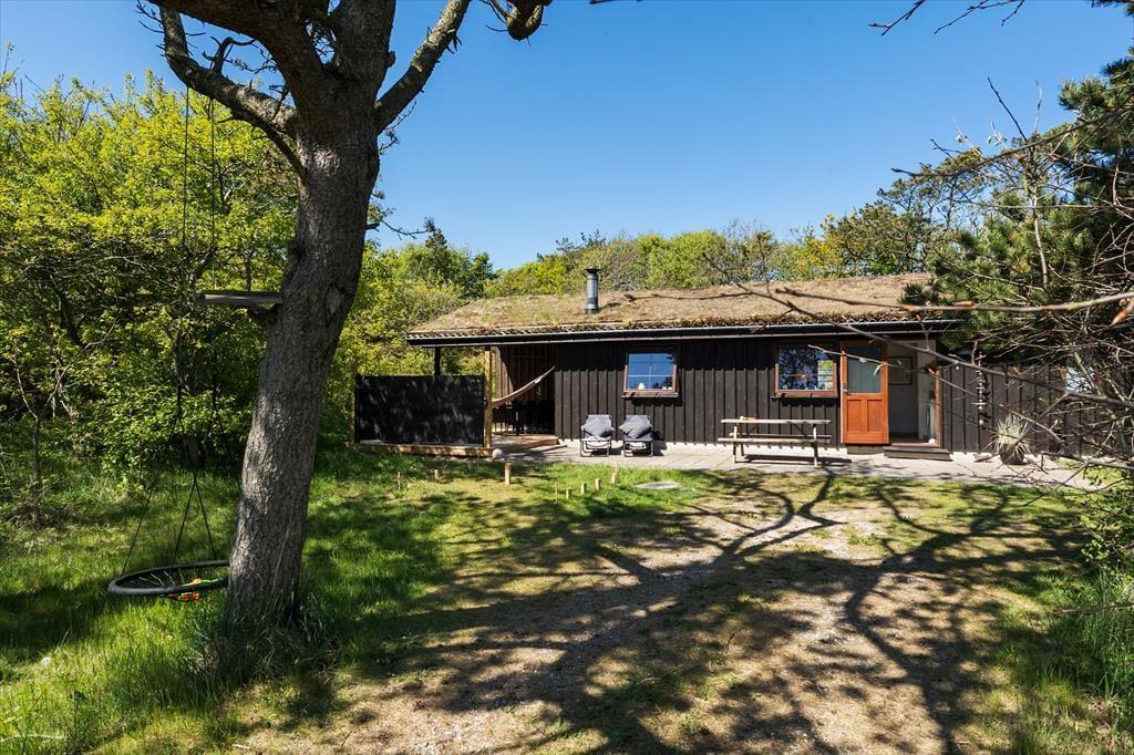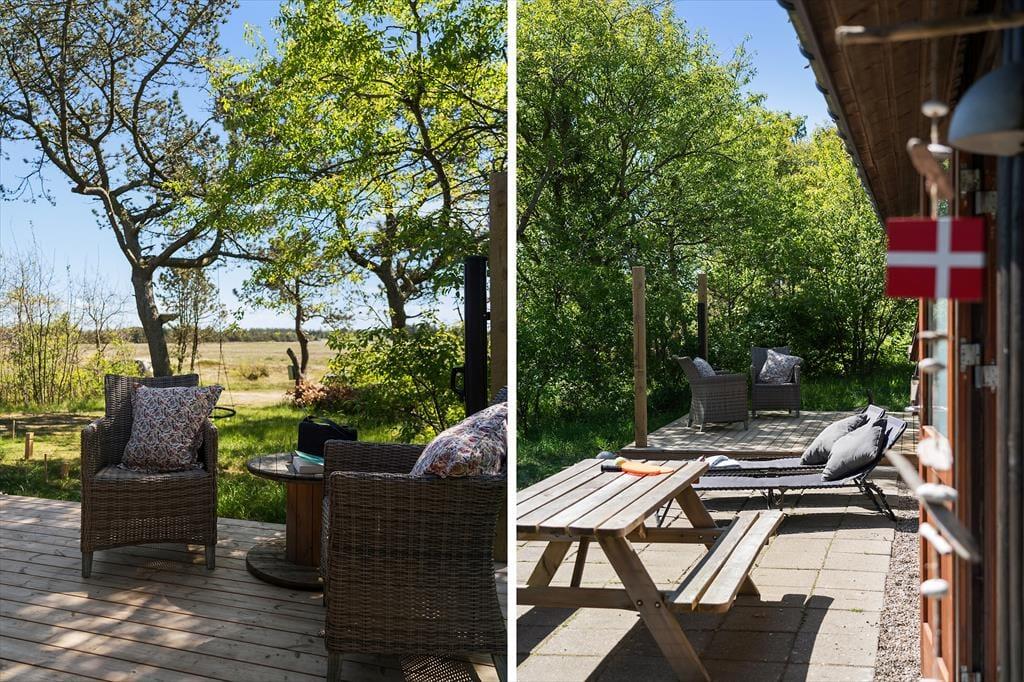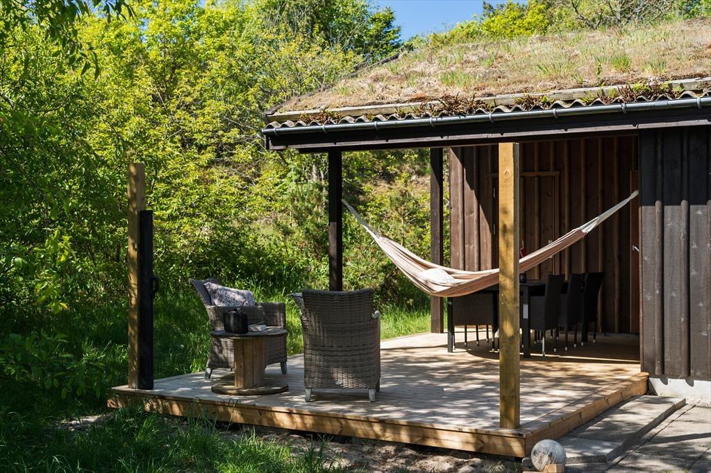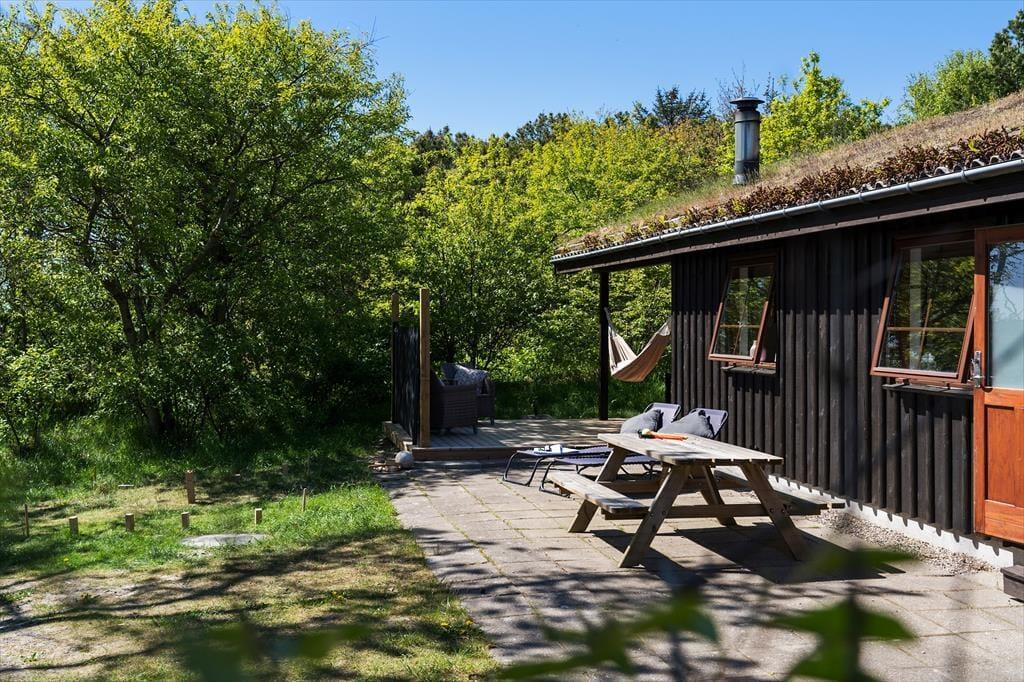 På den store naturgrund er der gode muligheder for børnene til at lege og spille bold, og de store træer rundt om sommerhuset giver god læ for vinden. Den danske sommer og de mange soltimer kan nydes fra terrassen, og aftenen kan forlænges et par timer under den overdækkede del.