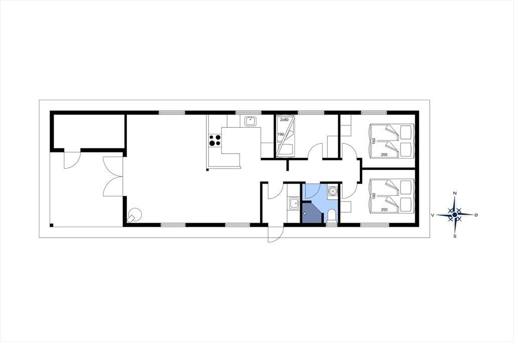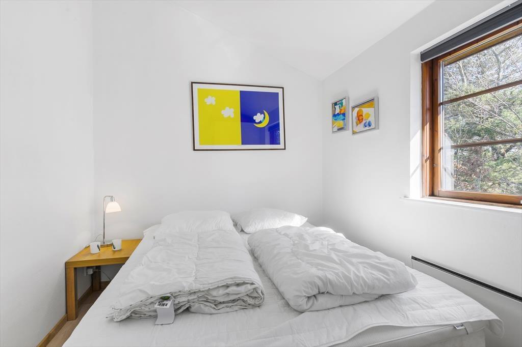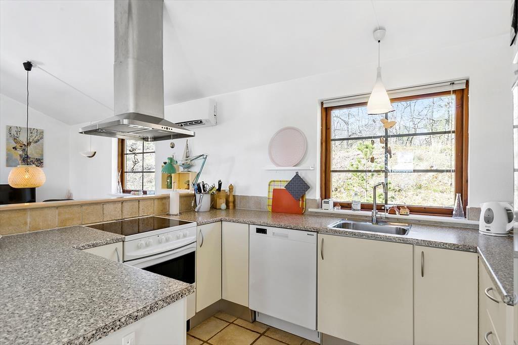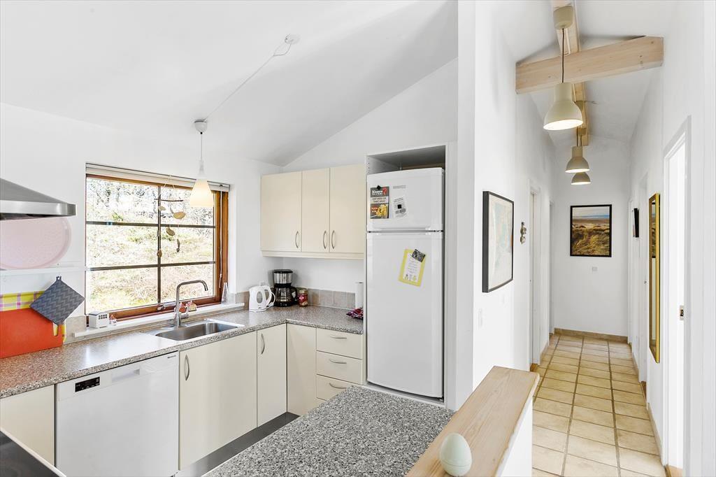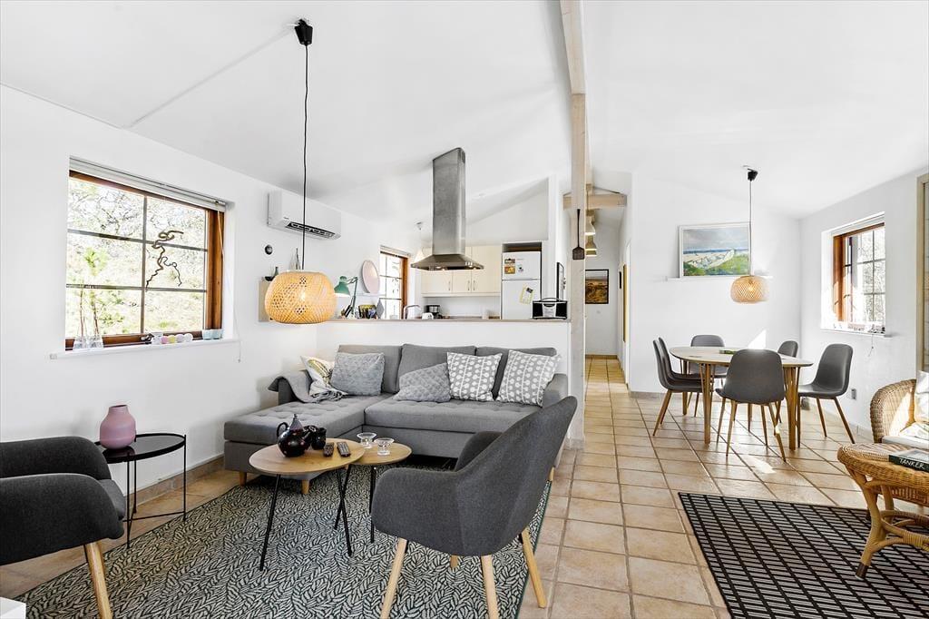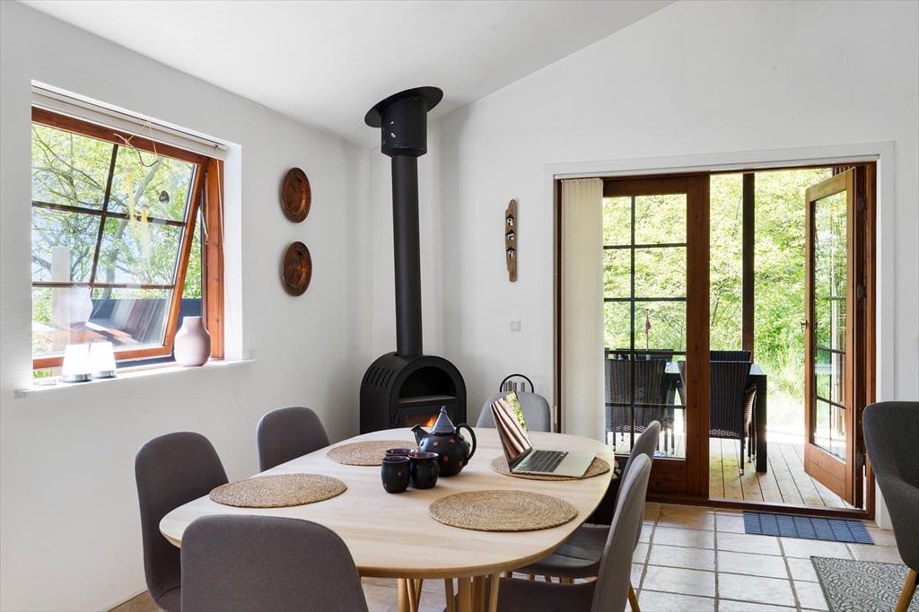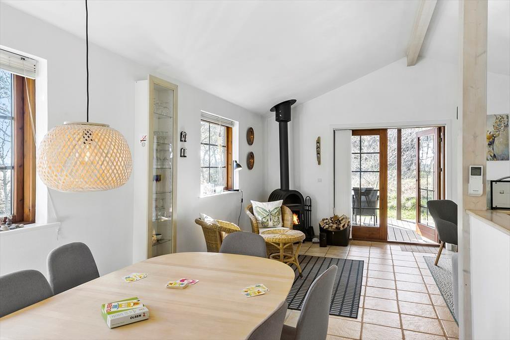 Sommerhuset er flot og godt vedligeholdt og indrettet i en gennemført stil med gode kvalitetsmøbler, et flot klinkegulv og en sikker sans for at skabe en hyggelig og varm atmosfære. Til højre for entreen er husets tre værelser og badeværelset med bruser placeret, mens det store og åbne køkken-alrum med spiseplads og stue ligger til venstre. En meget praktisk fordeling af rummene, hvis man har børn med på ferien, som stadig har brug for at komme lidt tidligt i seng. I stuen kan man slappe af i sofaen eller lænestolene foran brændeovnen, og overalt kan man gå på det gratis og trådløse internet, hvis man har brug for at tjekke mails eller børnene gerne vil se en film på en regnvejrsdag. Virkeligt gode rammer for en dejlig ferie med hele familien.
