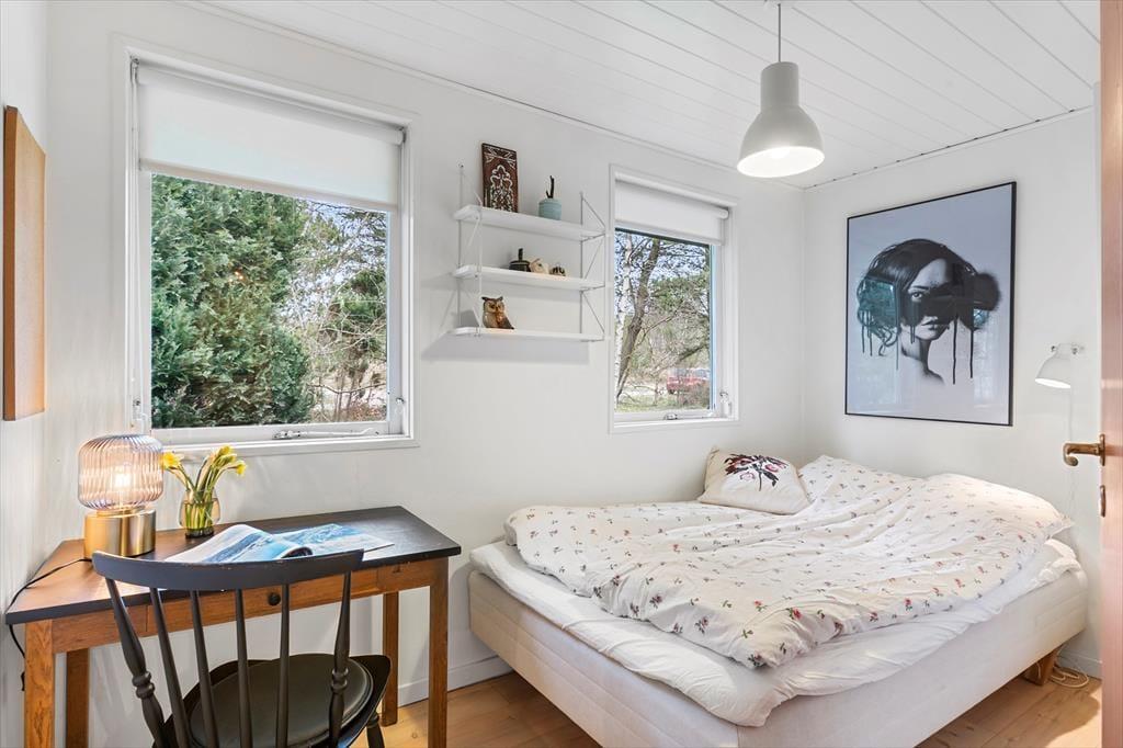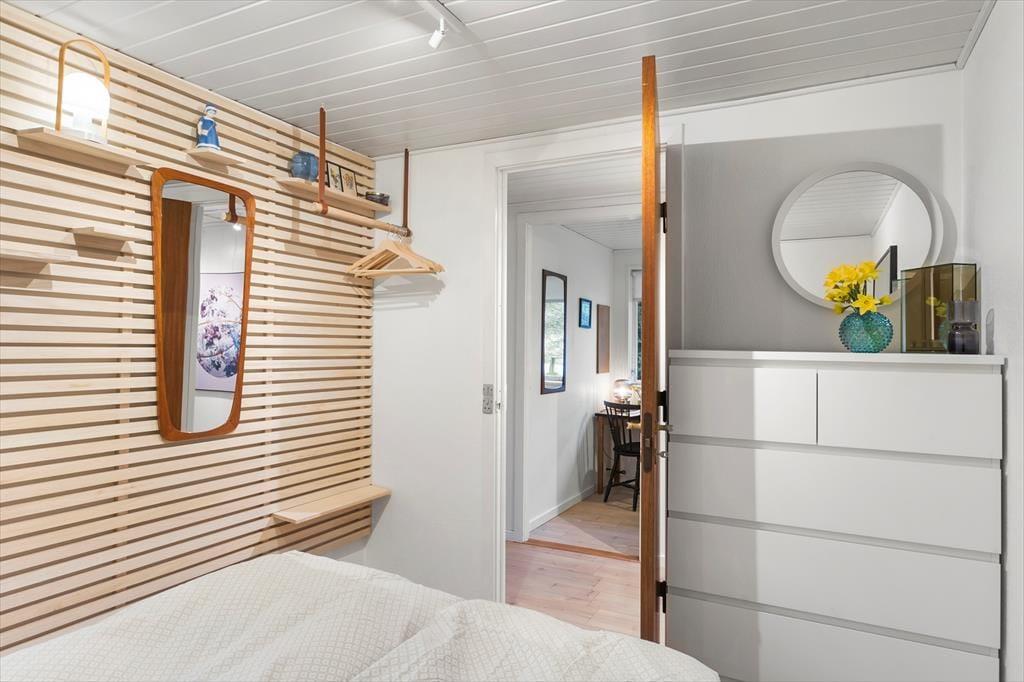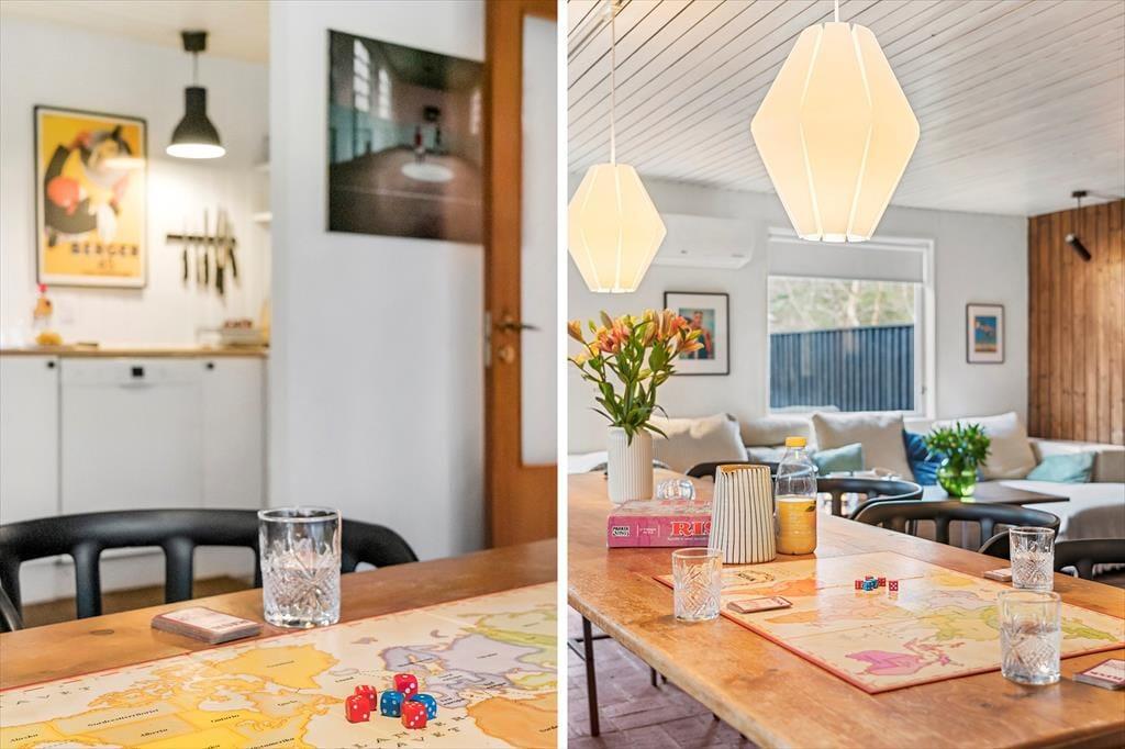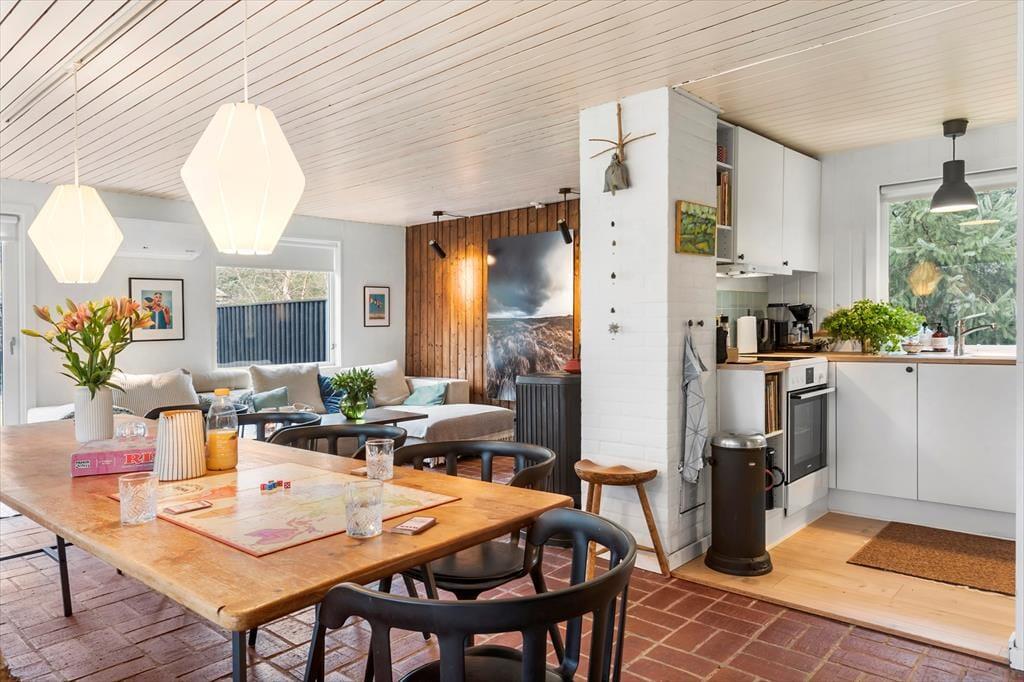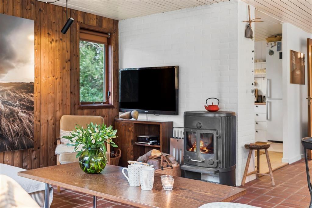 Sommerhuset er indrettet i en let romantisk stil med mange charmerende detaljer og en stor og gennemgående grad af hygge. Værelserne ligger meget praktisk for sig selv i den ene ende af sommerhuset, her er plads til syv overnattende gæster, og det er også i denne del af huset, man finder badeværelset med bruser og vaskemaskine. Køkkenet ligger midt i sommerhuset og har direkte adgang til den lange spiseplads med stole og bænk langs vinduet, også anvendeligt til brætspil, tegnerier og andre hyggelige indendørs aktiviteter. I forlængelse heraf finder man stuen med sofa, brændeovn og tv; en rigtig hule til fælles afslapning for hele familien. Desuden er her installeret trådløst internet, så medbring gerne tablet og pc.