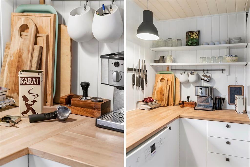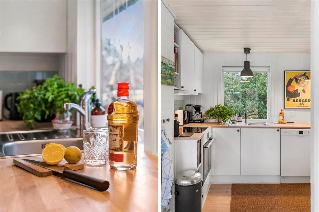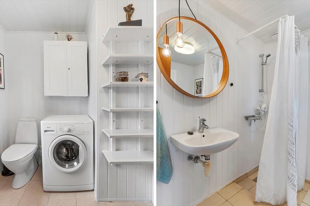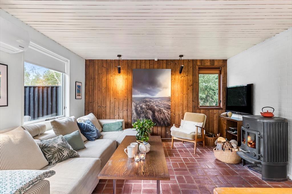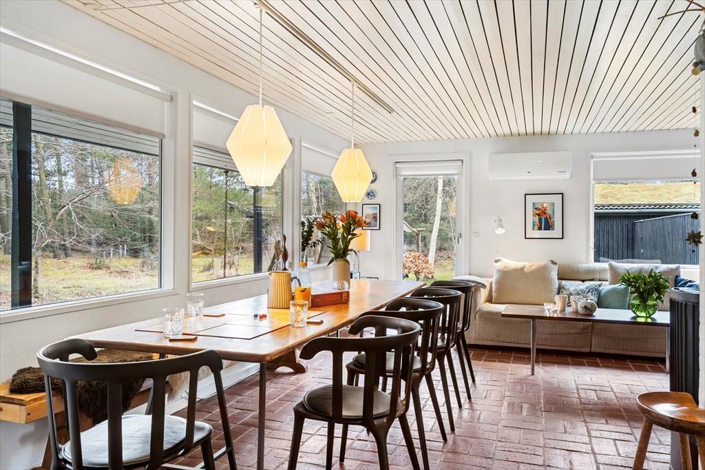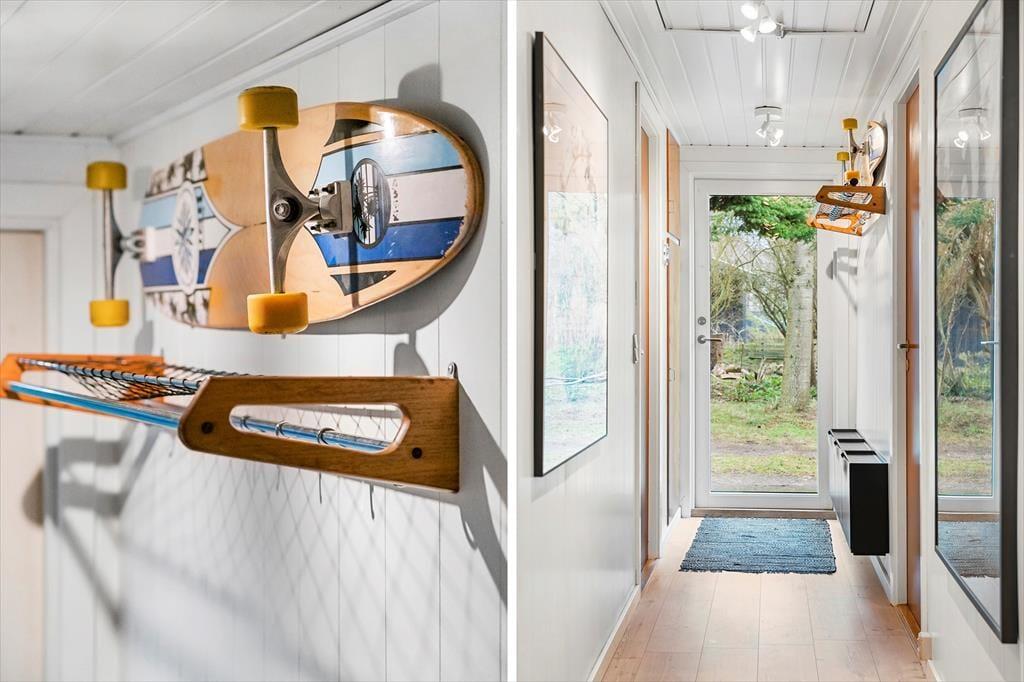 Sommerhuset er indrettet i en let romantisk stil med mange charmerende detaljer og en stor og gennemgående grad af hygge. Værelserne ligger meget praktisk for sig selv i den ene ende af sommerhuset, her er plads til syv overnattende gæster, og det er også i denne del af huset, man finder badeværelset med bruser og vaskemaskine. Køkkenet ligger midt i sommerhuset og har direkte adgang til den lange spiseplads med stole og bænk langs vinduet, også anvendeligt til brætspil, tegnerier og andre hyggelige indendørs aktiviteter. I forlængelse heraf finder man stuen med sofa, brændeovn og tv; en rigtig hule til fælles afslapning for hele familien. Desuden er her installeret trådløst internet, så medbring gerne tablet og pc.